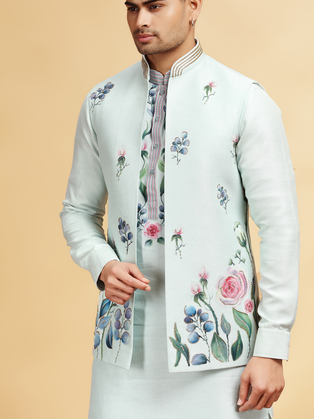 This mint blue silk waistcoat set showcases hand-printed finesse with glimmering cutdana, bead, and sequin adornments. The sleeveless waistcoat with a structured chinese collar and full-sleeve kurta breathes quiet royalty. Paired with tailored pants, it forms a poetic blend of art and grace.