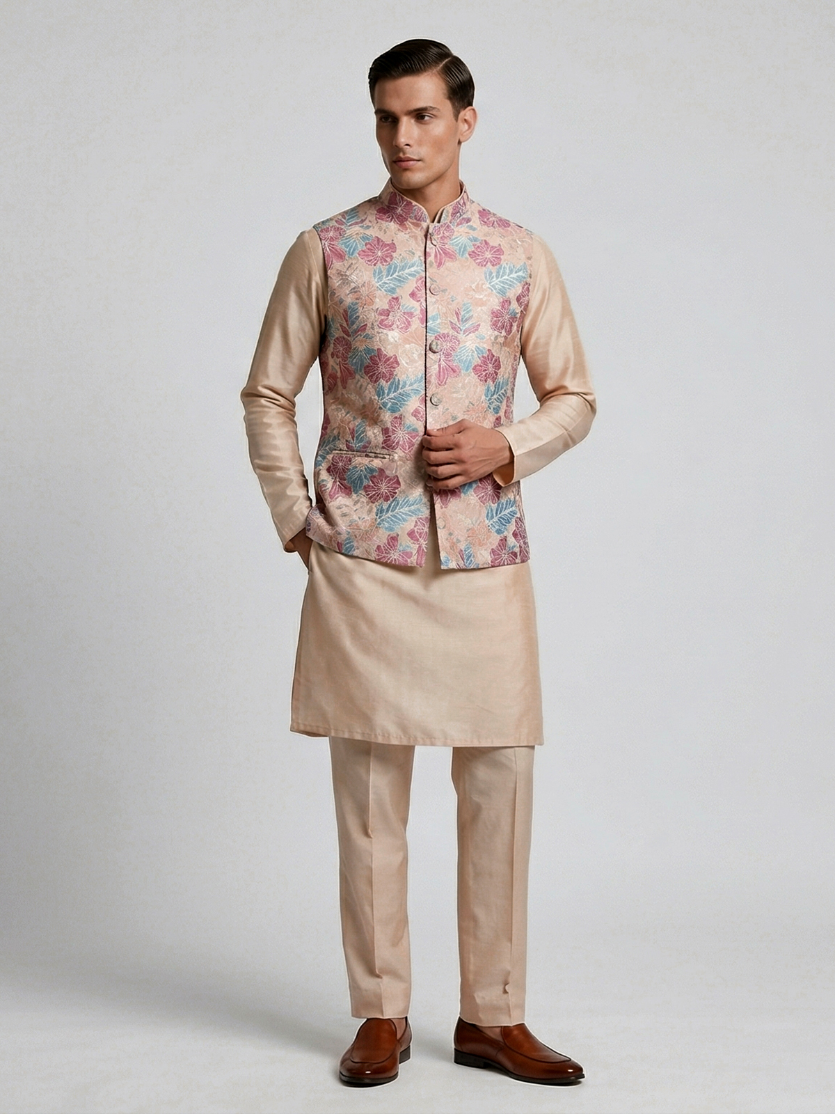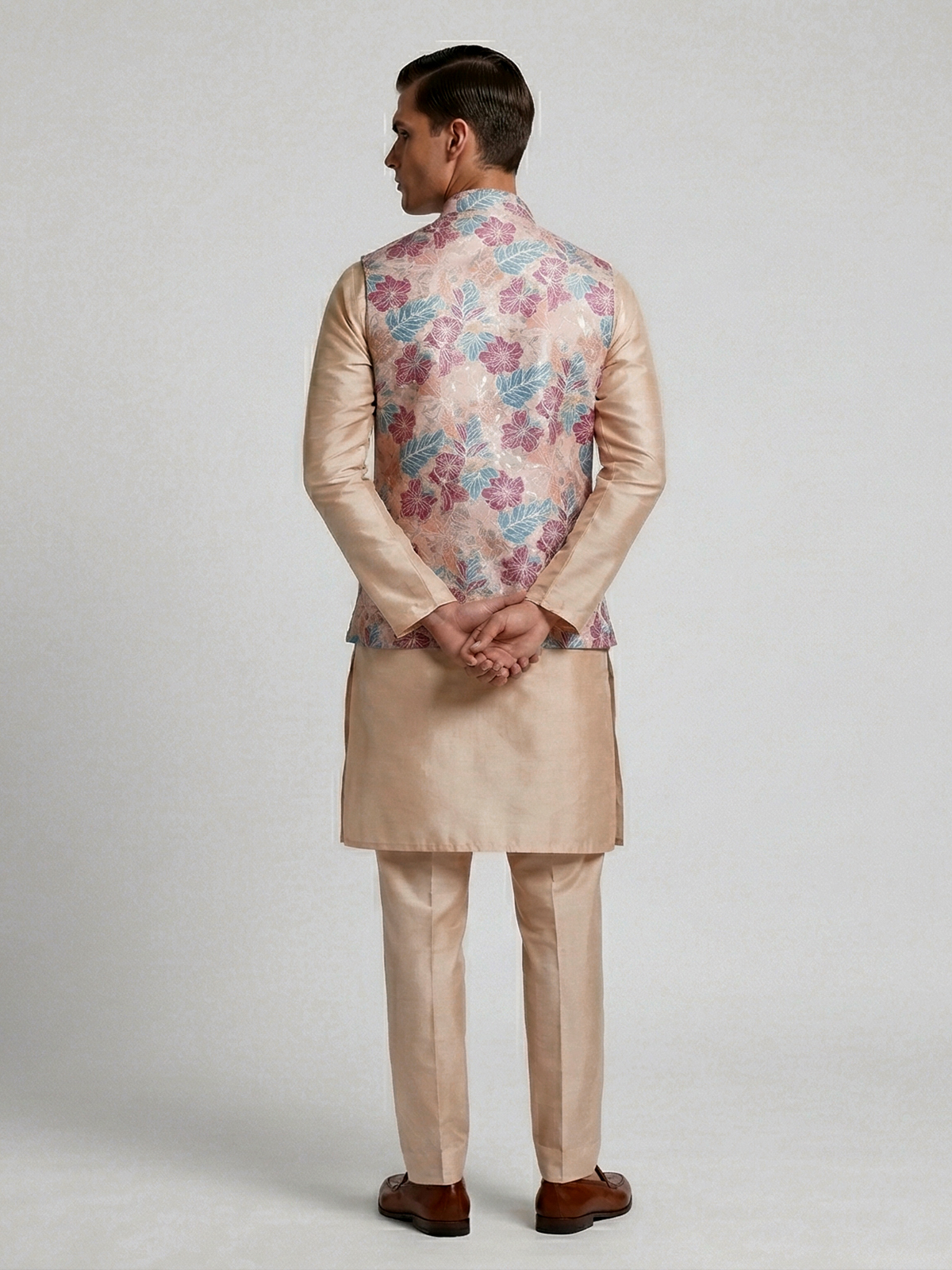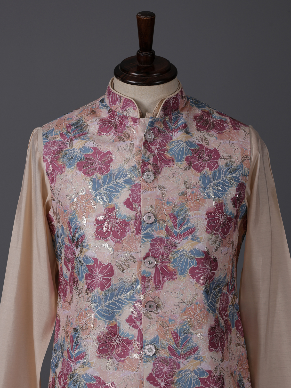 Vibrant multicolor patterns bring artistic charm to this silk waistcoat set crafted for festive occasions. Featuring floral prints with resham and sequin detailing. It reflects lively elegance and cultural richness. The chinese collar enhances its structured silhouette. While the soft fabric ensures comfort. Paired with a kurta and pants. This ensemble creates a bold yet graceful statement for weddings and celebrations.