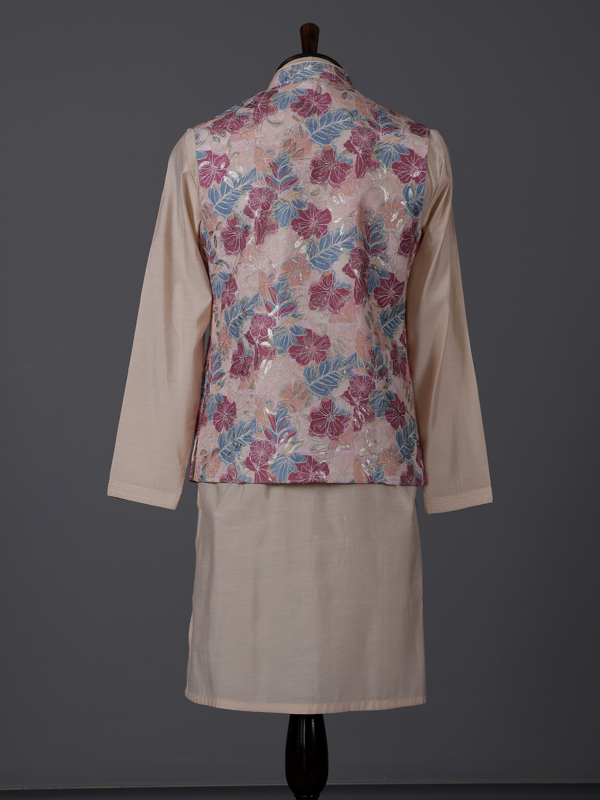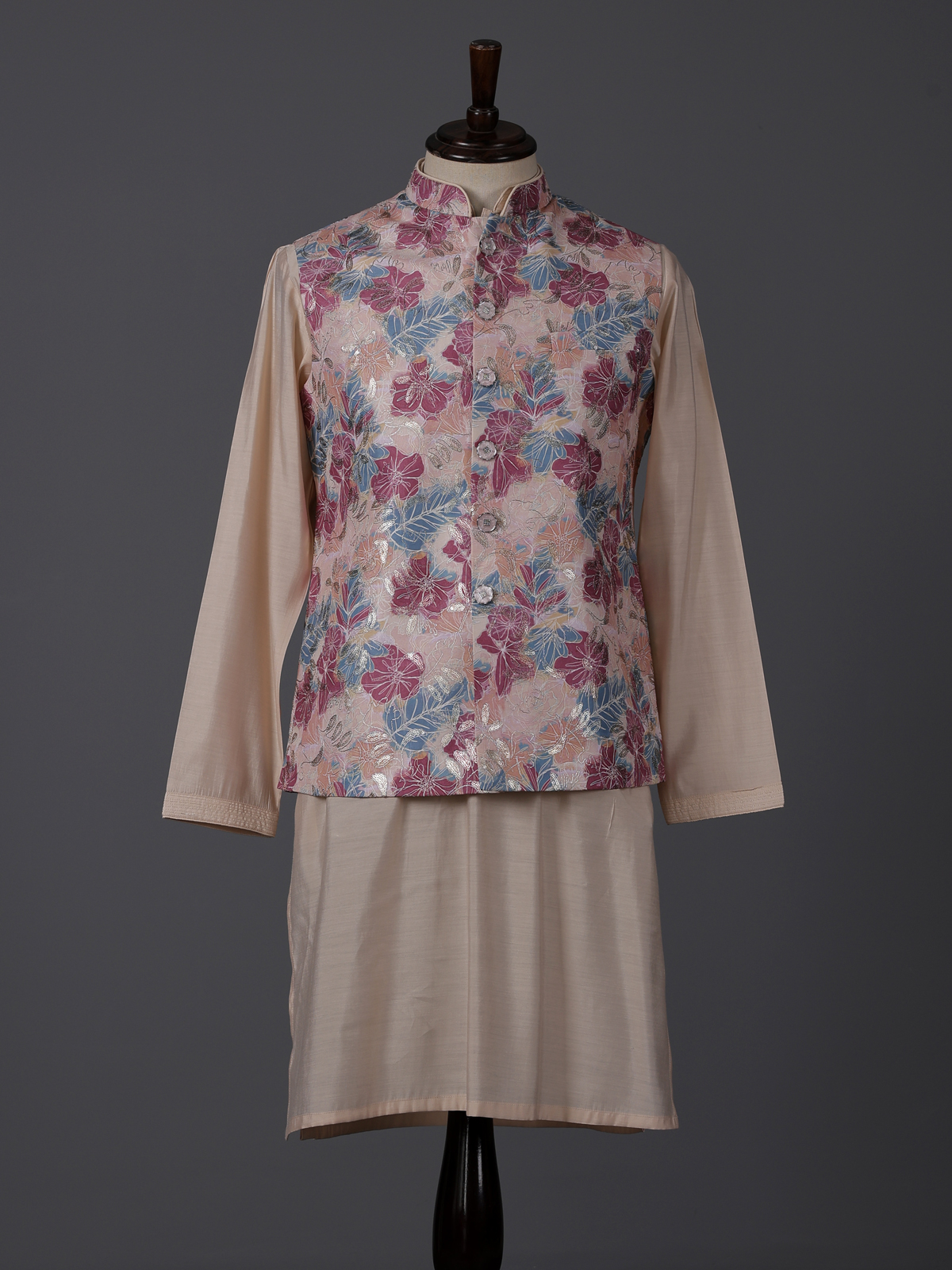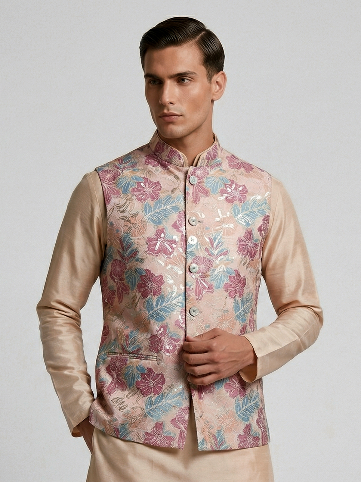 Vibrant multicolor patterns bring artistic charm to this silk waistcoat set crafted for festive occasions. Featuring floral prints with resham and sequin detailing. It reflects lively elegance and cultural richness. The chinese collar enhances its structured silhouette. While the soft fabric ensures comfort. Paired with a kurta and pants. This ensemble creates a bold yet graceful statement for weddings and celebrations.
