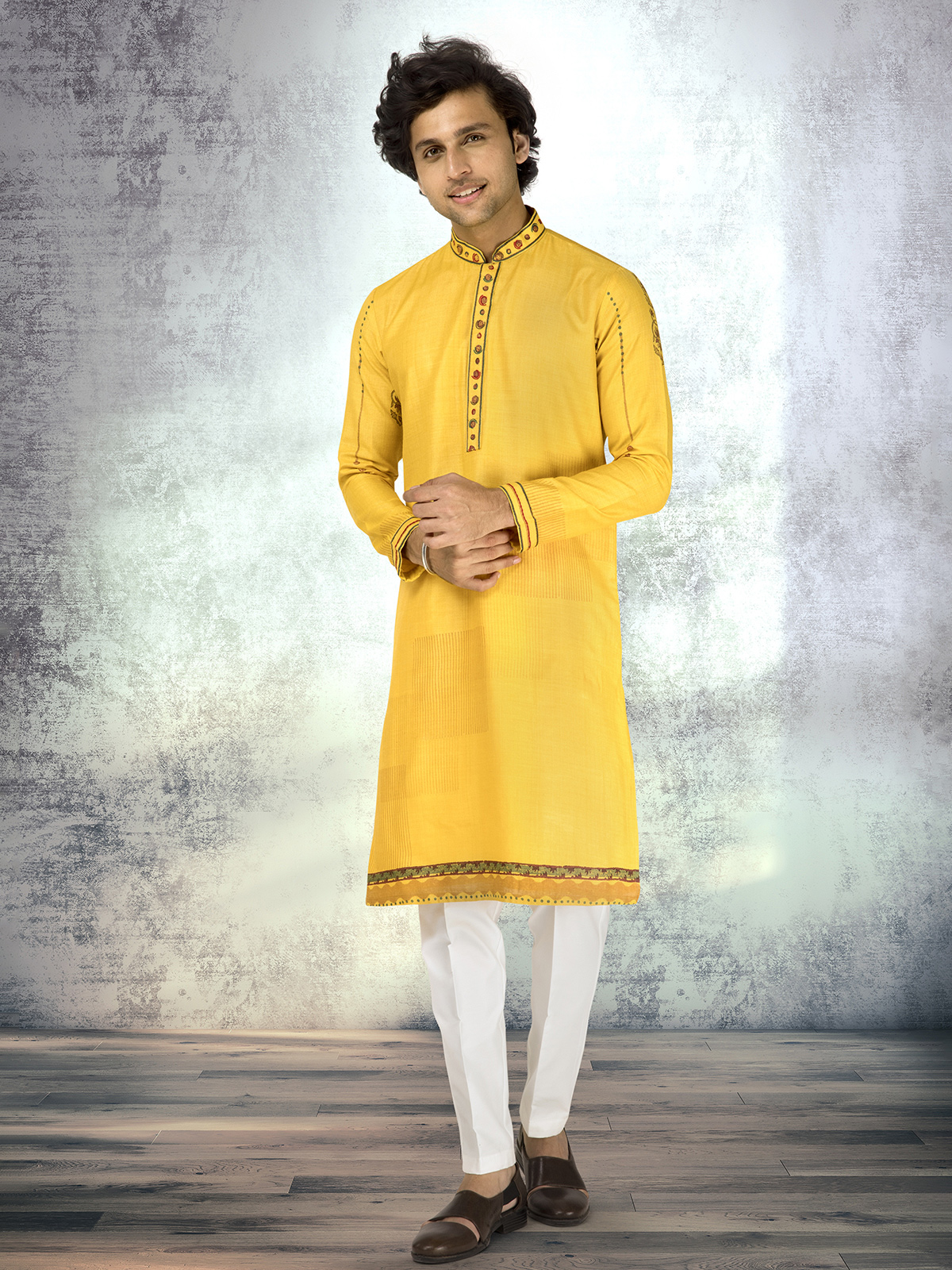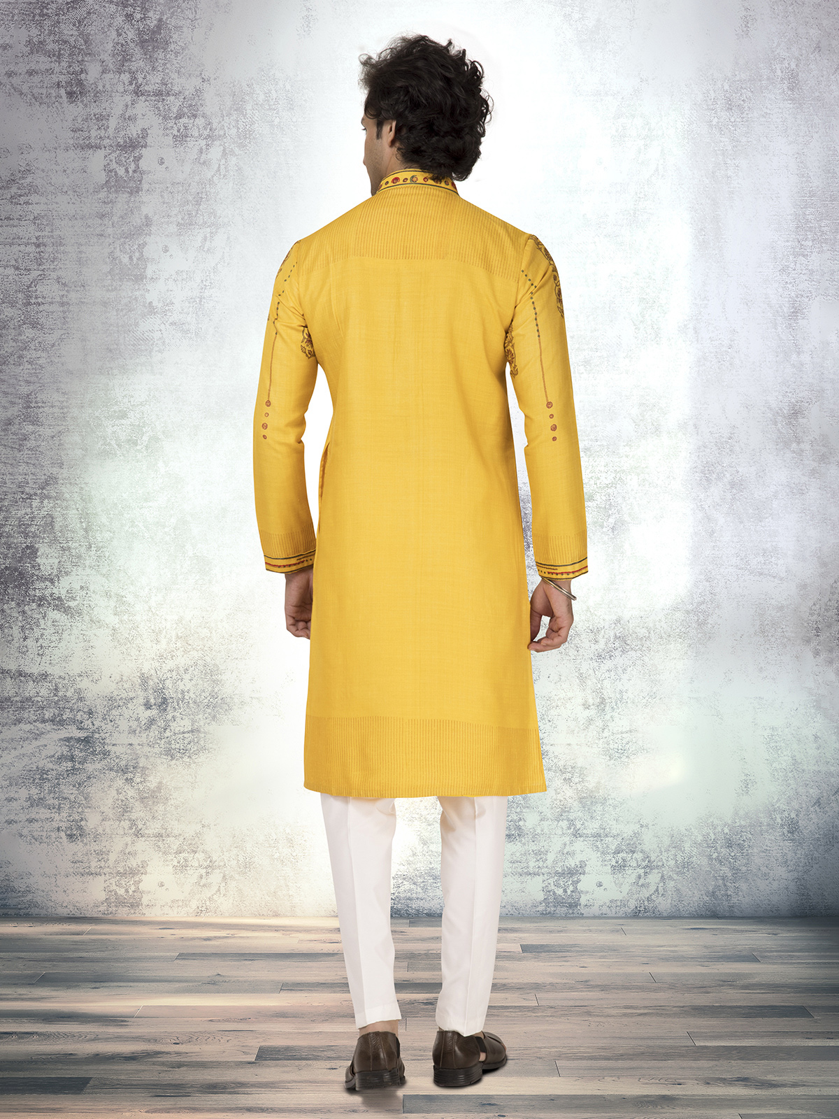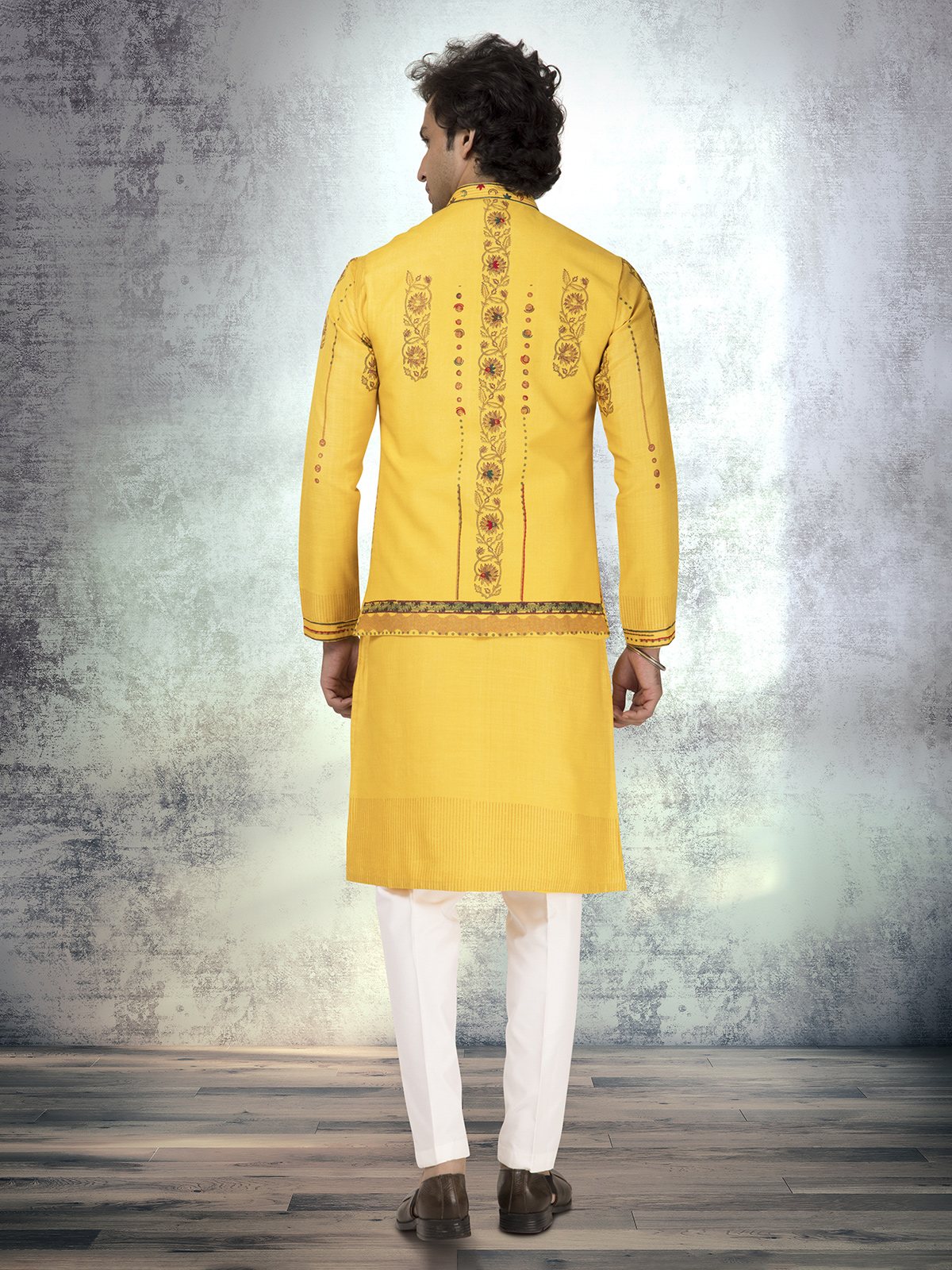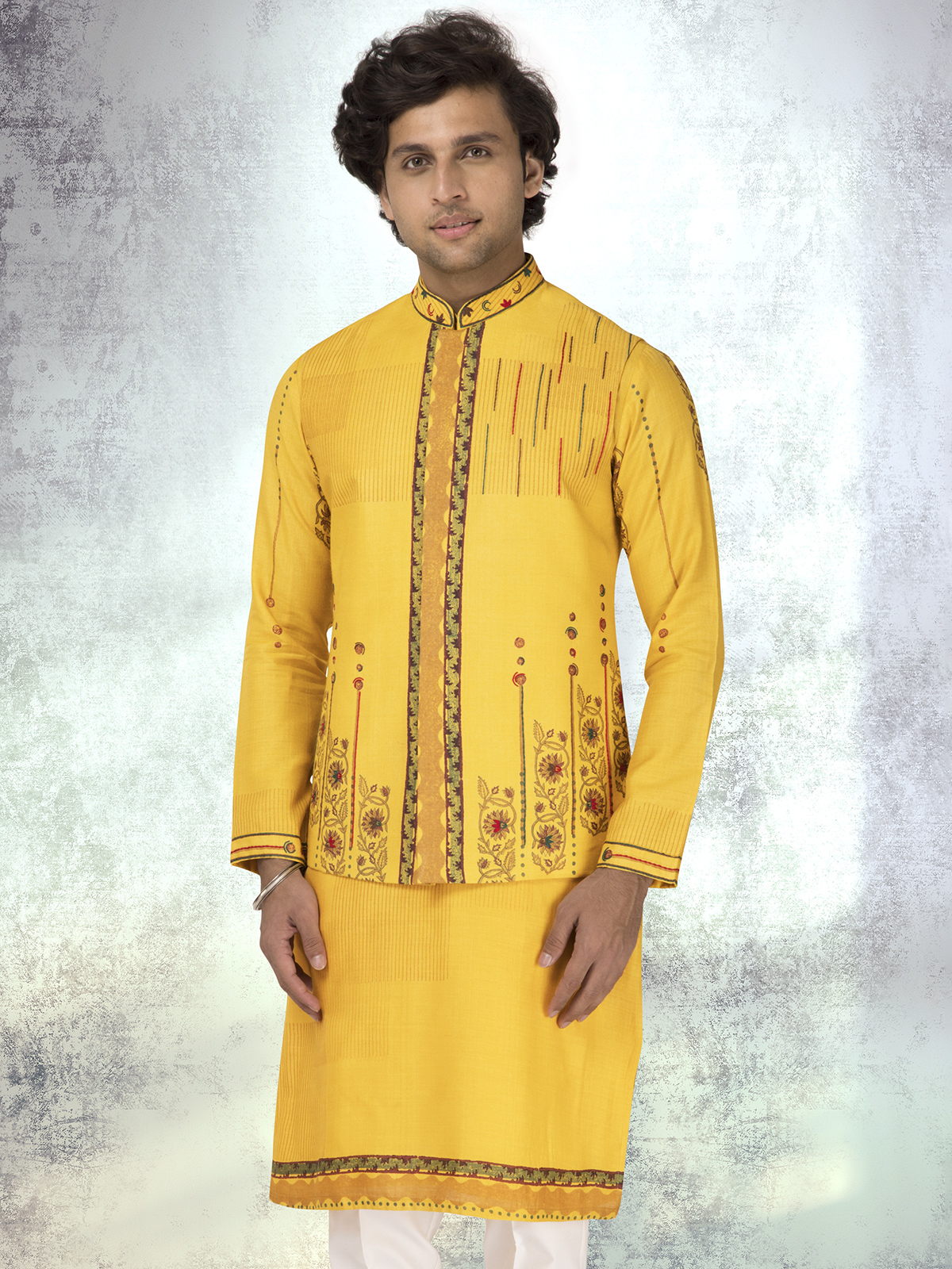 In radiant mustard munga silk, this waistcoat set unveils intricate block prints and refined craftsmanship. The festive hue makes it ideal for haldi and daytime celebrations. Worn with a pant, it glows with traditional warmth and royal charm.