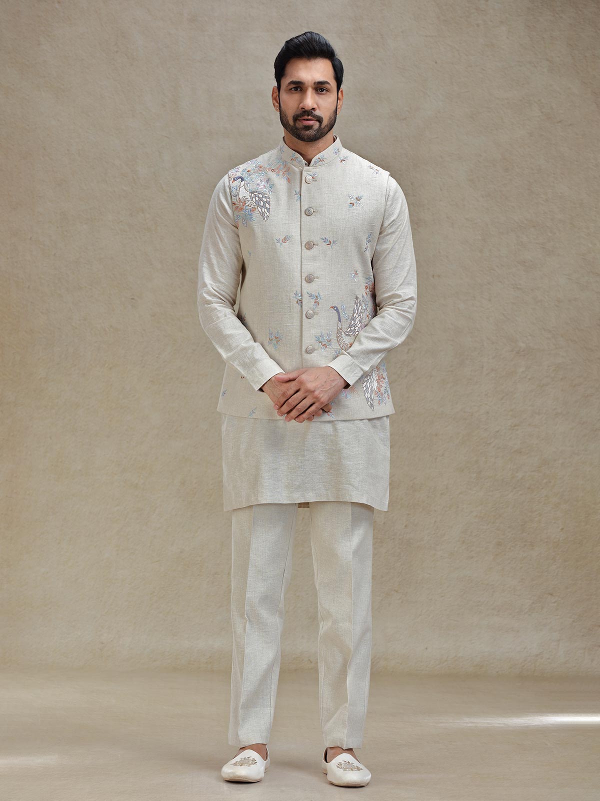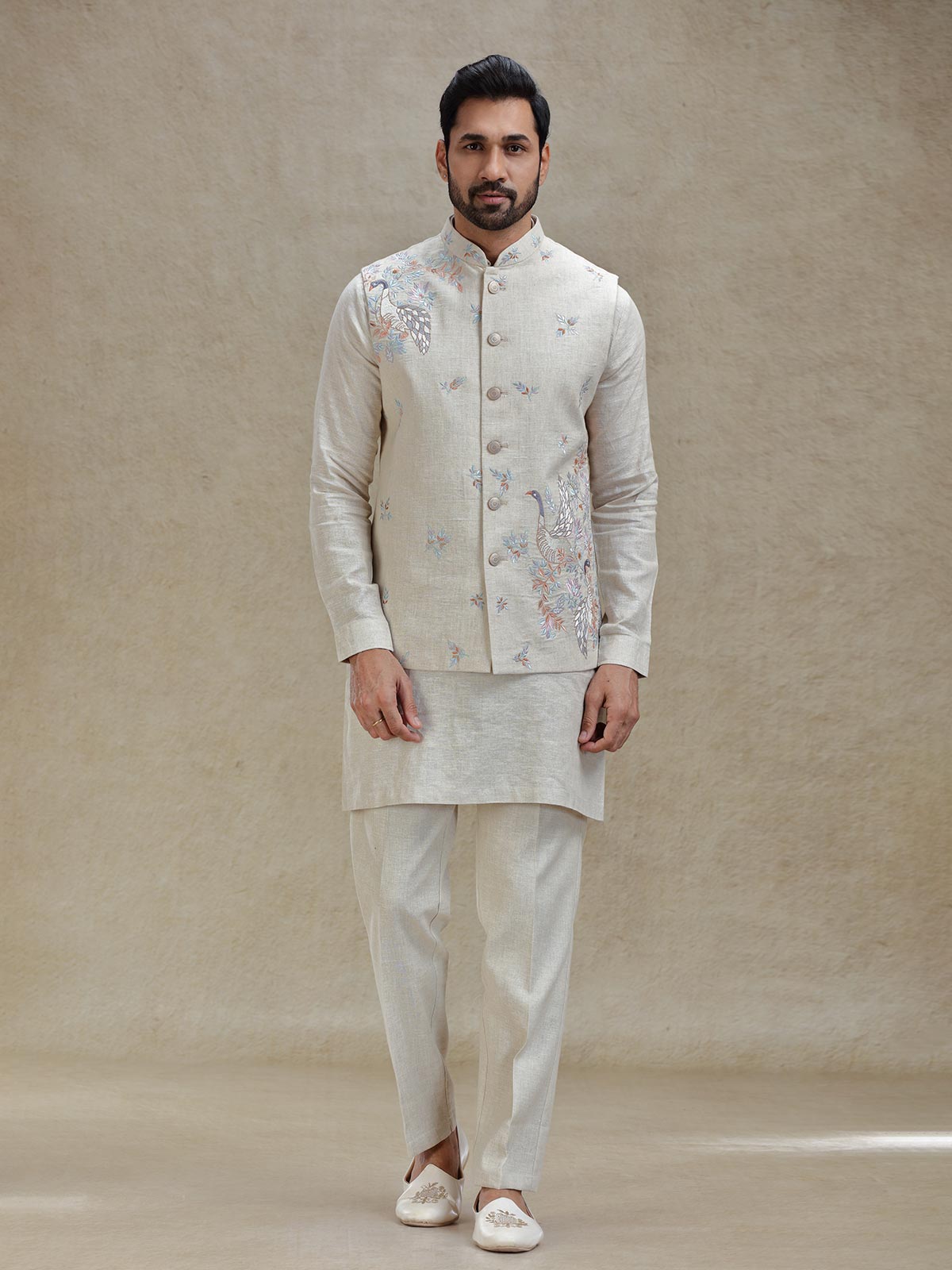 Natural Beige Linen Kurta Jacket Set In Embroidery For Men