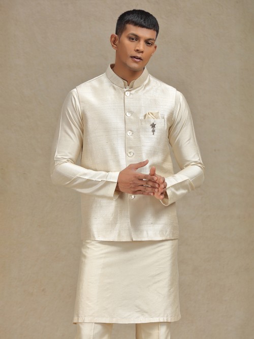 Elevate your wardrobe with this natural beige silk waistcoat set for men. Designed for weddings and festive celebrations, it combines timeless charm with contemporary flair. The mandarin collar adds a sharp, modern edge, and the matching trousers ensure a seamless and refined appearance.