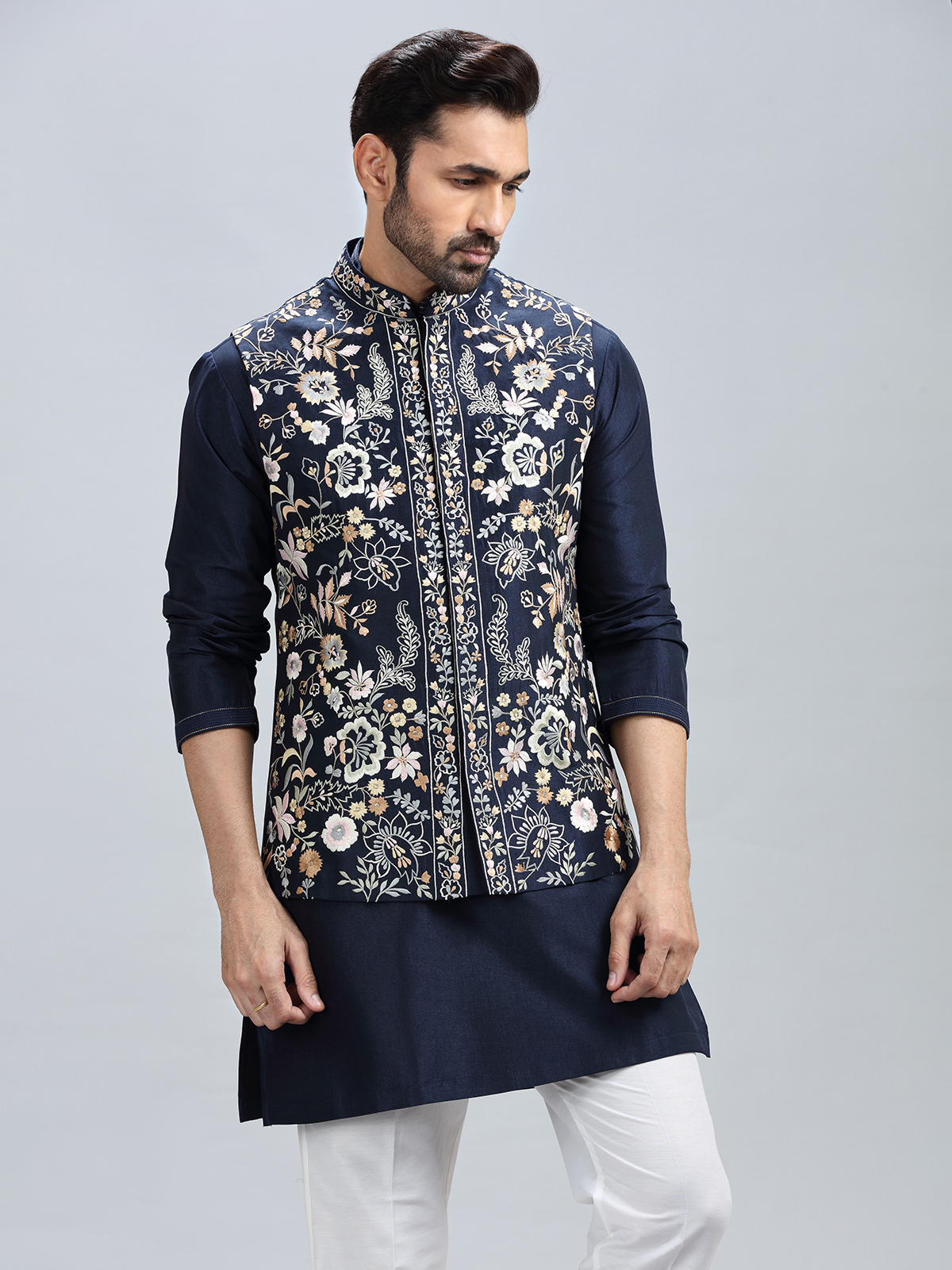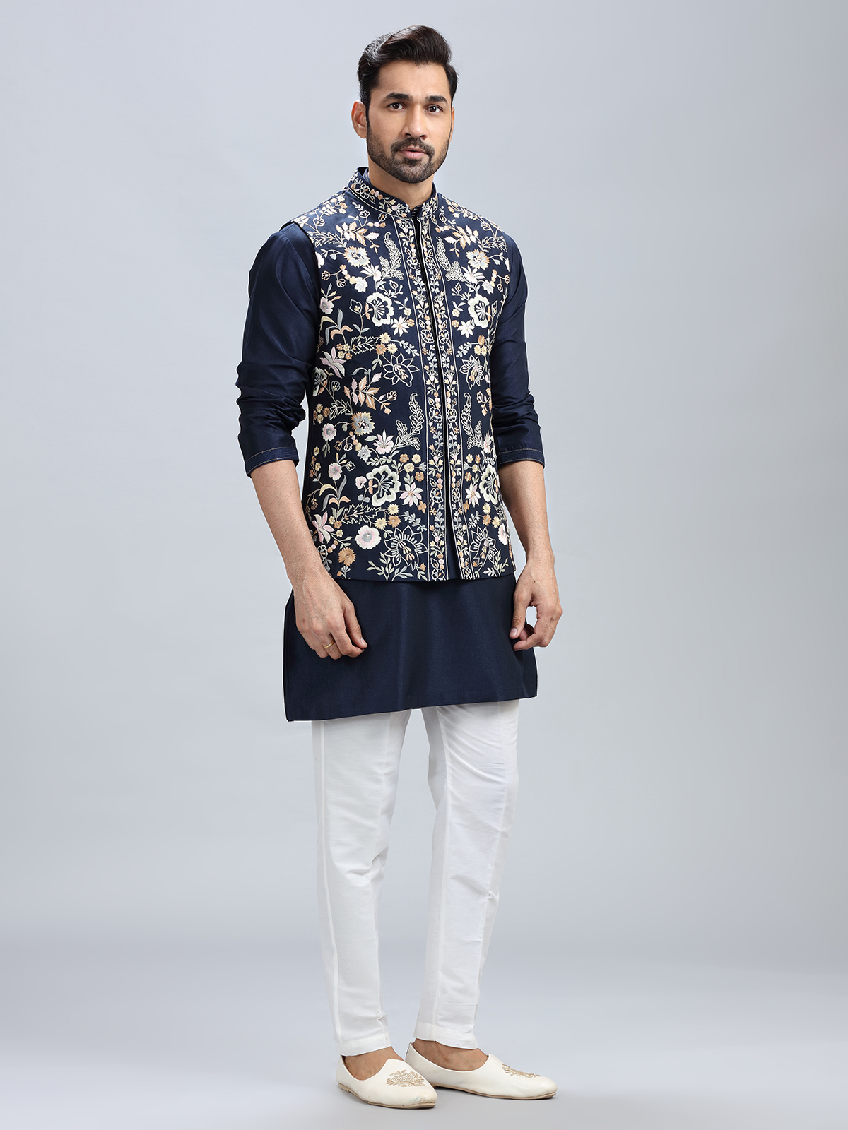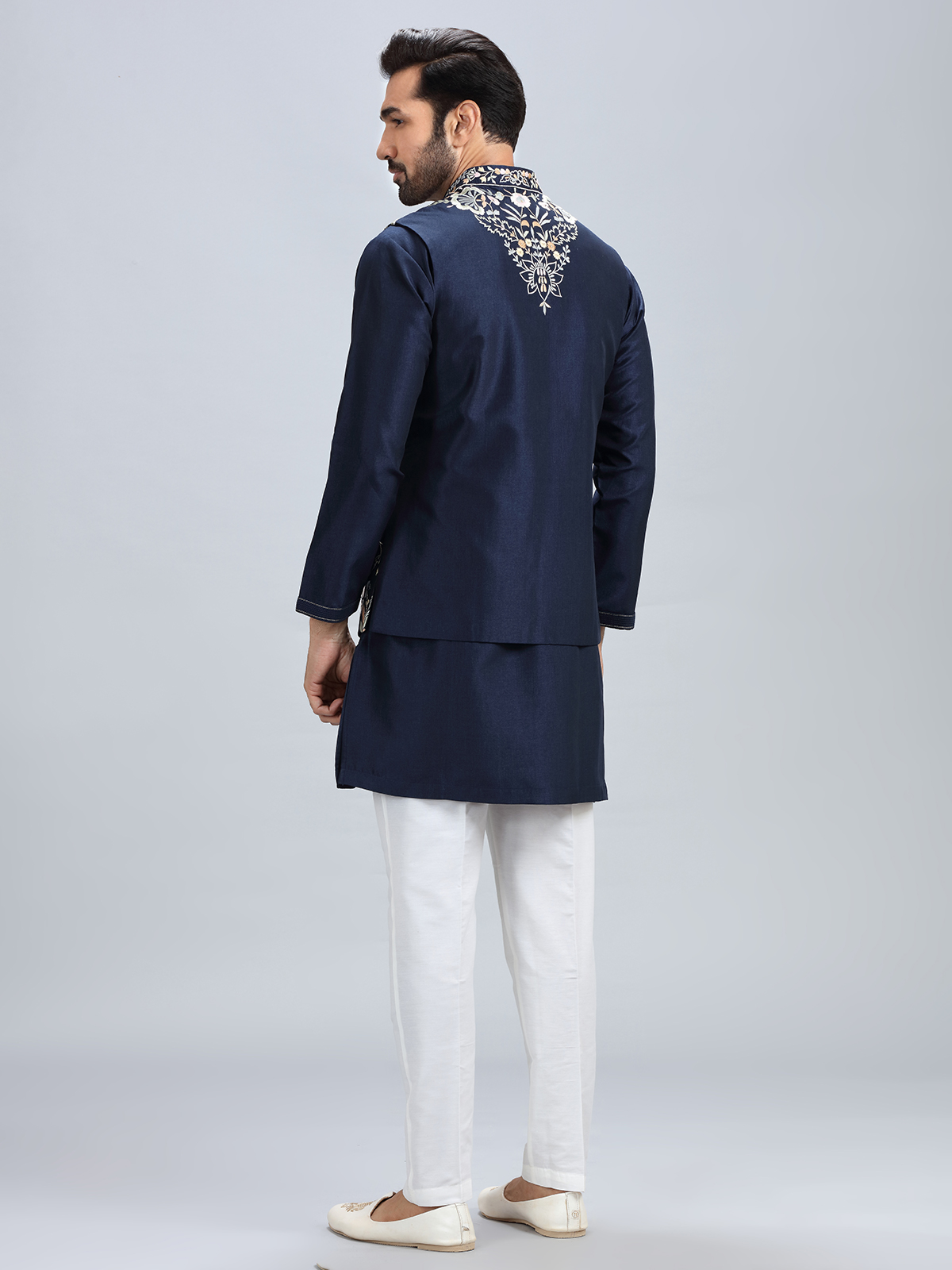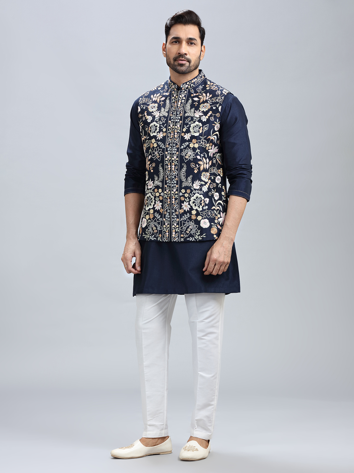 The timeless navy blue hue combined with delicate embroidery work highlights this cotton silk kurta jacket set. It comes with a matching bottom for a refined look.