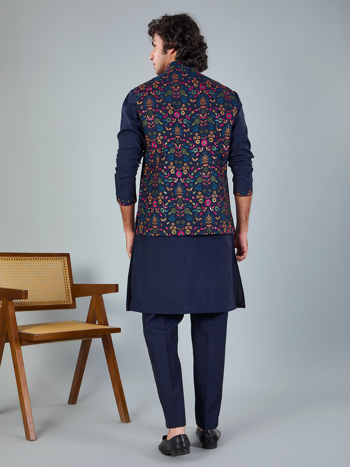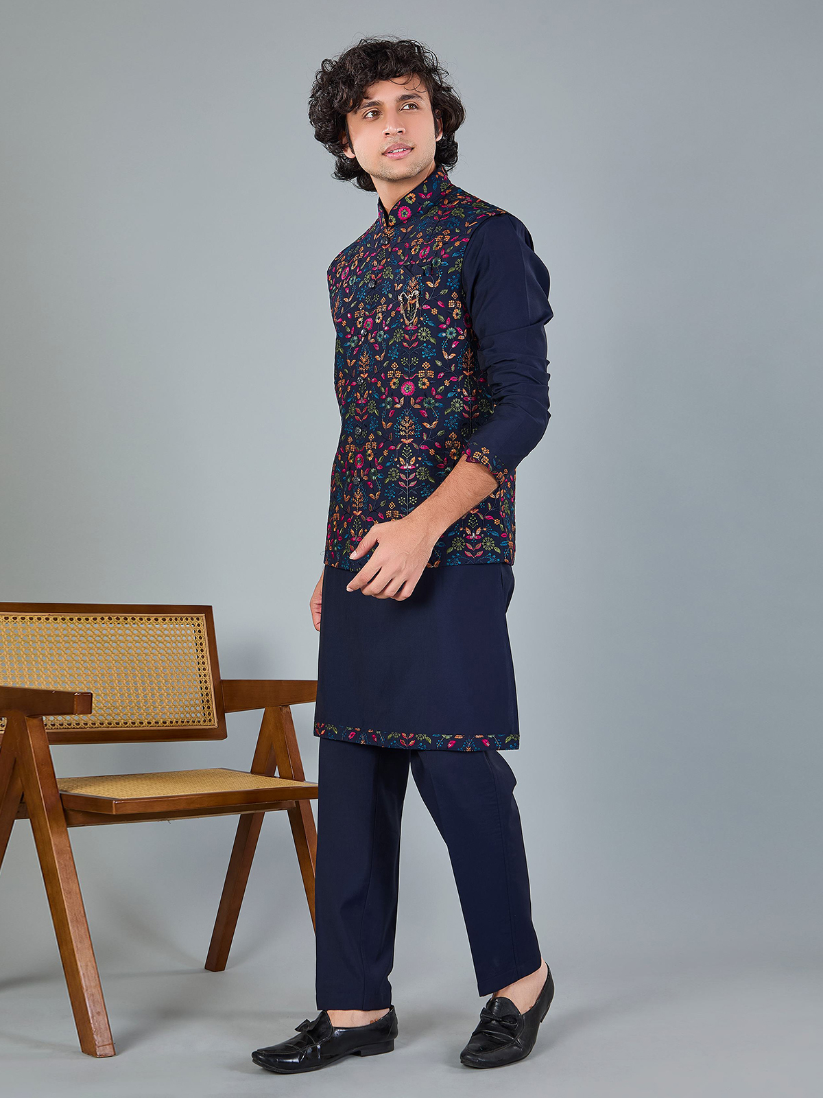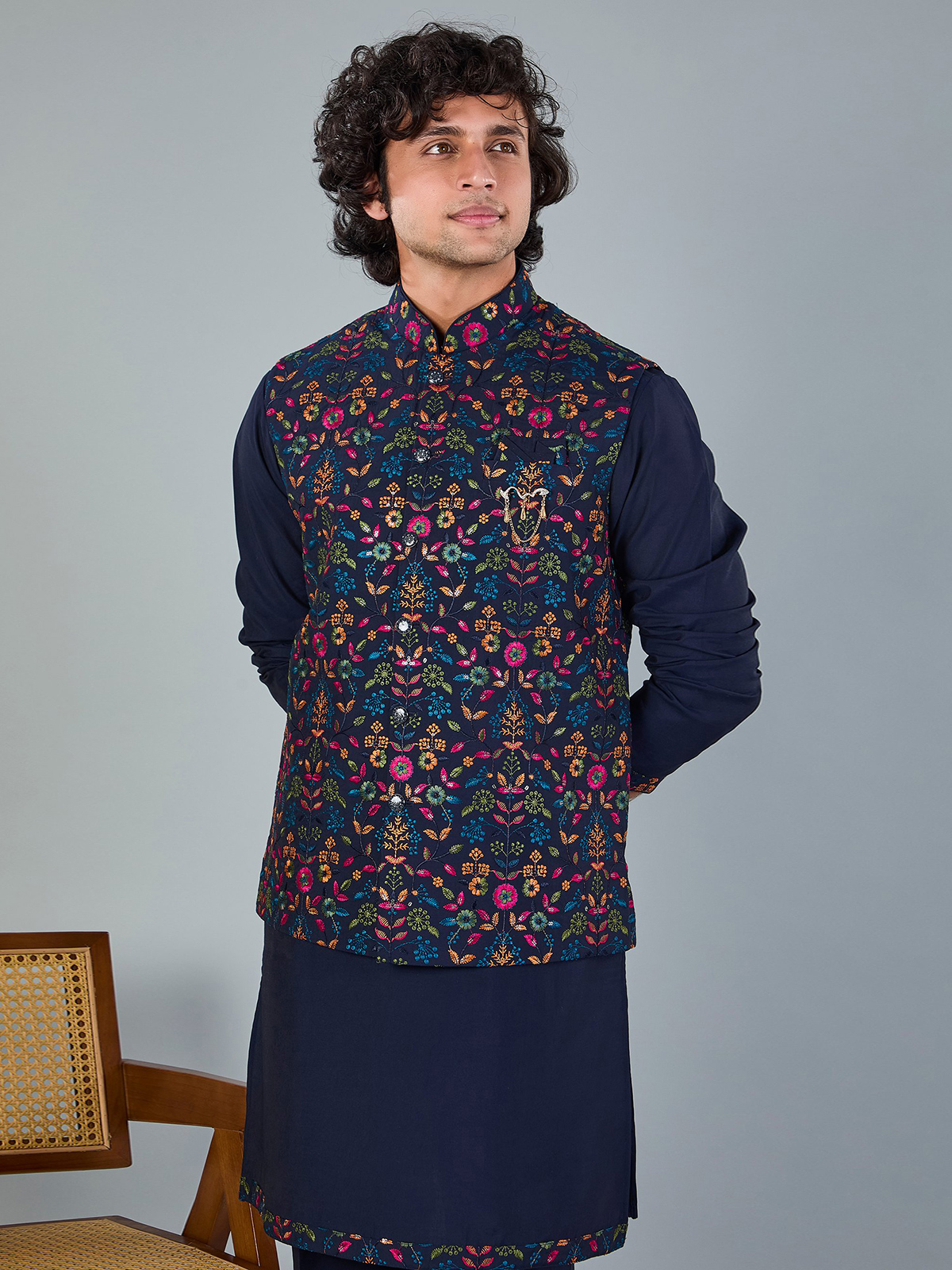 This navy blue silk waistcoat features intricate embroidery and fine sequin accents for regal appeal. Designed with a Chinese collar and paired with a matching pant, it is perfect for weddings and formal reception events.