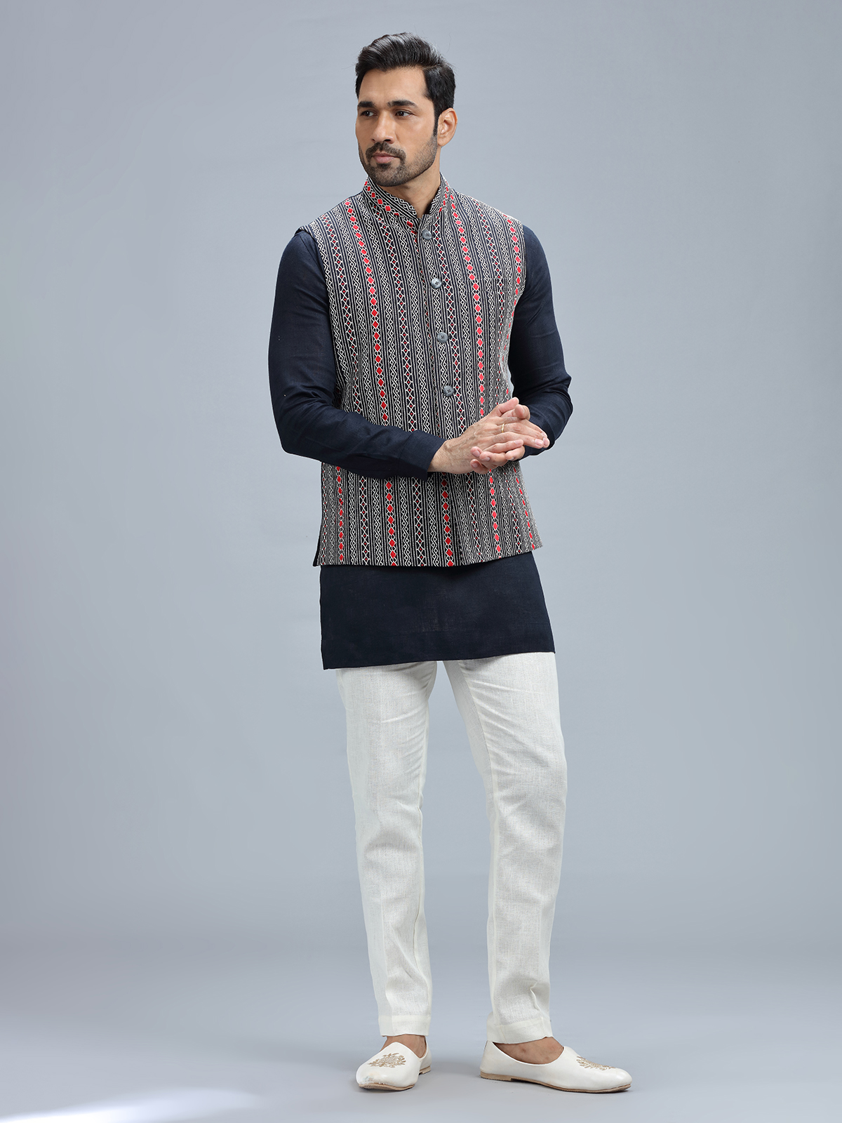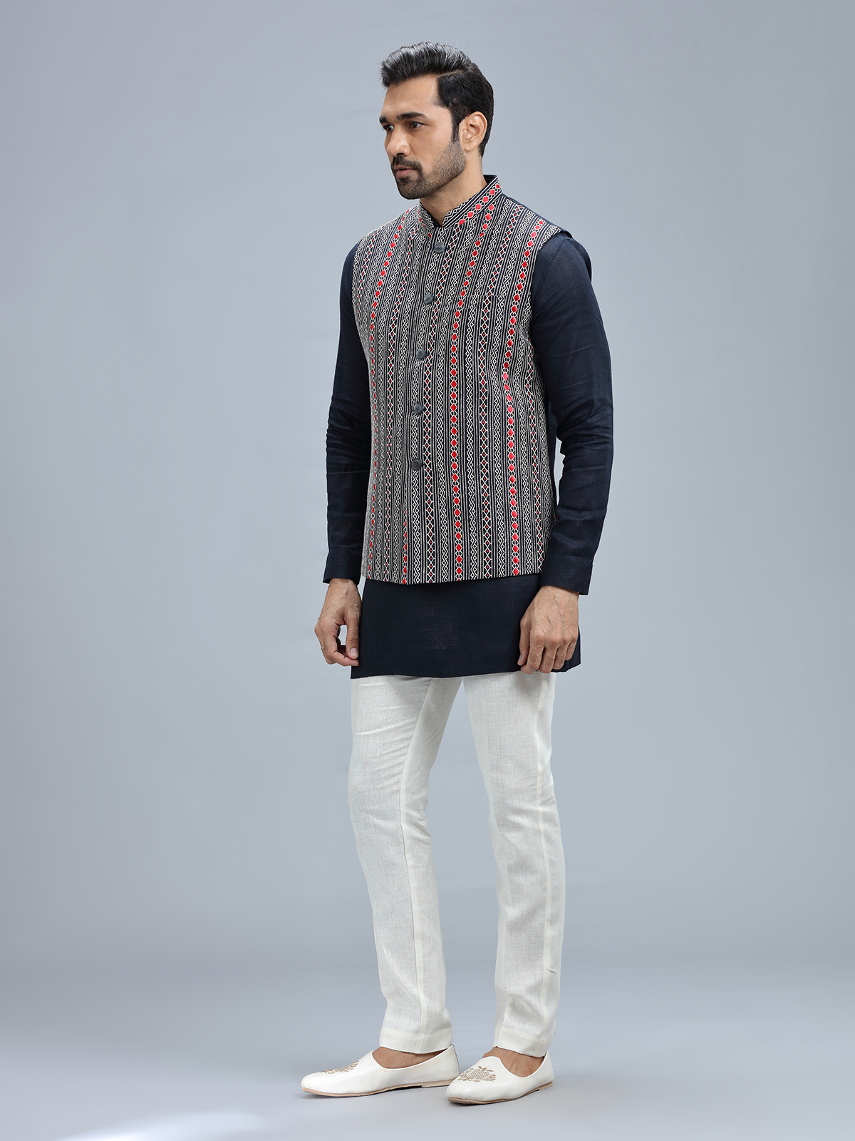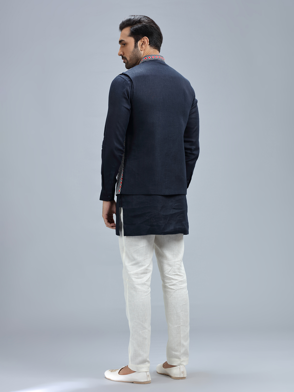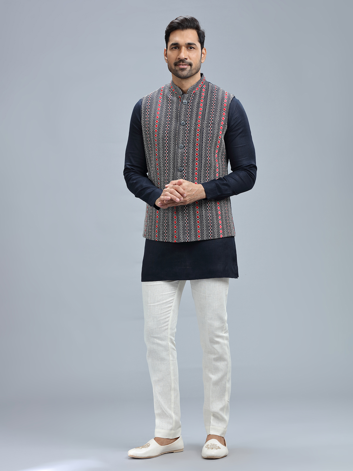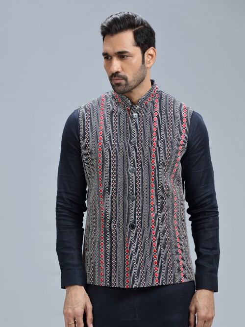 Stay fashionable in this navy linen waistcoat, adorned with embroidery work, complete with a coordinating bottom.