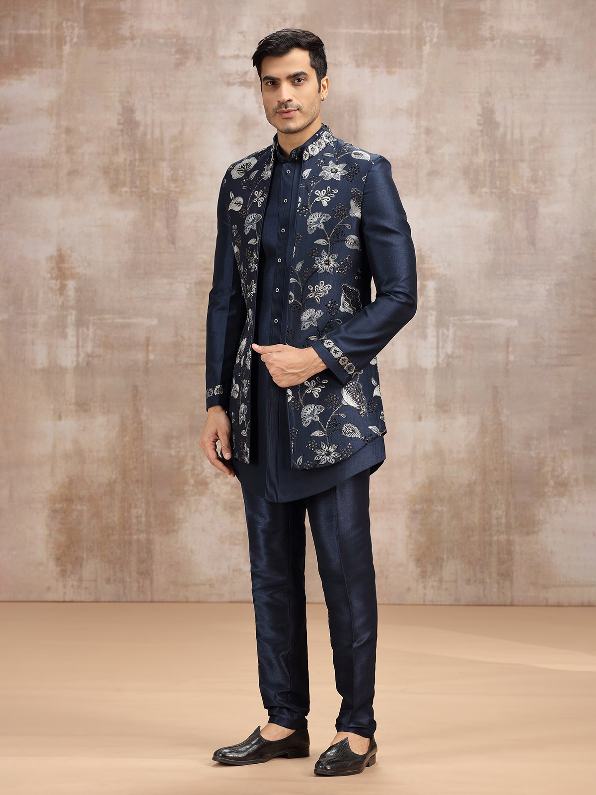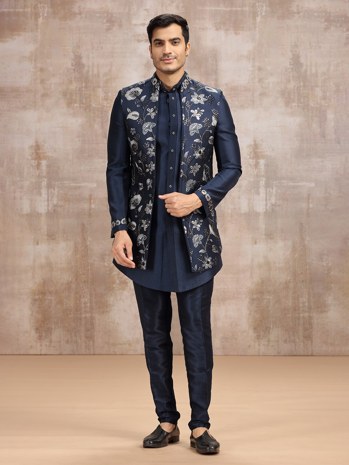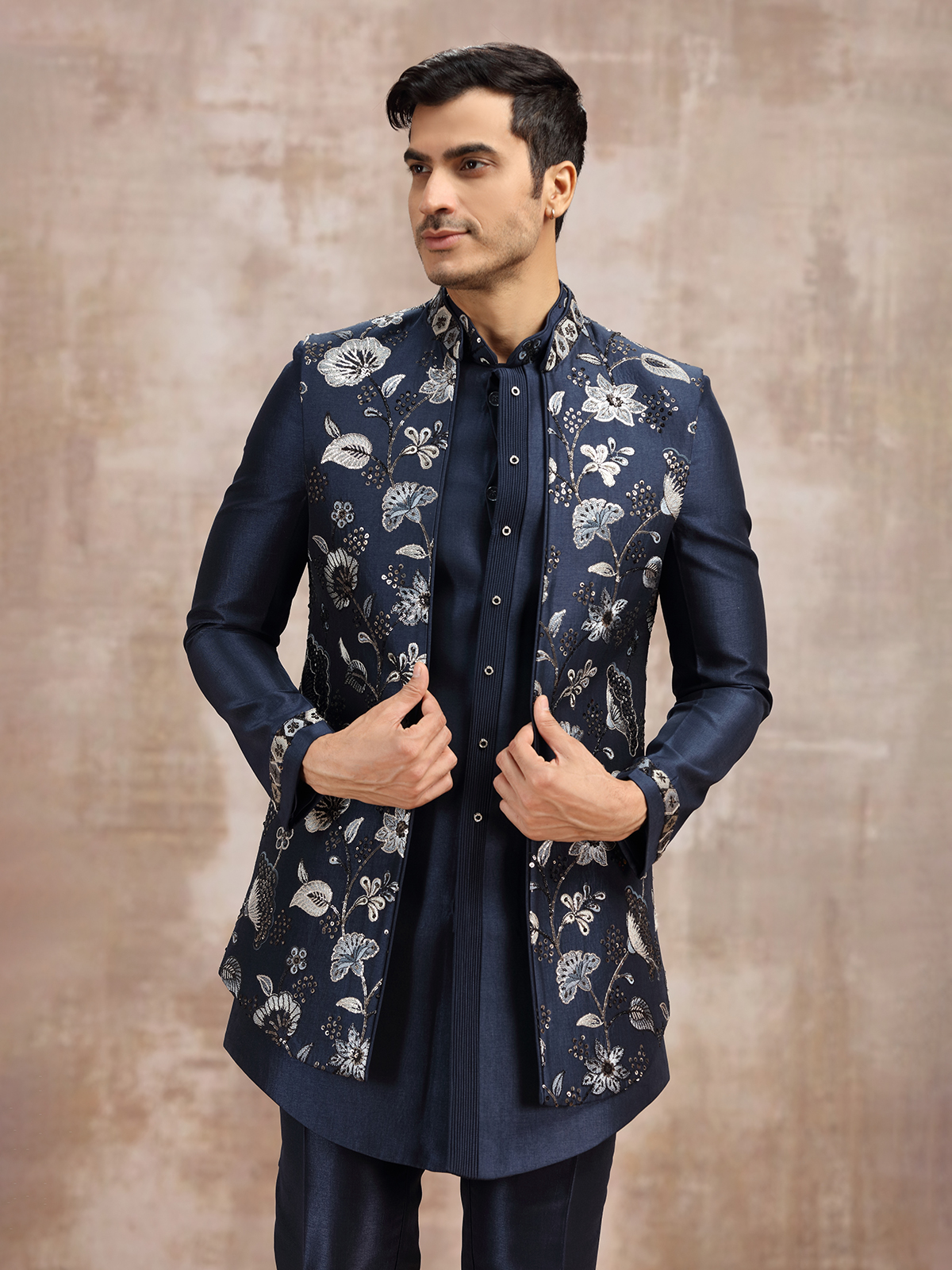 Sequins and embroidery adorn this navy silk waistcoat set, infusing it with dignified charm. A full sleeve kurta with stand collar rests beneath a sleeveless waistcoat, accompanied by a pant for graceful ease. Ideal for weddings and receptions, it reflects quiet grandeur, weaving traditional artistry into a refined and polished ensemble.