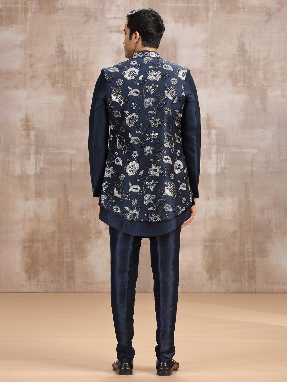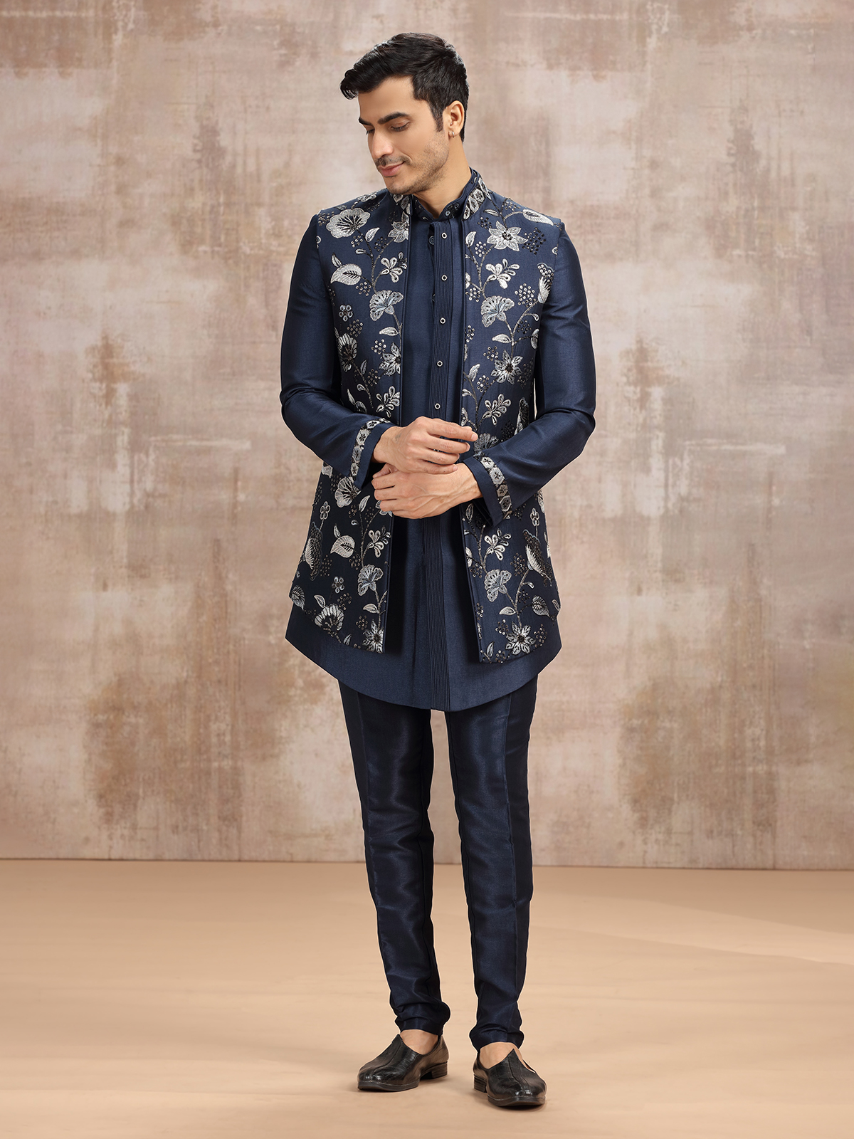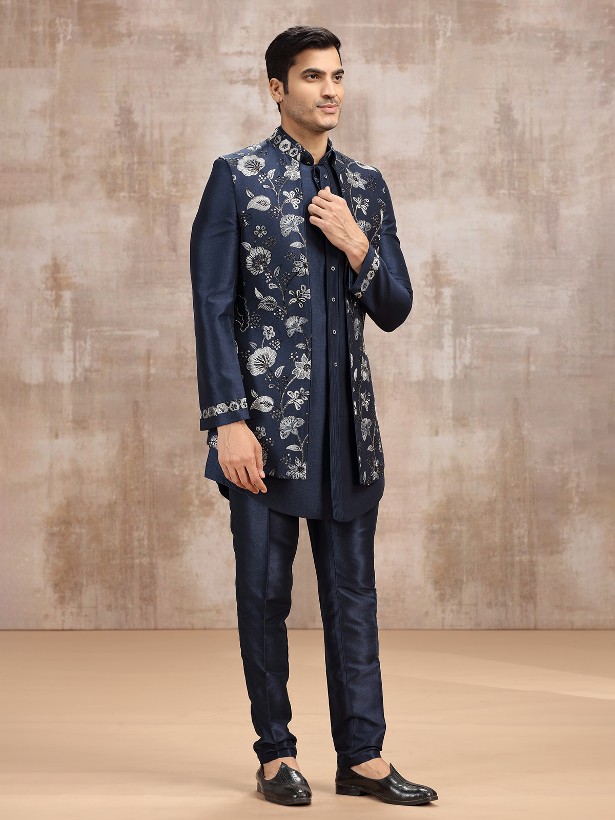 Sequins and embroidery adorn this navy silk waistcoat set, infusing it with dignified charm. A full sleeve kurta with stand collar rests beneath a sleeveless waistcoat, accompanied by a pant for graceful ease. Ideal for weddings and receptions, it reflects quiet grandeur, weaving traditional artistry into a refined and polished ensemble.