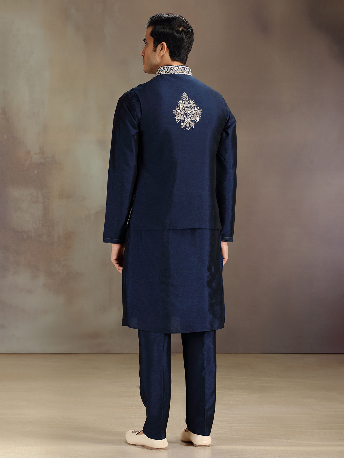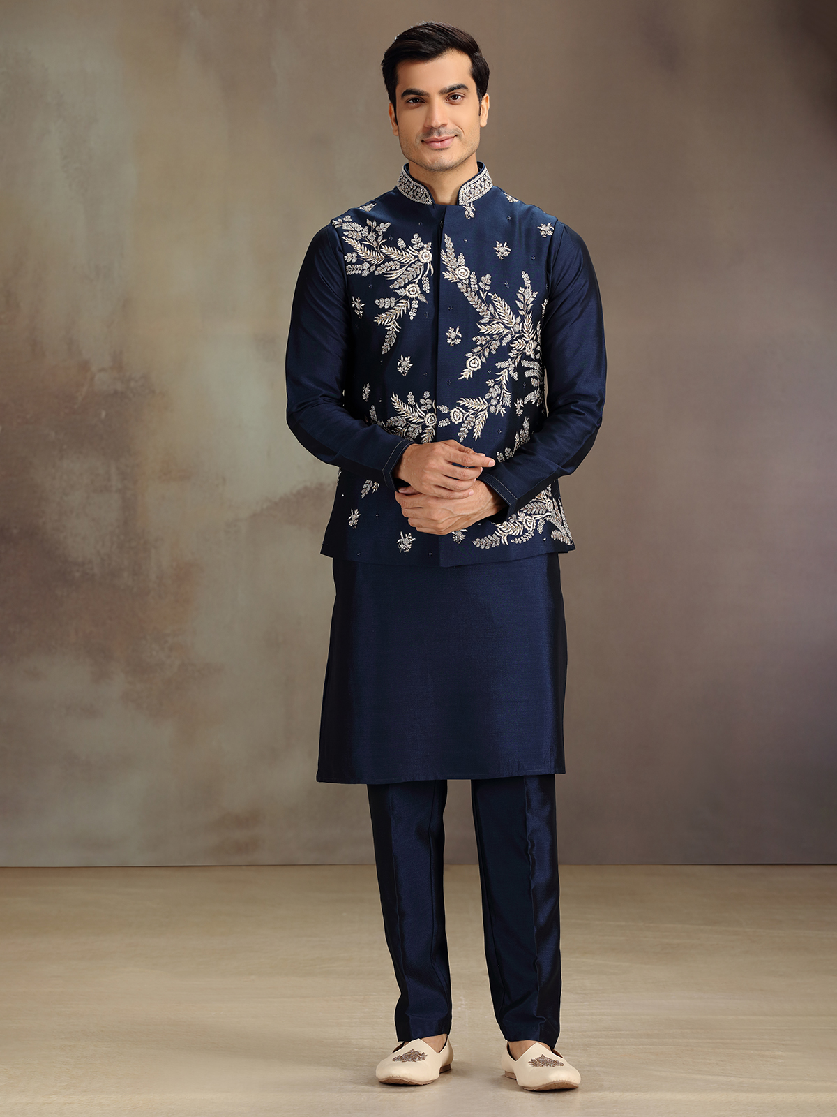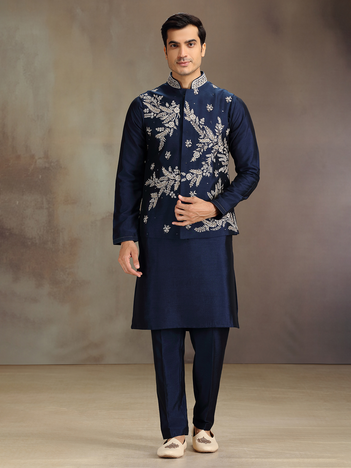 Designed in deep navy this waistcoat set is features embroidery and sequins come alive with refined artistry over silk base. The sleeveless waistcoat with a chinese-collared, full-sleeve kurta exudes stately elegance. Completed with pant for timeless wedding sophistication.
