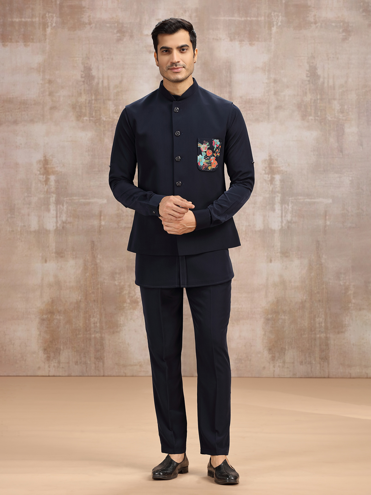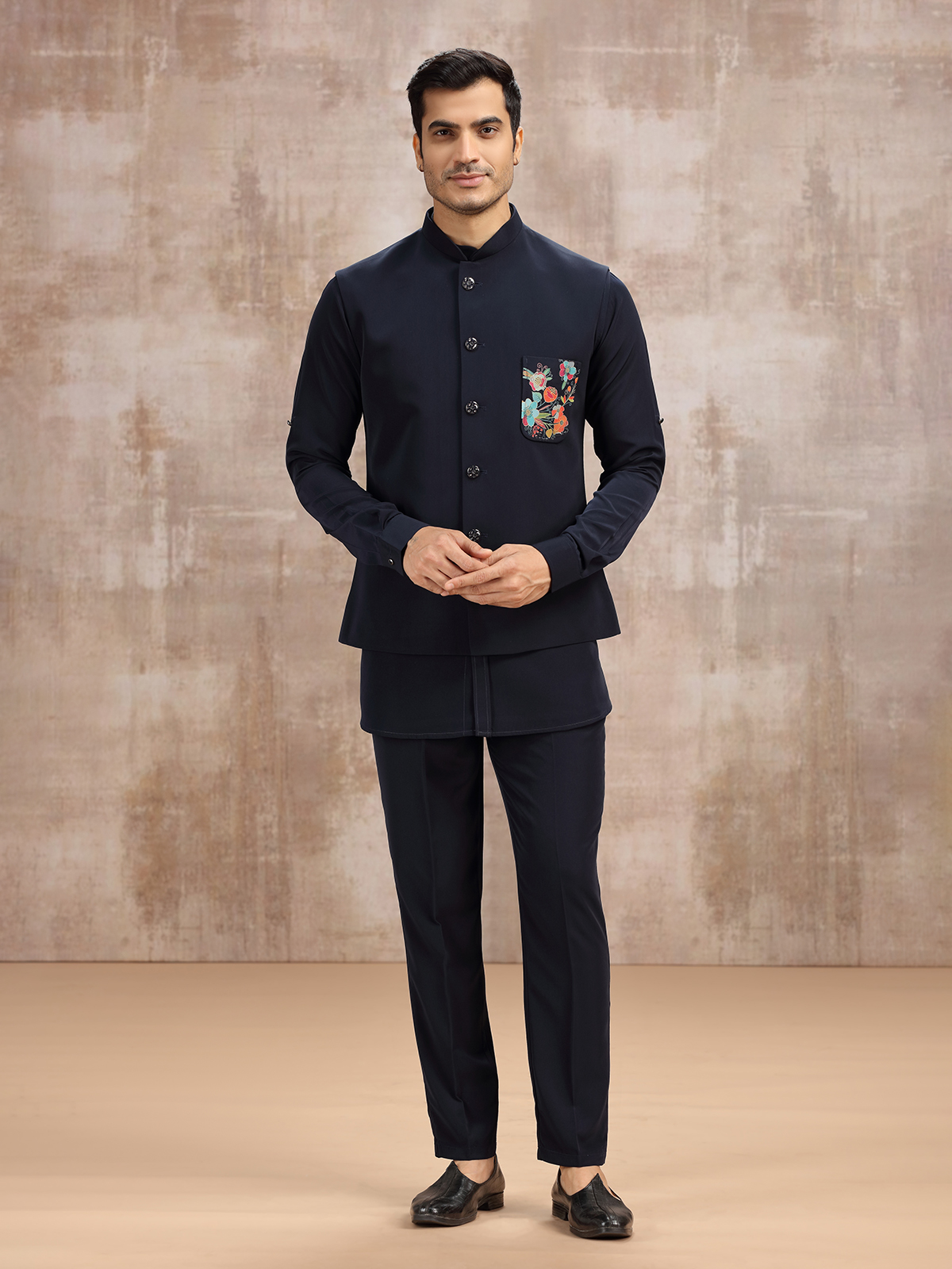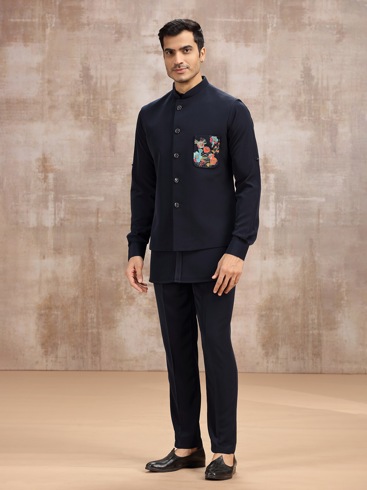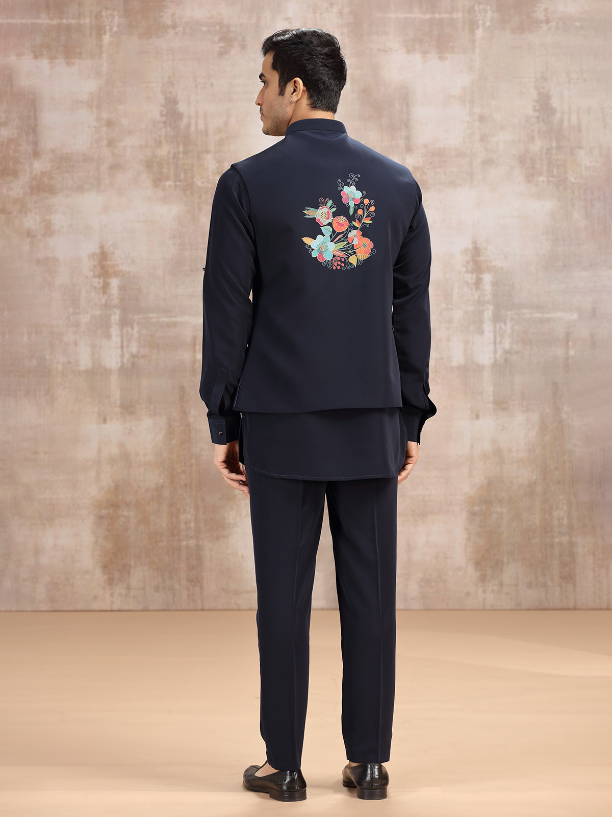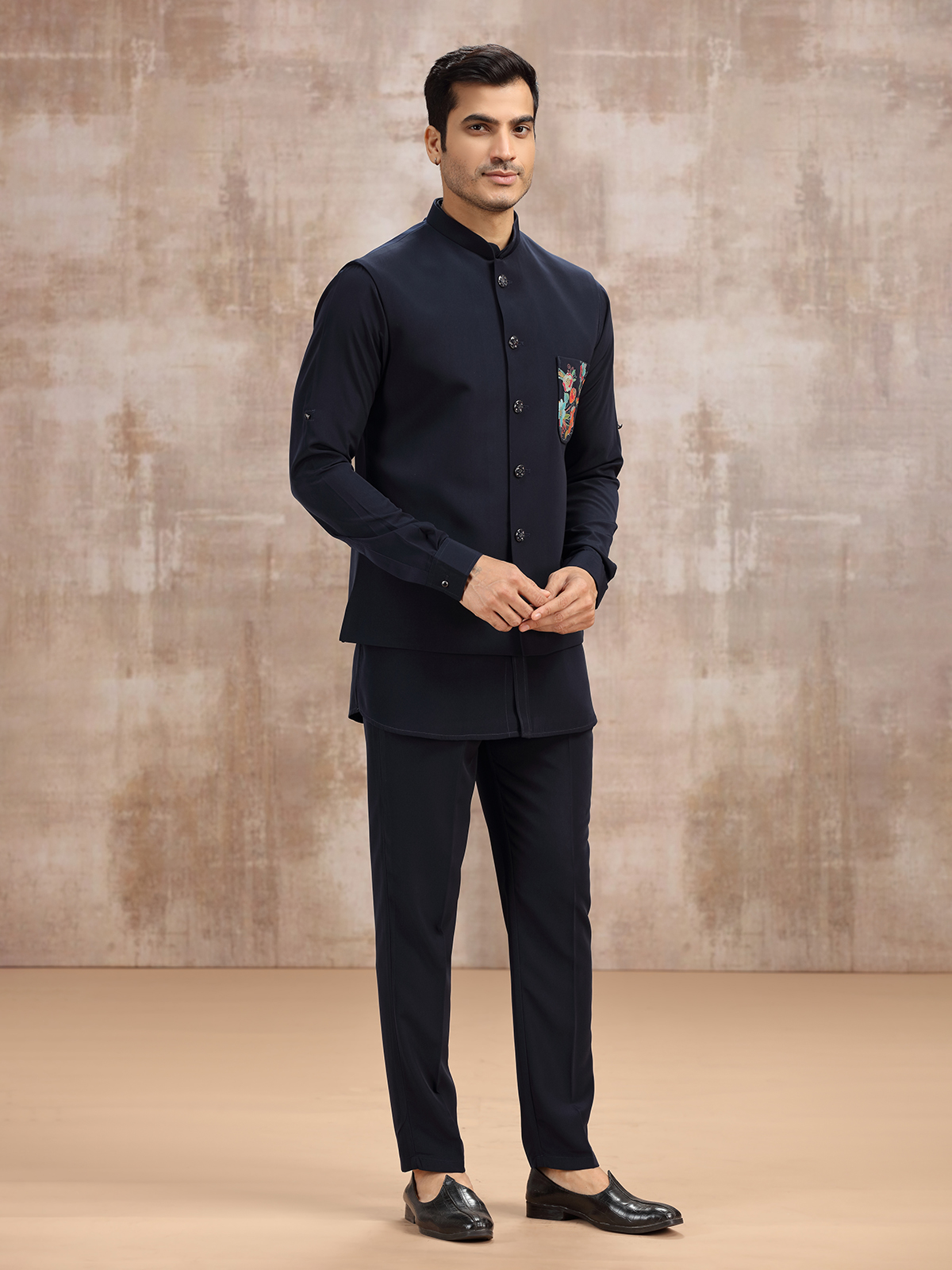 In navy terry rayon, this waistcoat set carries dignified refinement. A stand collar kurta with full sleeves pairs with a sleeveless waistcoat and pant, creating a composed silhouette. Designed for weddings and receptions, it reflects timeless poise, where depth of tone and sleek tailoring form an ensemble of graceful sophistication.