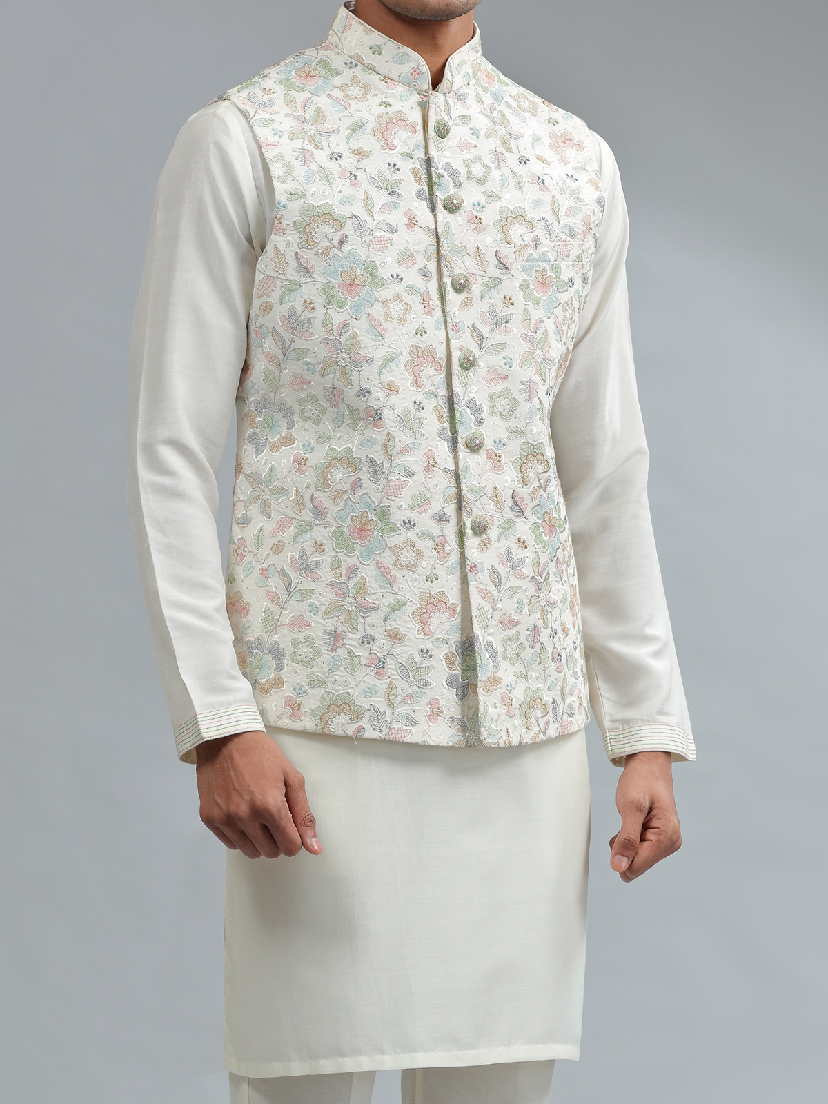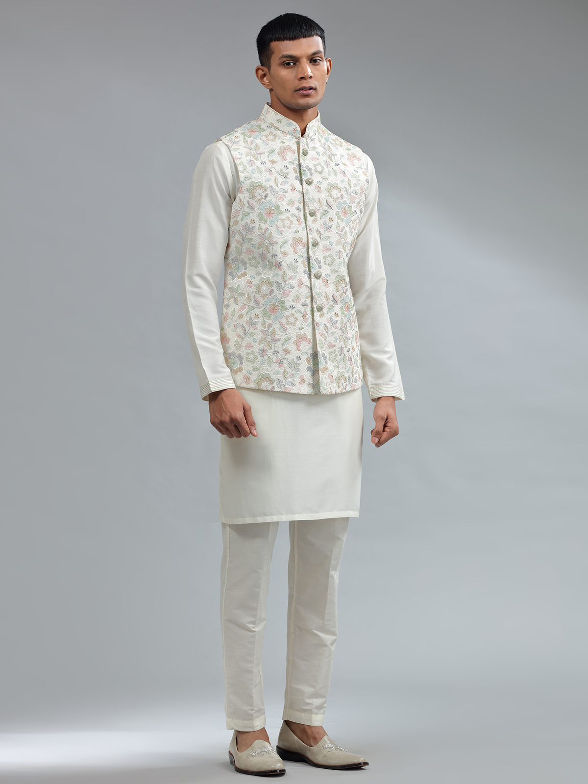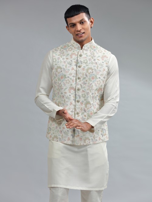 Enlighten every festivity as your adorn this beautifully crafted white silk waistcoat set. Enhanced with floral embroidery, zari and sequins work. Comes with a bottom. Be it any traditional events these are certainly your best choice for any occasion.