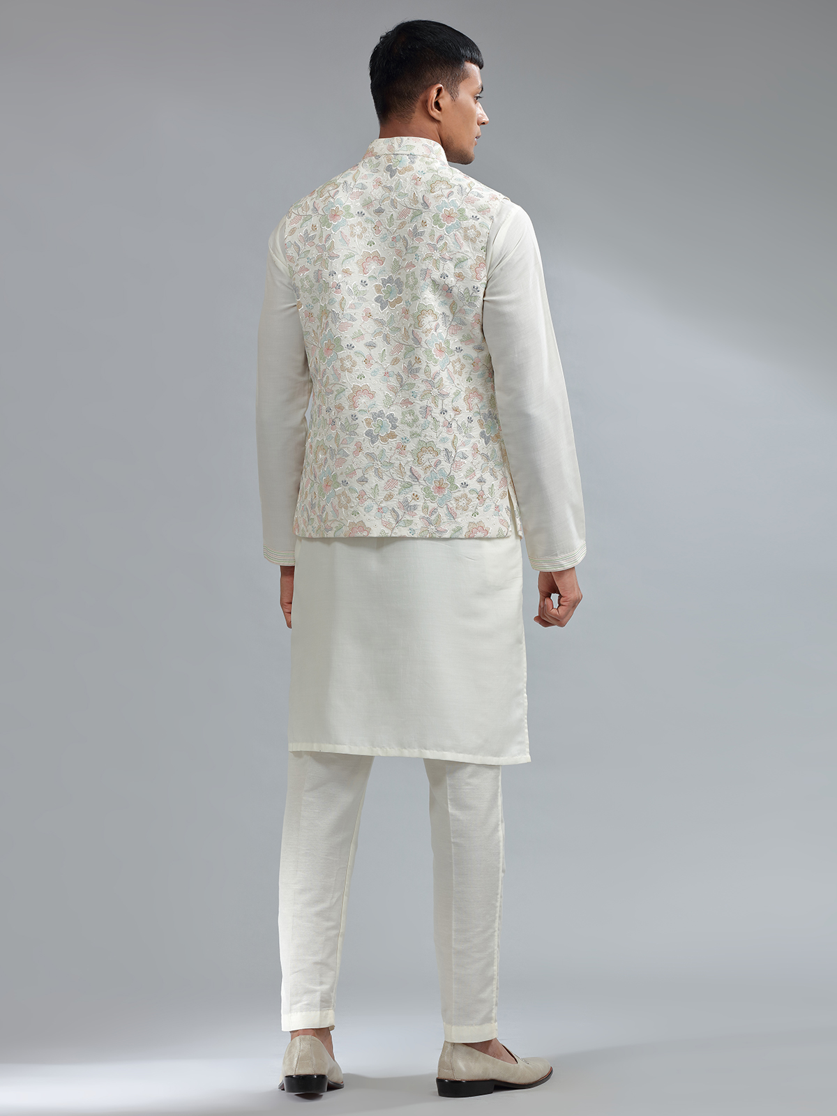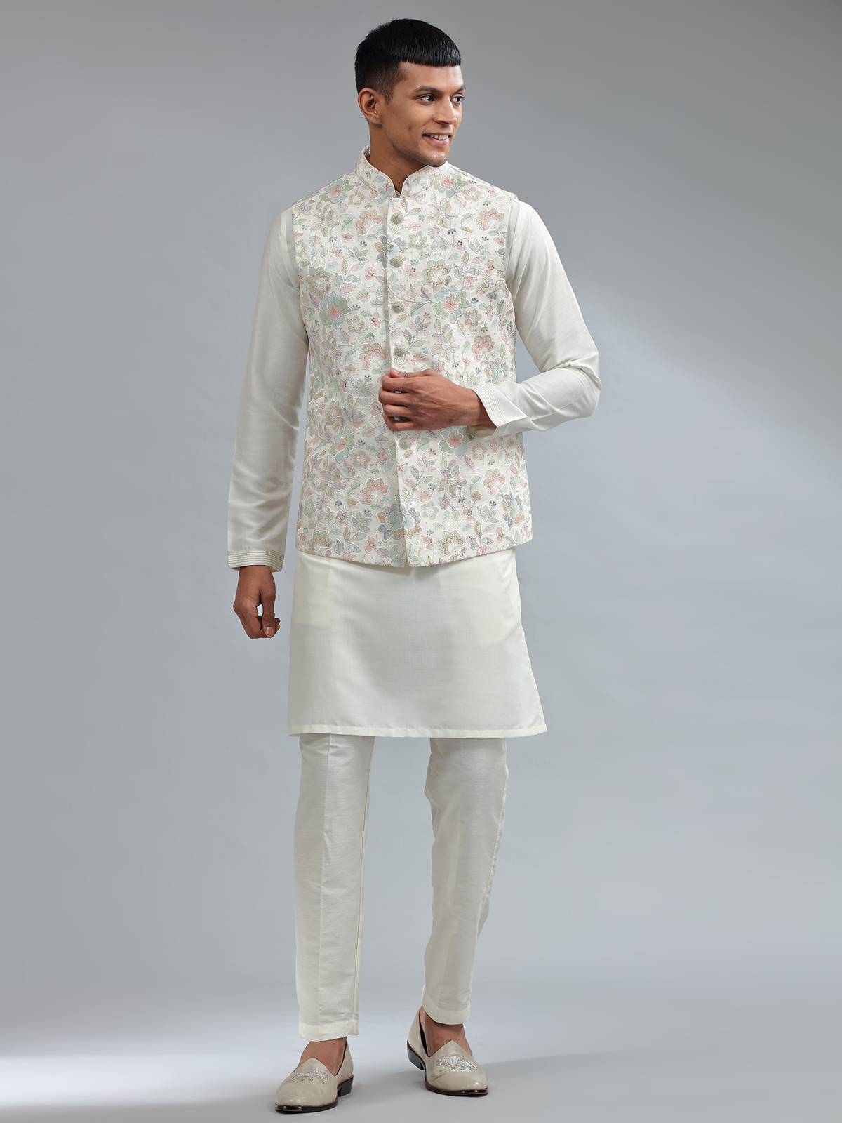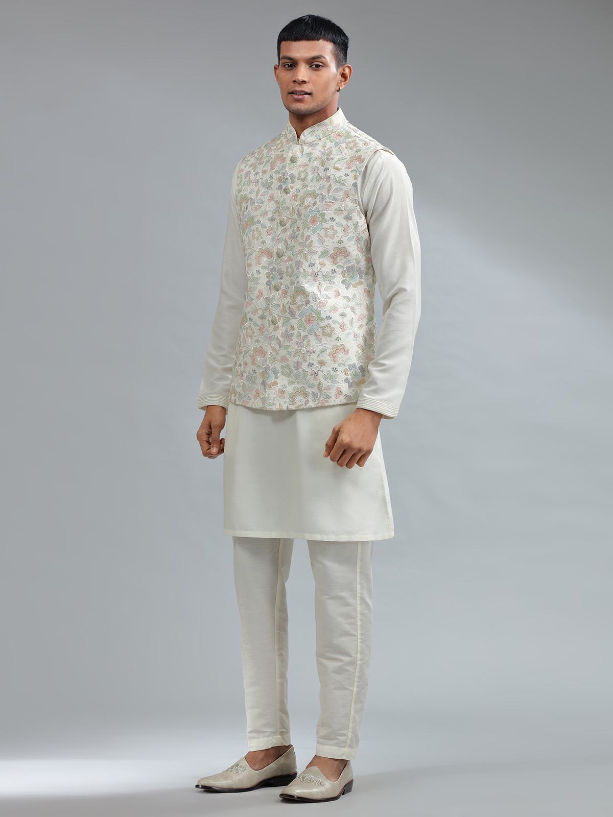 Enlighten every festivity as your adorn this beautifully crafted white silk waistcoat set. Enhanced with floral embroidery, zari and sequins work. Comes with a bottom. Be it any traditional events these are certainly your best choice for any occasion.