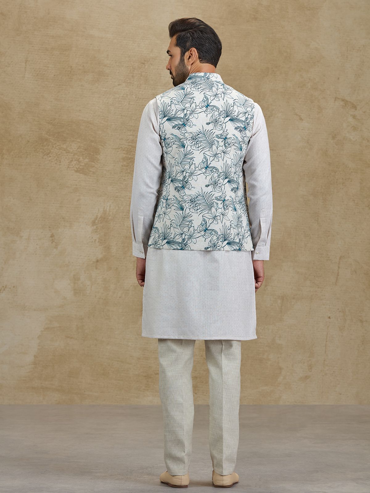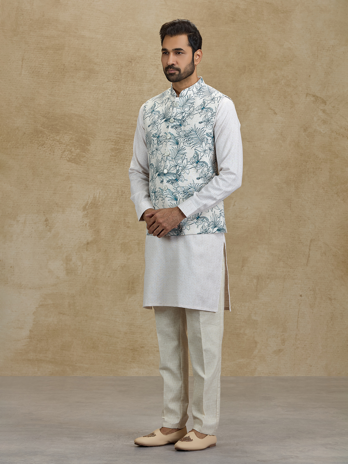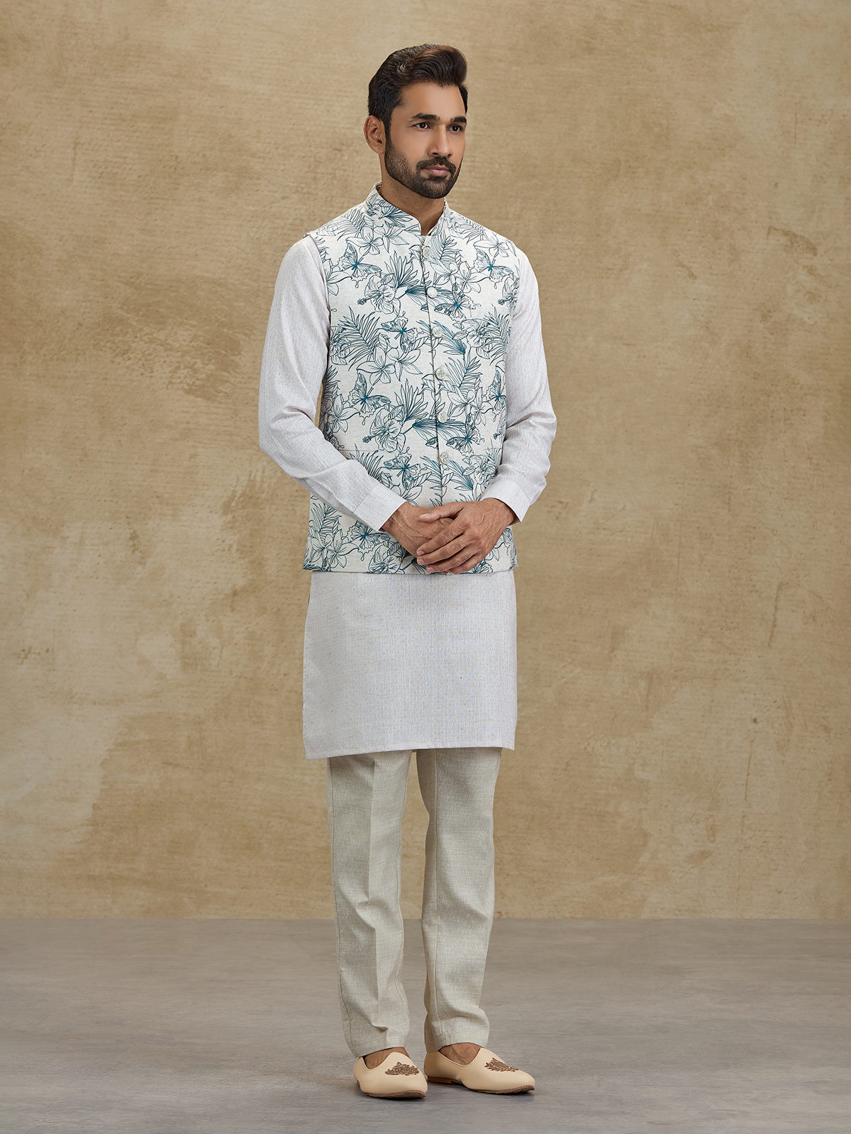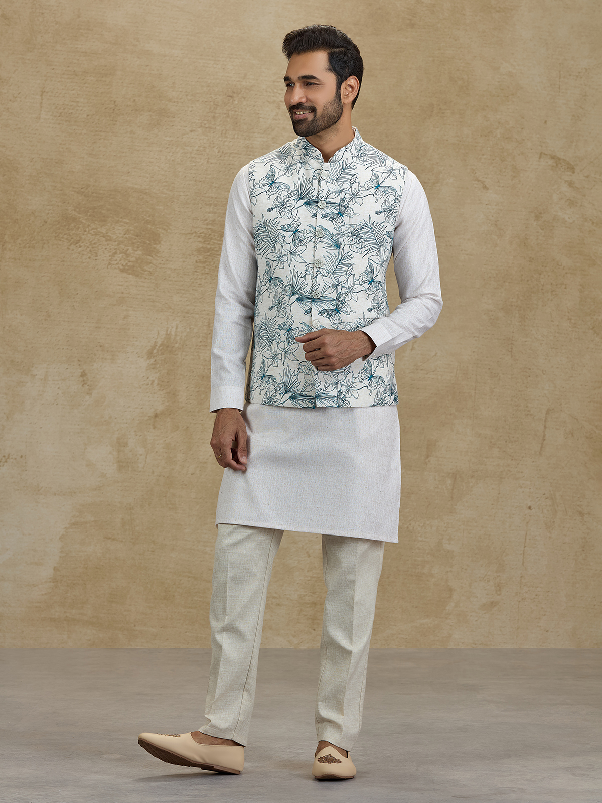 Add a refreshing touch of elegance with this off white and blue silk waistcoat set. Featuring a graceful floral printed waistcoat layered over a classic kurta, the outfit blends artistic charm with traditional style. Styled with comfortable pants, this ensemble is perfect for weddings, sangeet functions, receptions and festive celebrations.