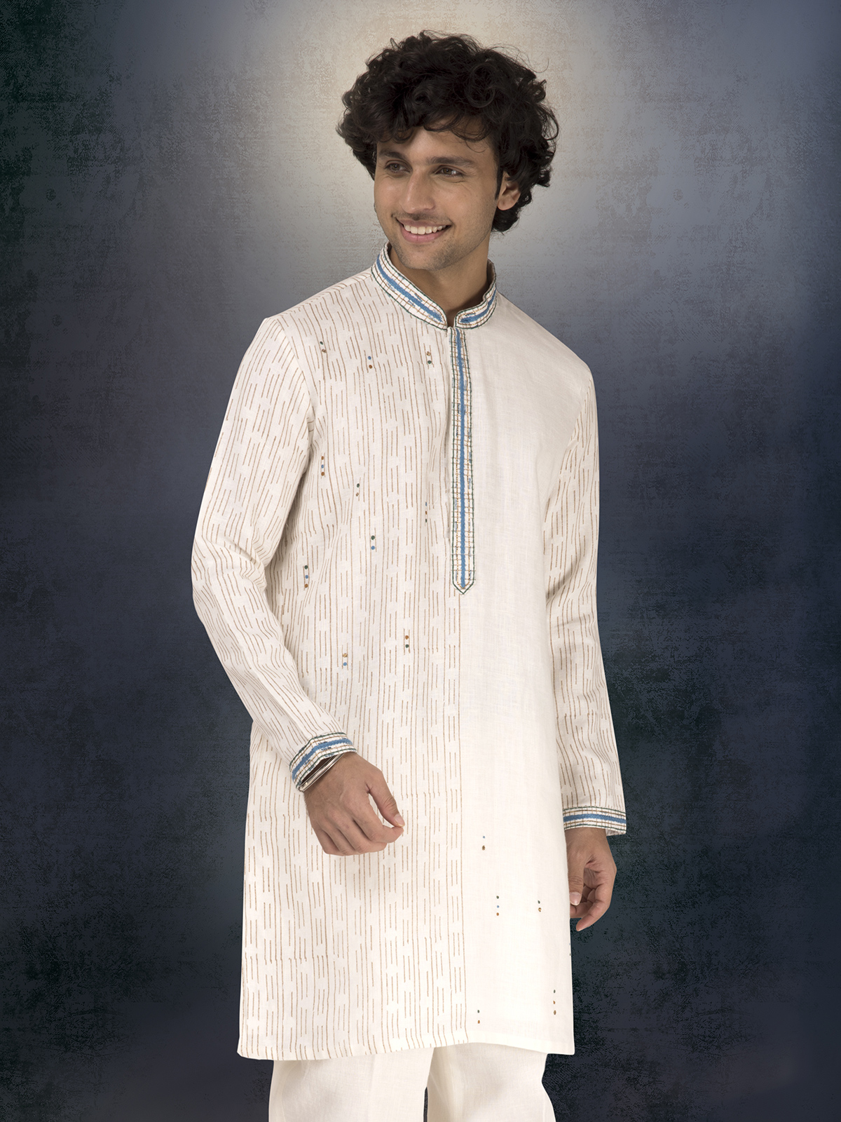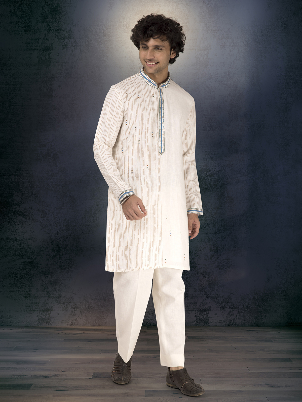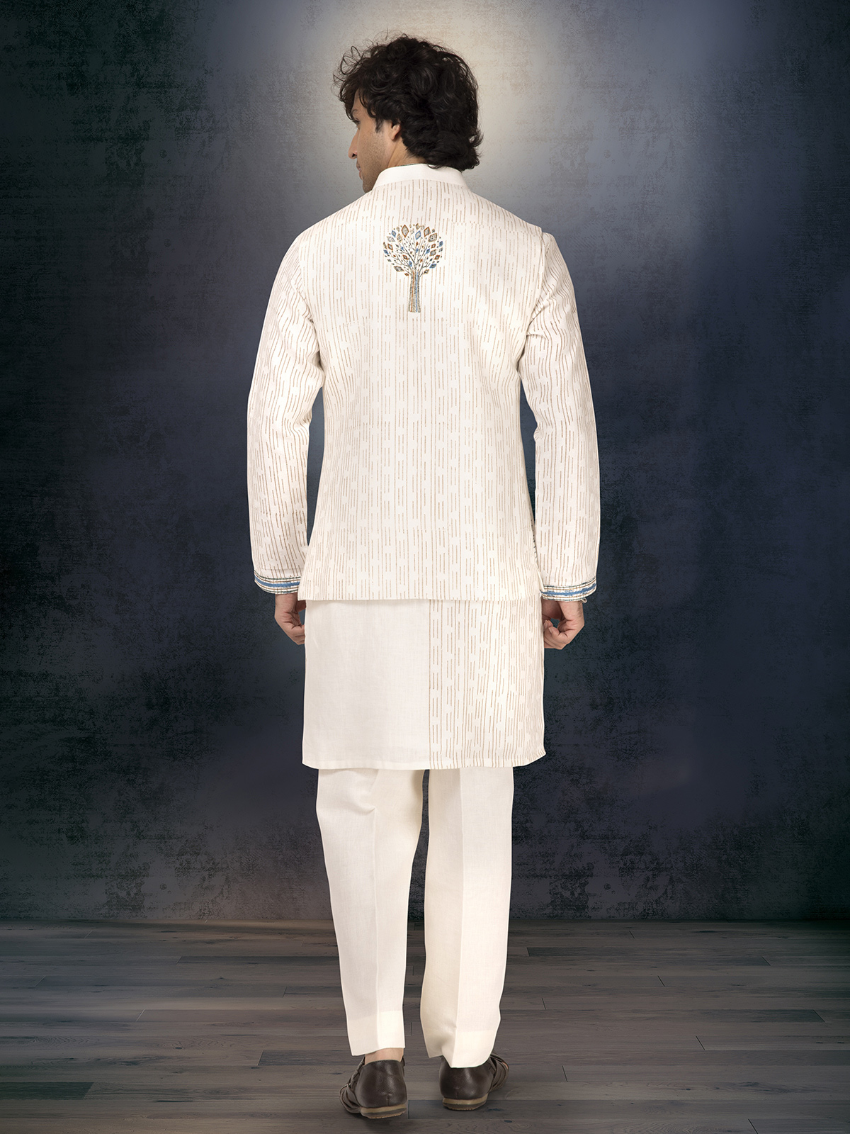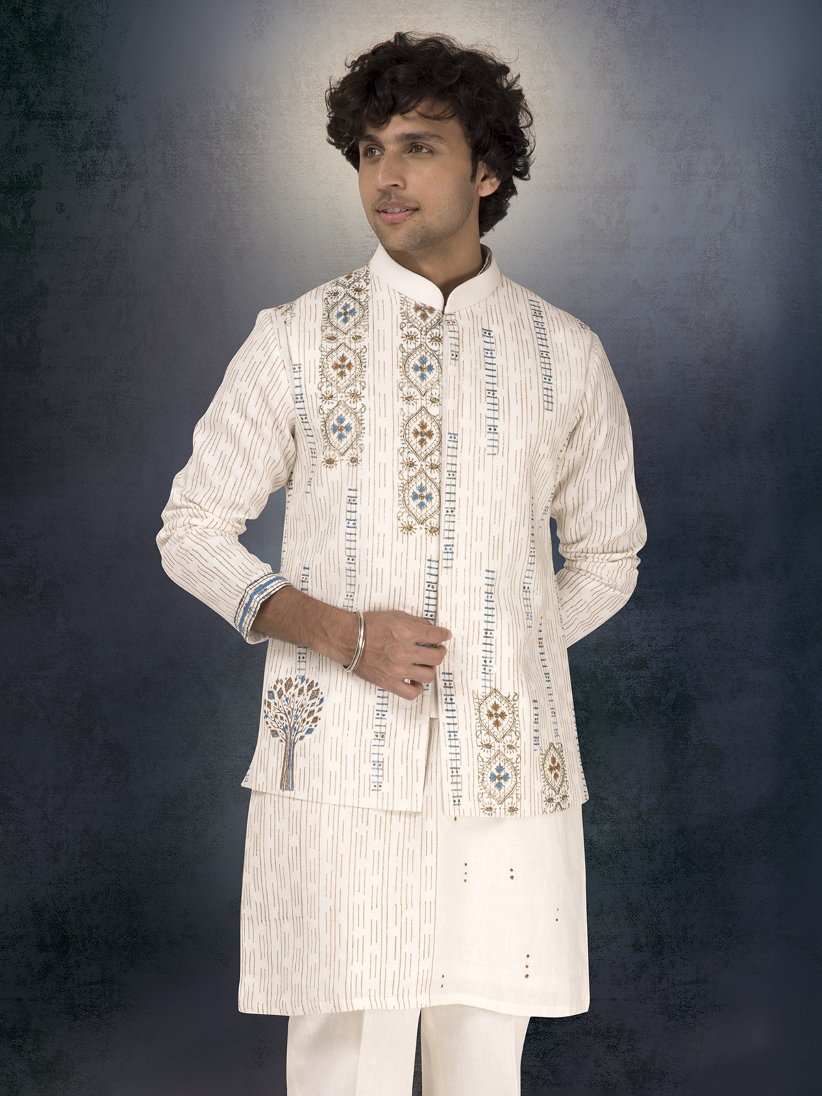 Crafted in airy off-white linen, this waistcoat set features intricate block prints with thread and resham highlights. Light, artistic, and elegant, it’s perfect for weddings and festive wear. Teamed with a pant, it exudes effortless purity and cultured grace.