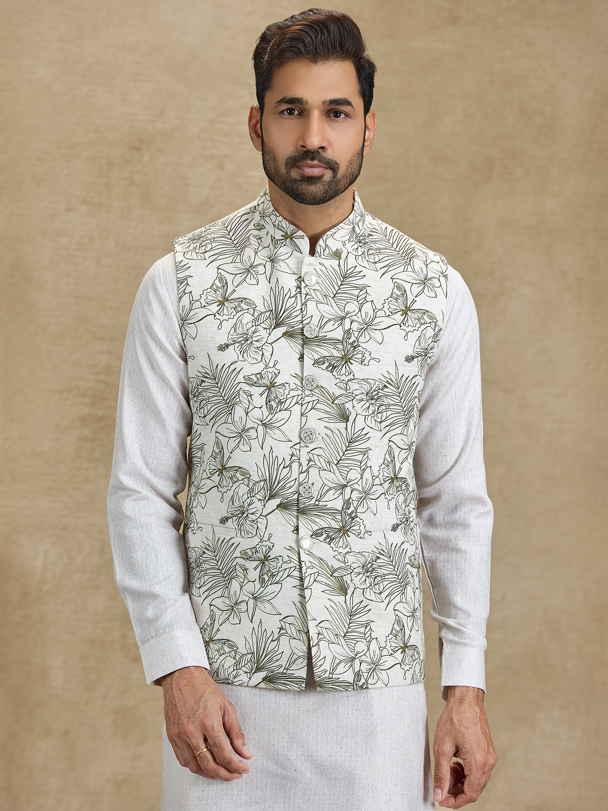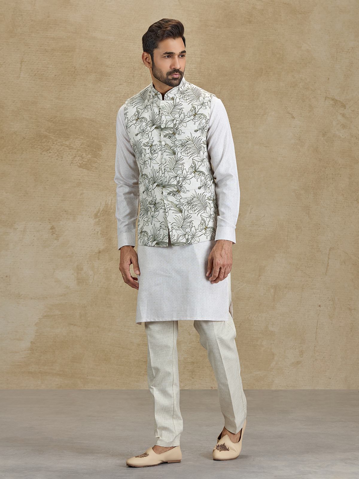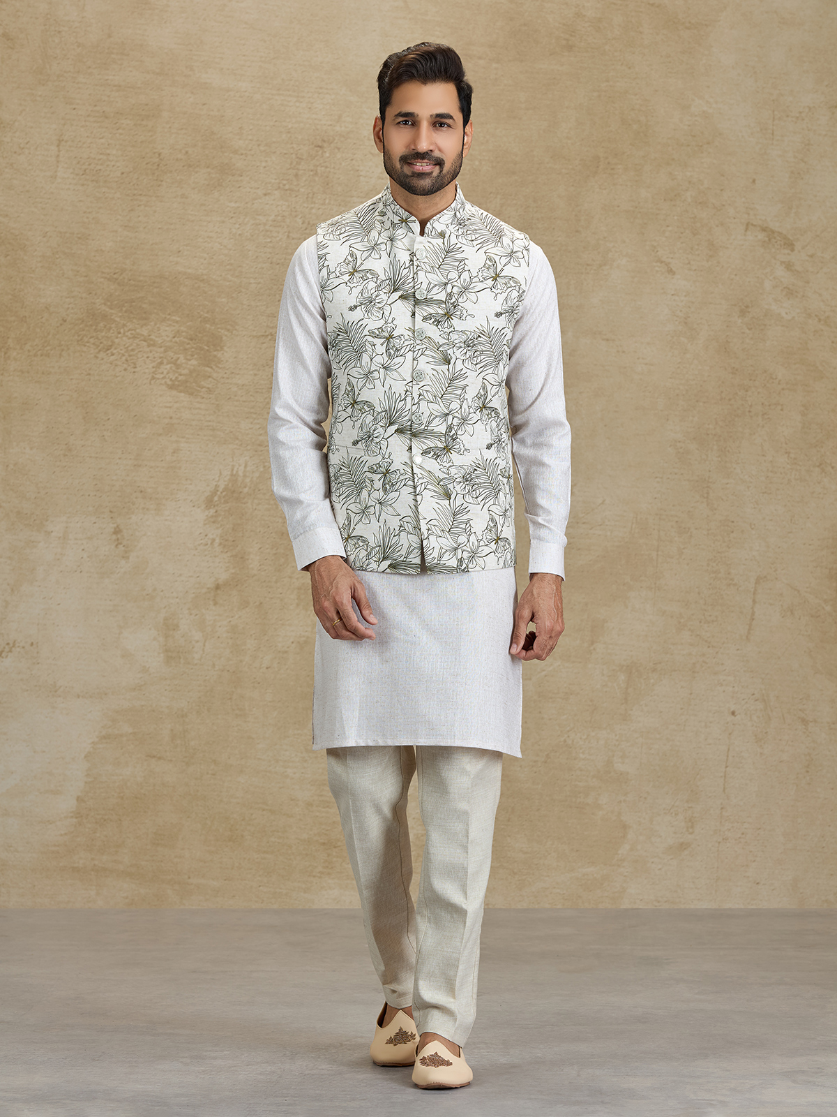 This off white and olive silk waistcoat set brings a refined festive appeal with its elegant floral printed design. The stylish waistcoat enhances the classic kurta silhouette with subtle botanical patterns. Paired with tailored pants, this ensemble offers a sophisticated ethnic look perfect for weddings, receptions and festive occasions.