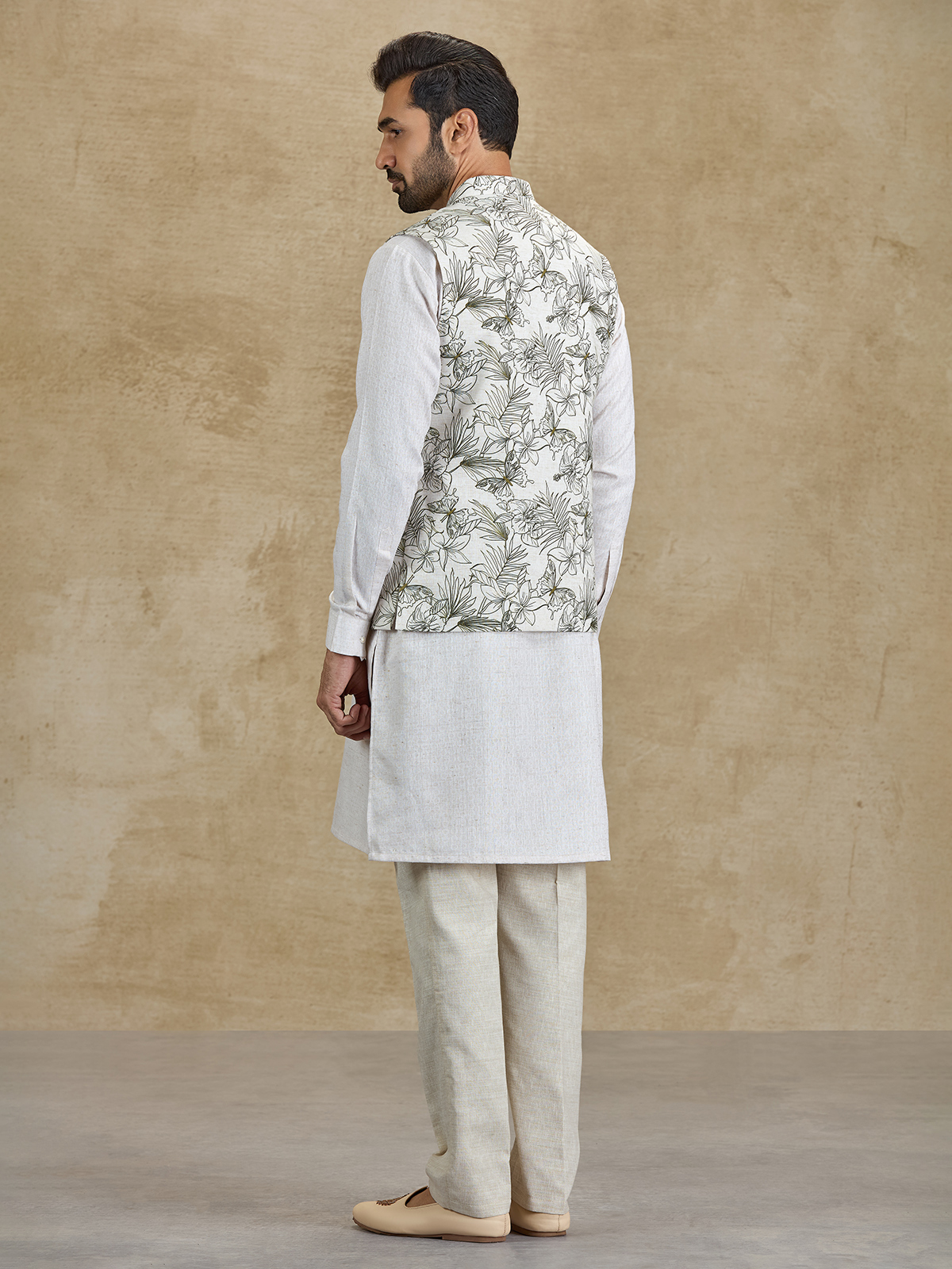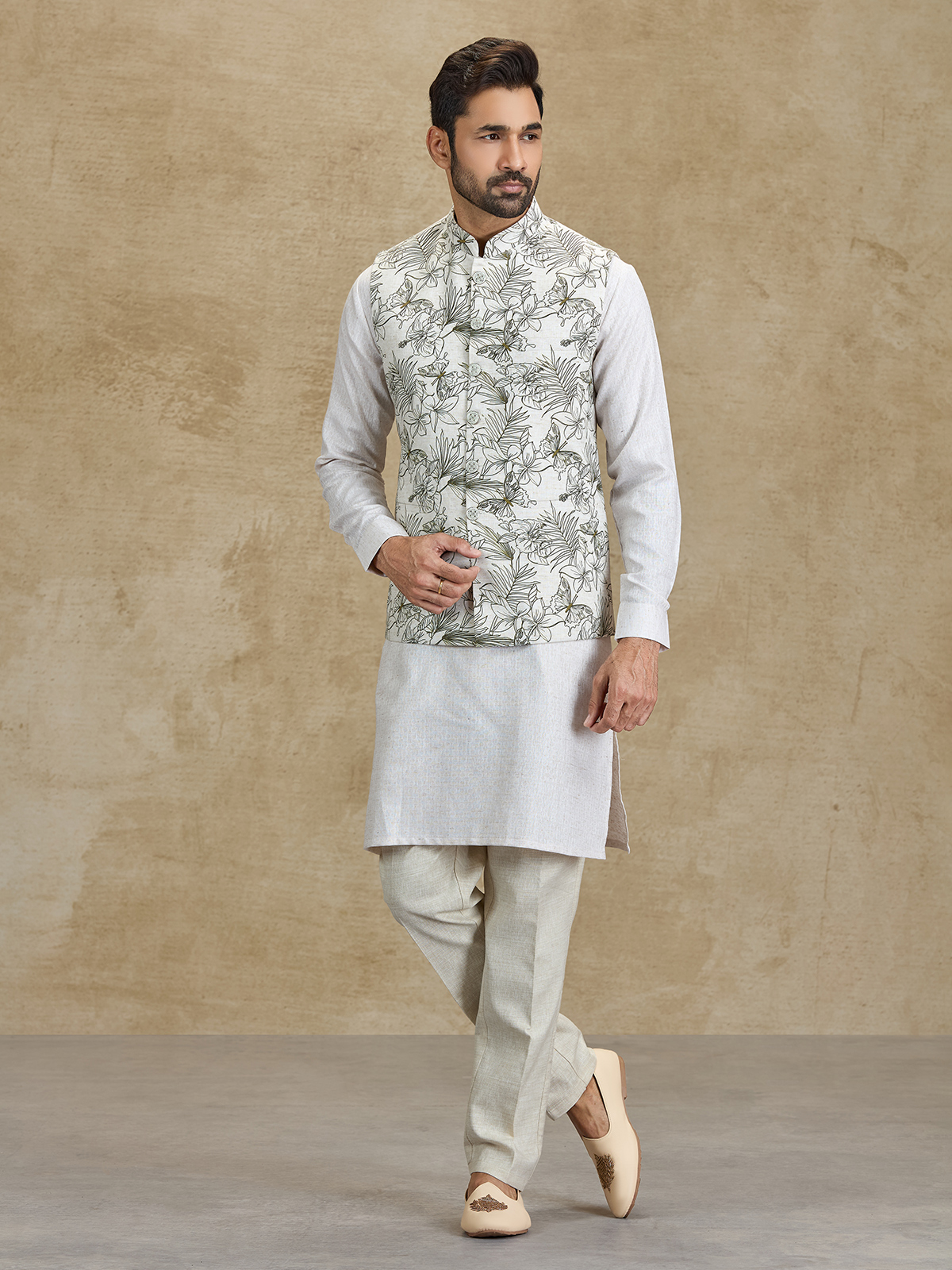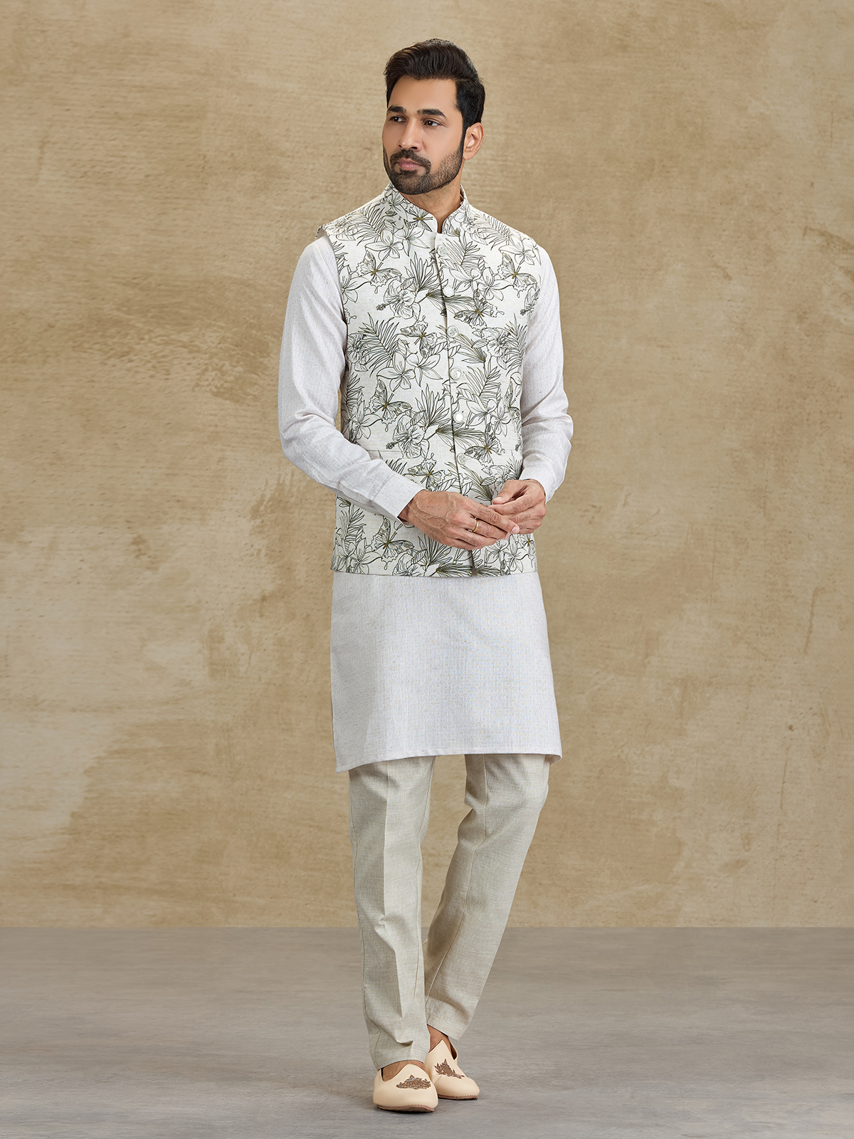 This off white and olive silk waistcoat set brings a refined festive appeal with its elegant floral printed design. The stylish waistcoat enhances the classic kurta silhouette with subtle botanical patterns. Paired with tailored pants, this ensemble offers a sophisticated ethnic look perfect for weddings, receptions and festive occasions.
