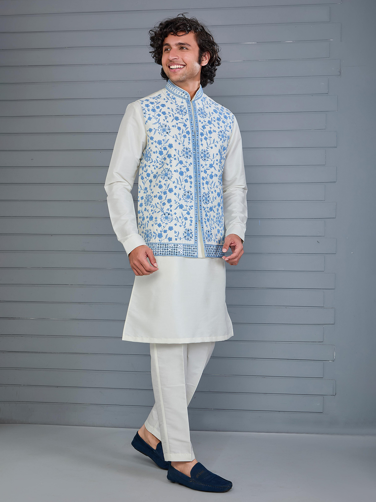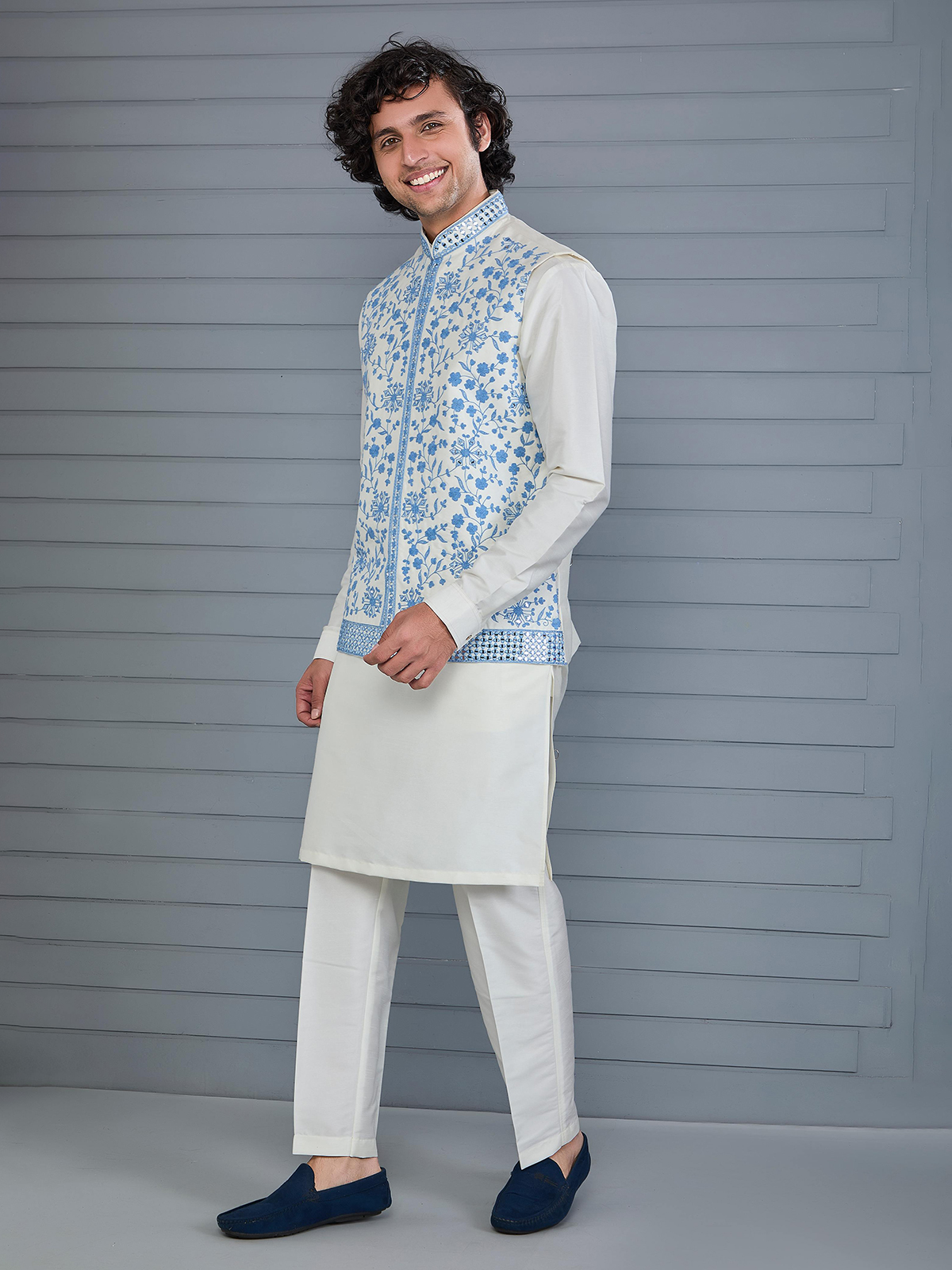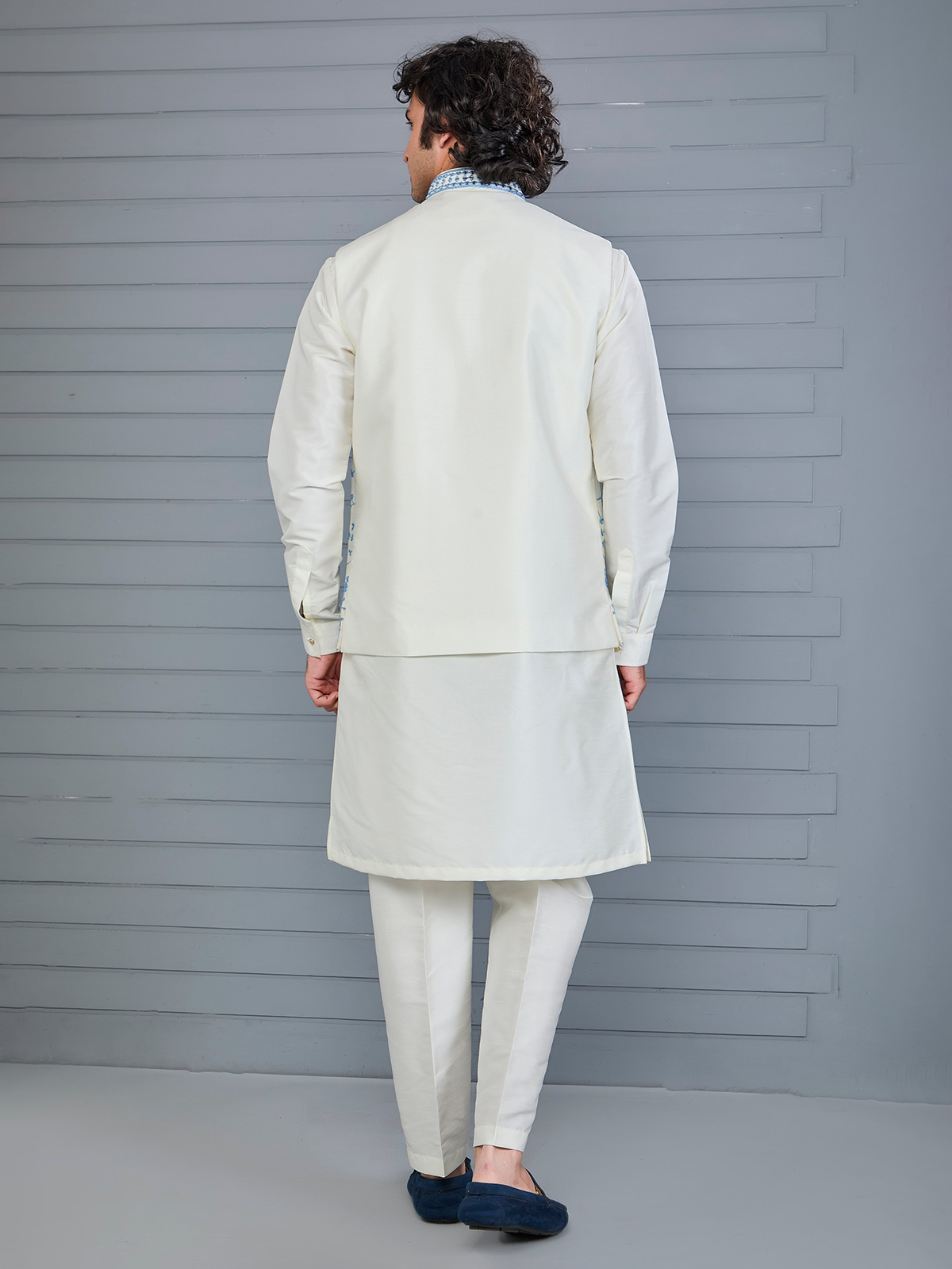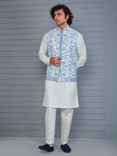 Classic off-white silk waistcoat adorned with rich embroidery and aabla work for regal charm. Designed with a Chinese collar and paired with a coordinated pant, it delivers timeless elegance for weddings, festive gatherings and formal receptions.