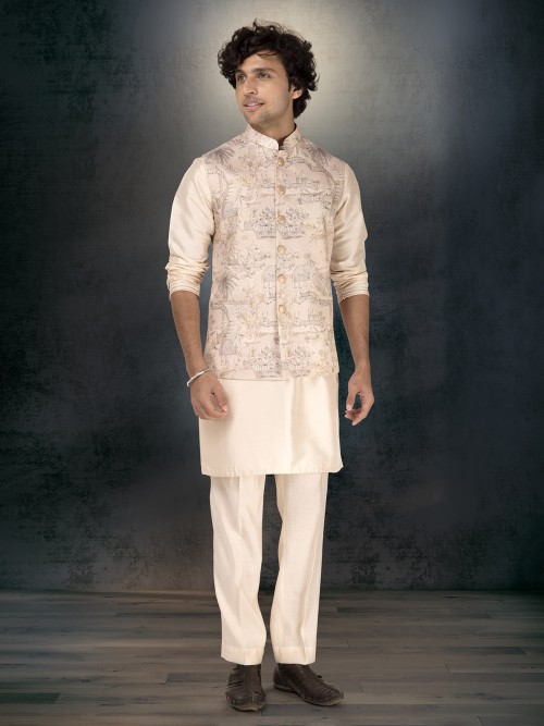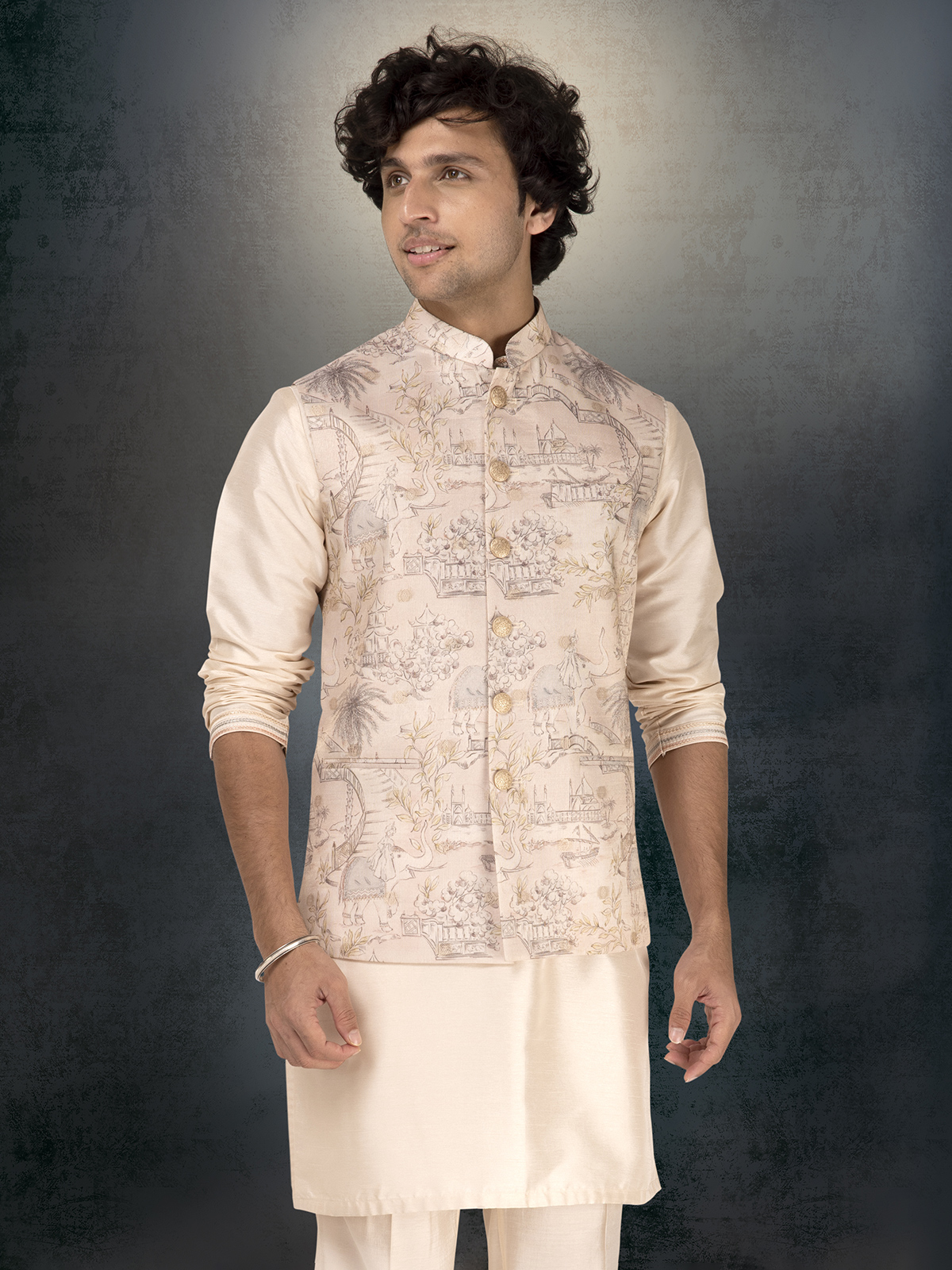 A vision of serene sophistication, this off-white silk waistcoat set features delicate printed artistry exuding cultured refinement. Its calm palette is ideal for weddings and receptions alike. Styled with a pant, it captures the spirit of timeless elegance.