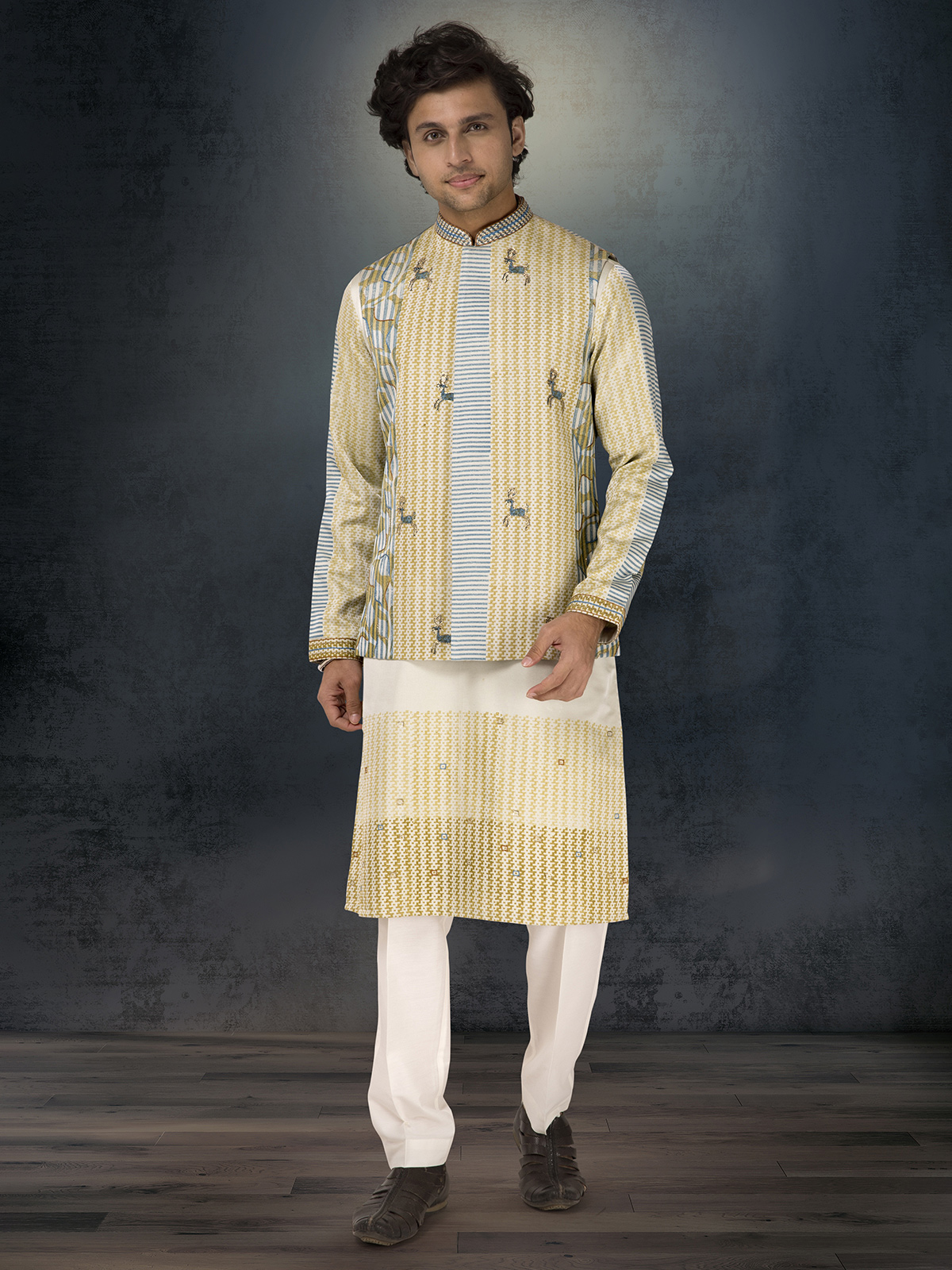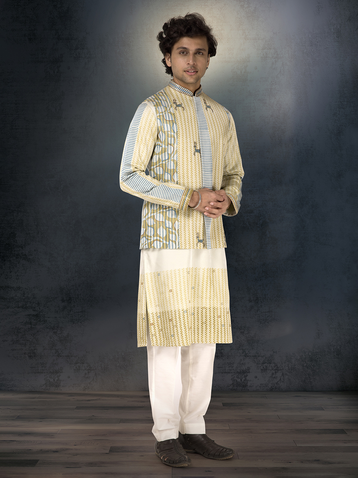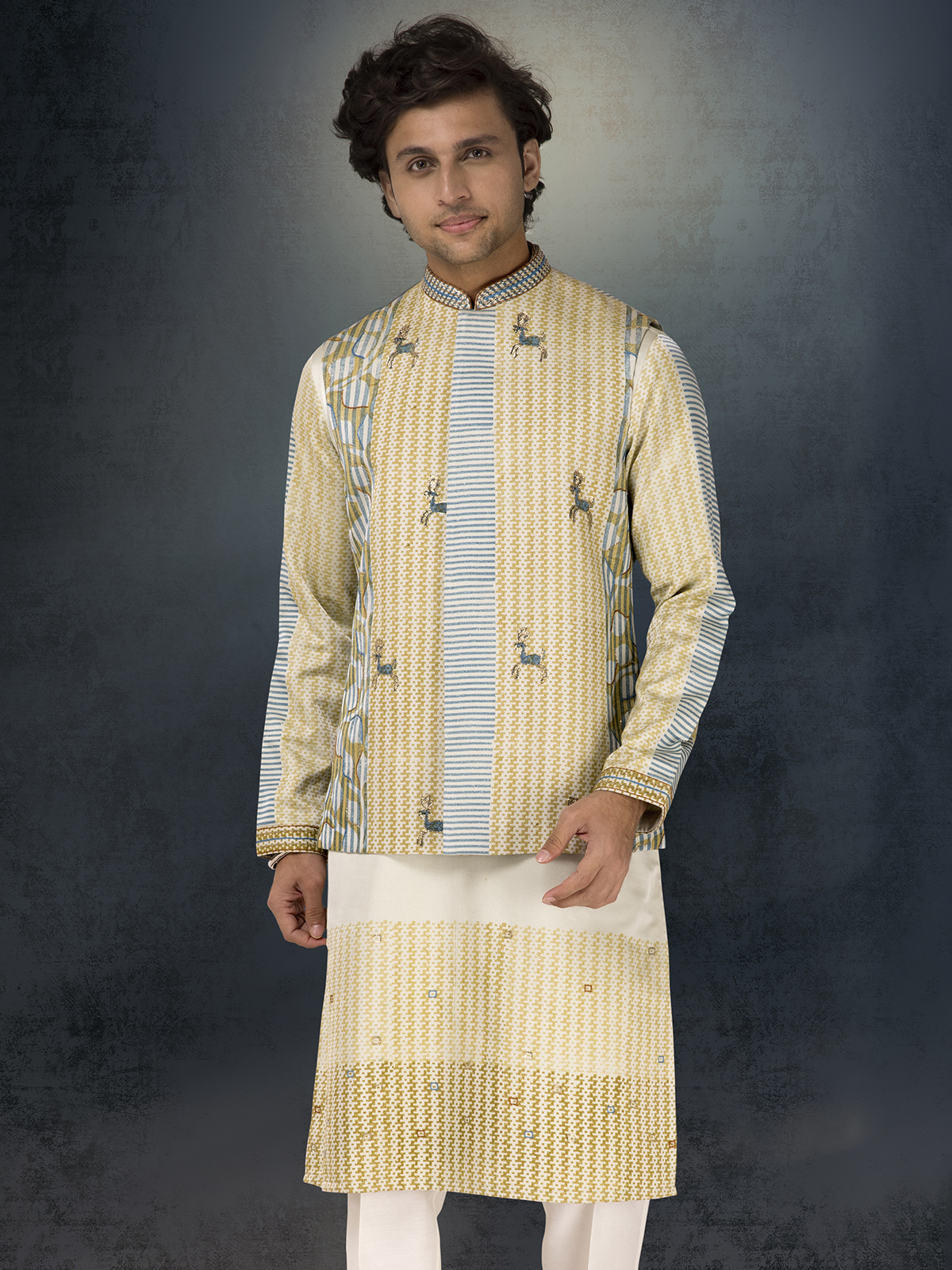 Olive silk lends organic allure to this printed waistcoat set adorned with resham and thread work. Its earthy tone celebrates balance and quiet sophistication, ideal for weddings or evening gatherings. Completed with a pant, it echoes refined artistry and grounded charm.