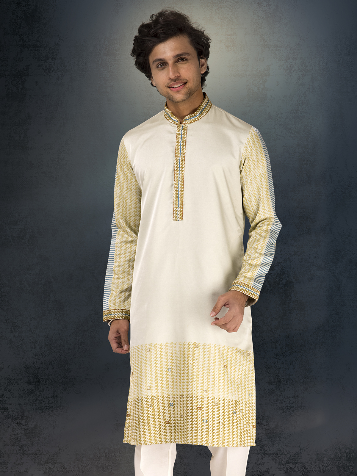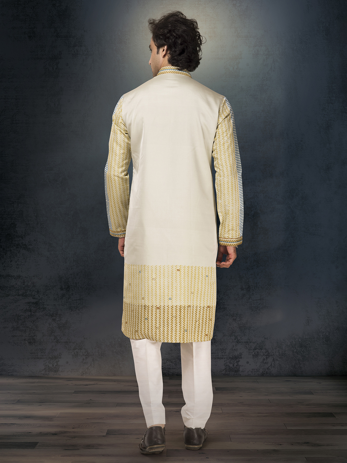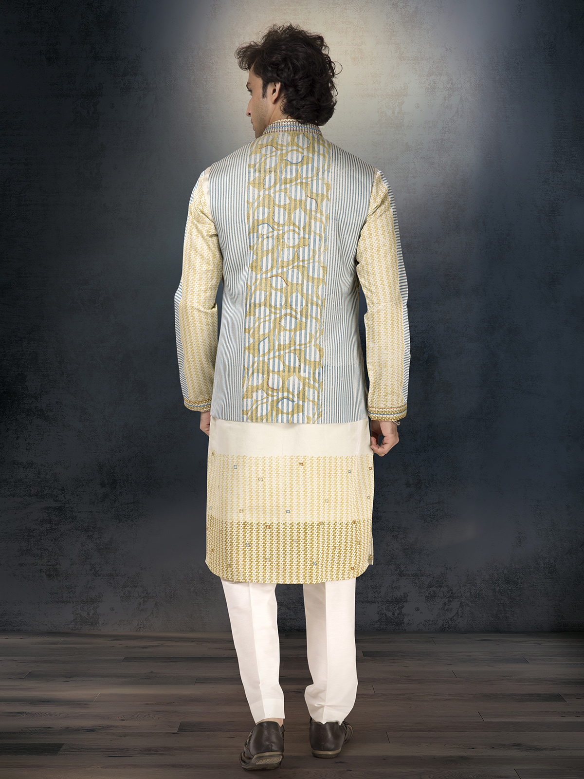 Olive silk lends organic allure to this printed waistcoat set adorned with resham and thread work. Its earthy tone celebrates balance and quiet sophistication, ideal for weddings or evening gatherings. Completed with a pant, it echoes refined artistry and grounded charm.