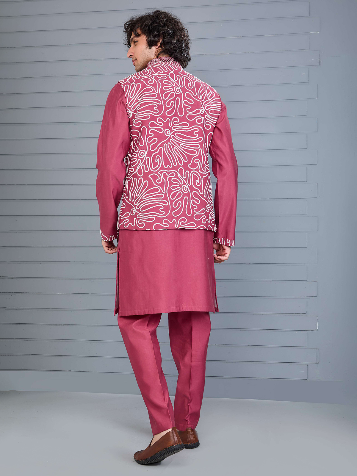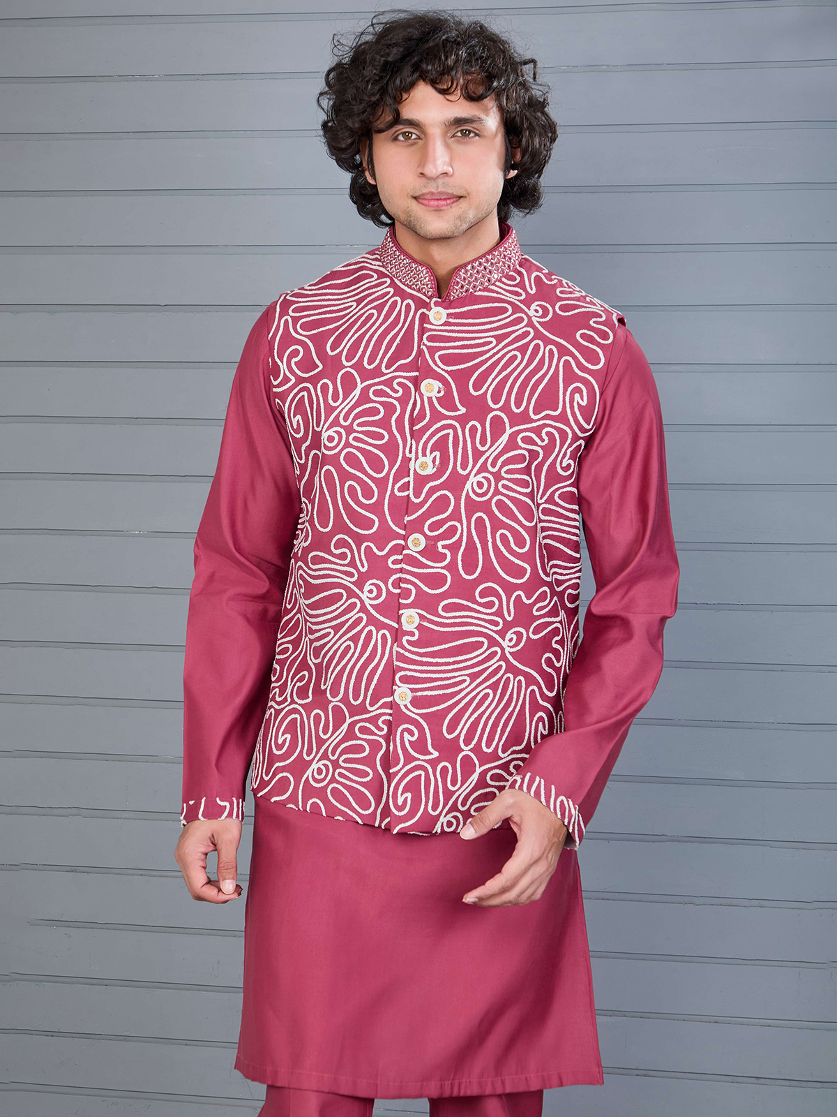 Crafted in elegant onion pink silk, this waistcoat is adorned with refined aabla and thread work. Featuring a Chinese collar and paired with a tailored pant, it adds subtle festive shimmer to weddings, celebrations and evening receptions.