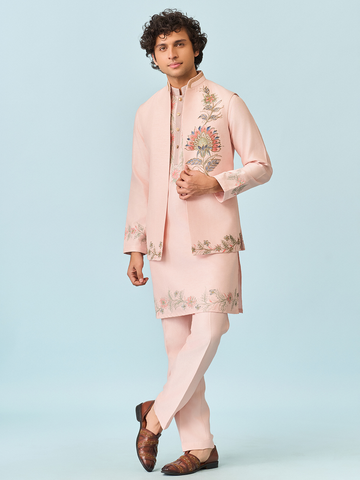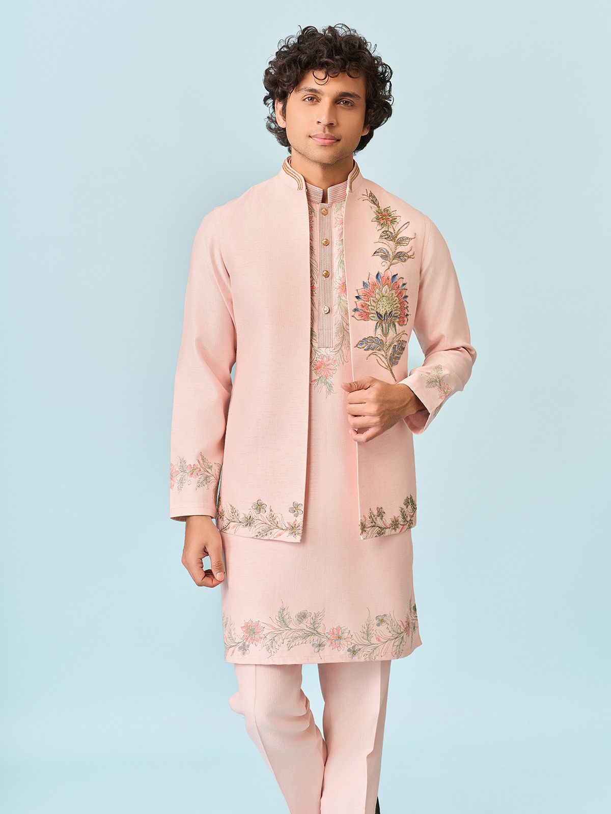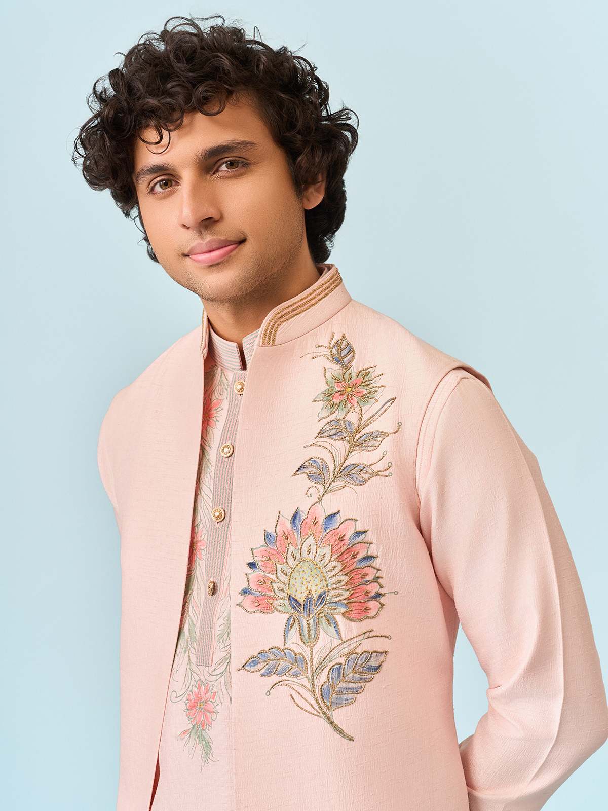 This elegant men's waistcoat set in a soft peach hue is crafted from luxurious silk, showcasing a vibrant multi-coloured hand-printed flower design. the ensemble is enriched with delicate cutdana and zari work, adding a touch of sophistication. the kurta's hem features a matching hand-printed pattern, while the waistcoat collar is adorned with intricate cutdana work. this set includes a chic waistcoat, a stunning kurta, and matching pants, making it a perfect choice for festive gatherings.