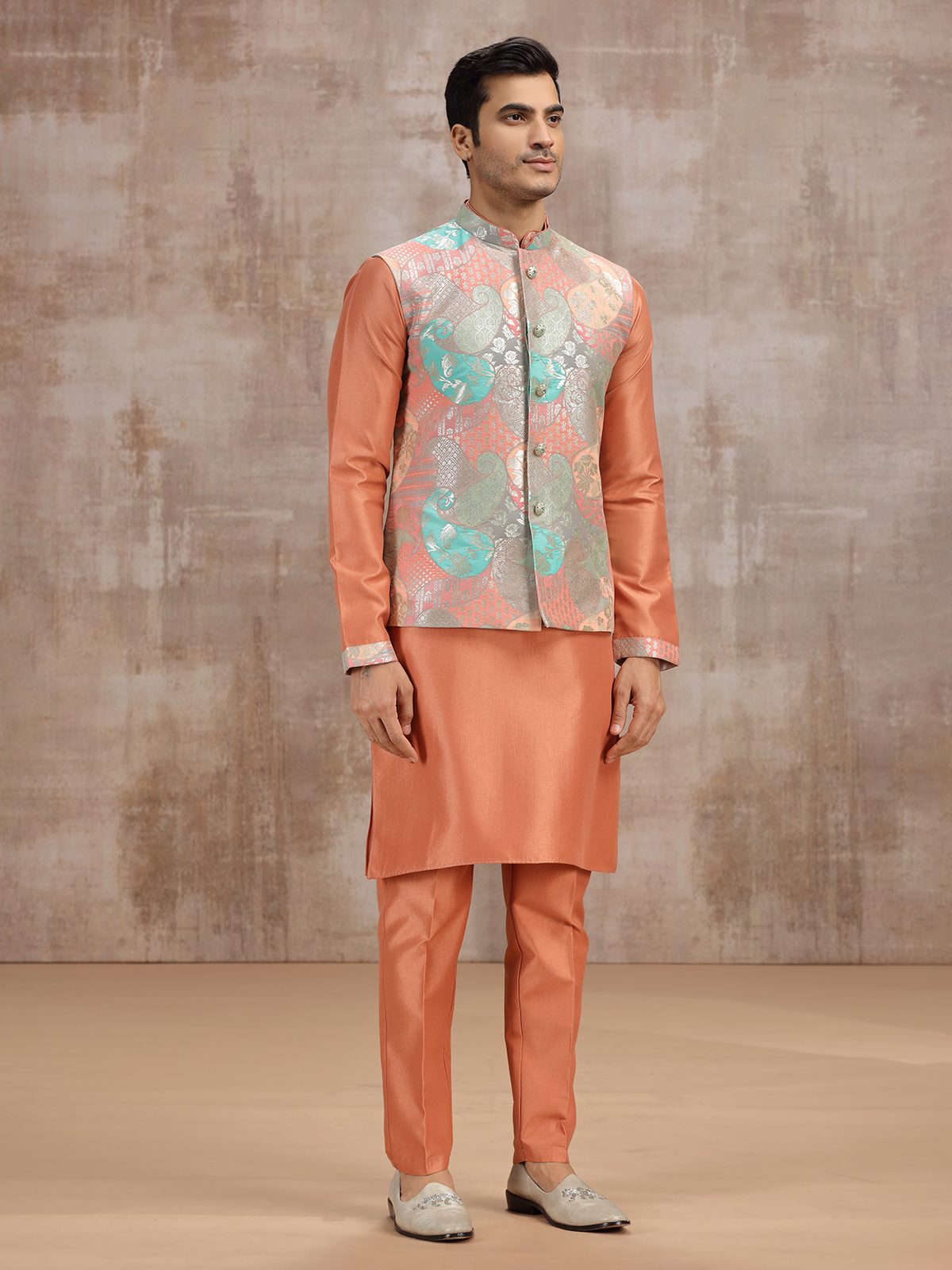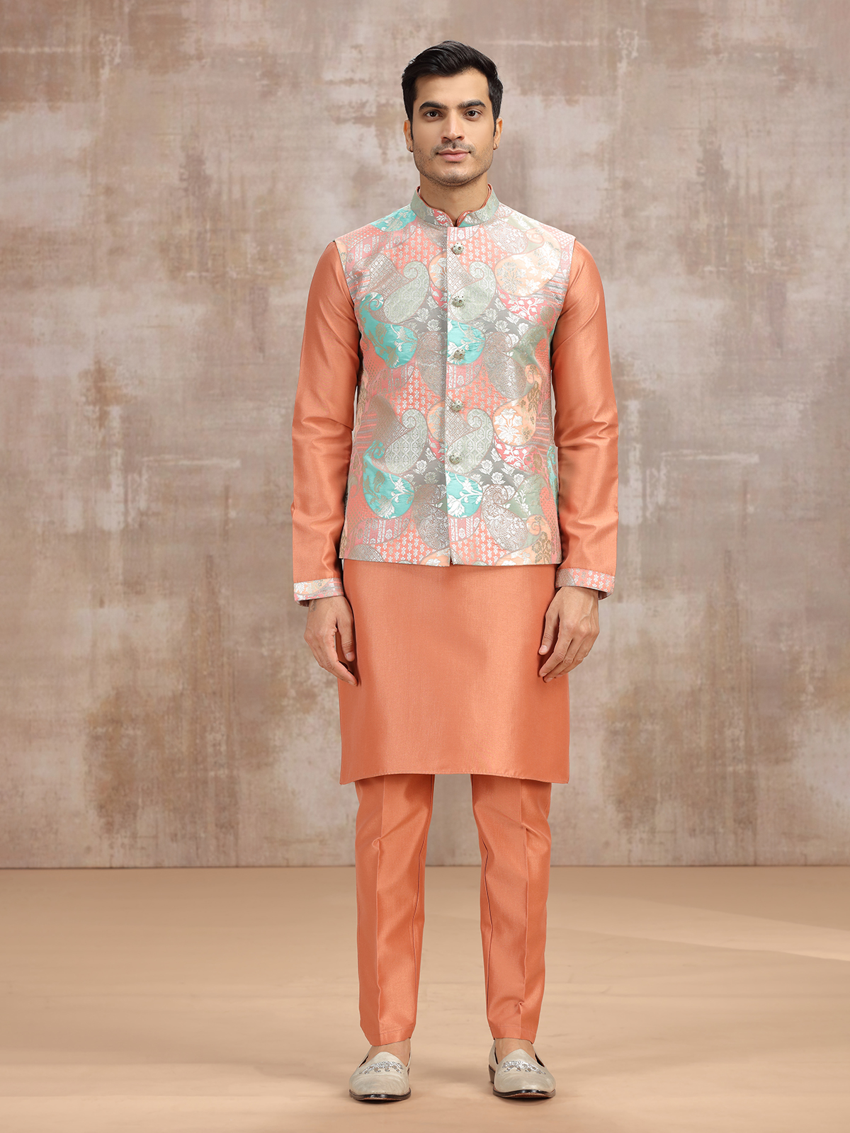 In peach silk, zari detailing enhances this printed waistcoat set with delicate artistry. The ensemble includes a full sleeve kurta with stand collar, paired with a sleeveless waistcoat and pant. Perfect for weddings and receptions, it reflects gentle refinement, where traditional craftsmanship blends gracefully with soft color tones.