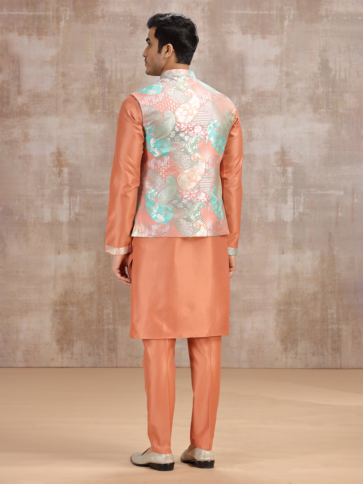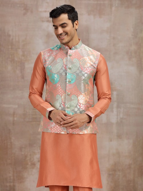 Peach Printed Silk Waistcoat Set For Festivals