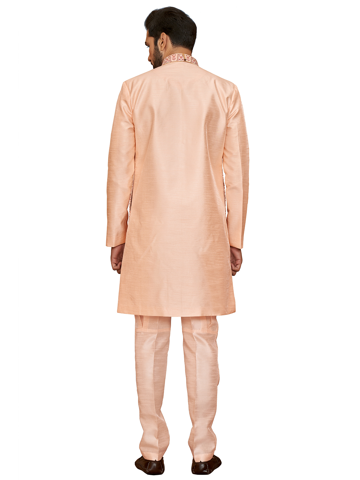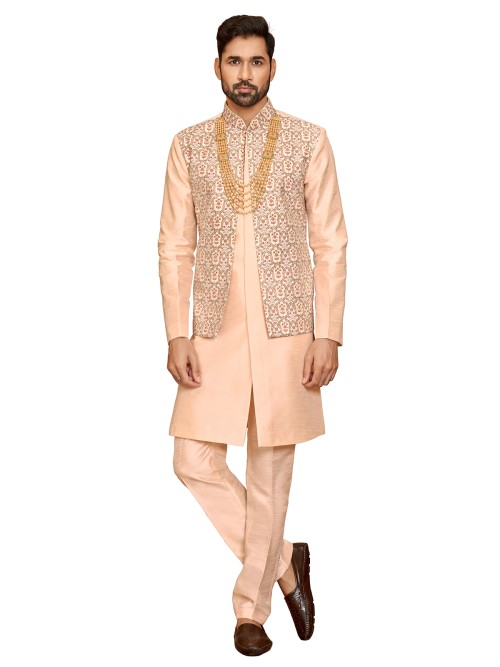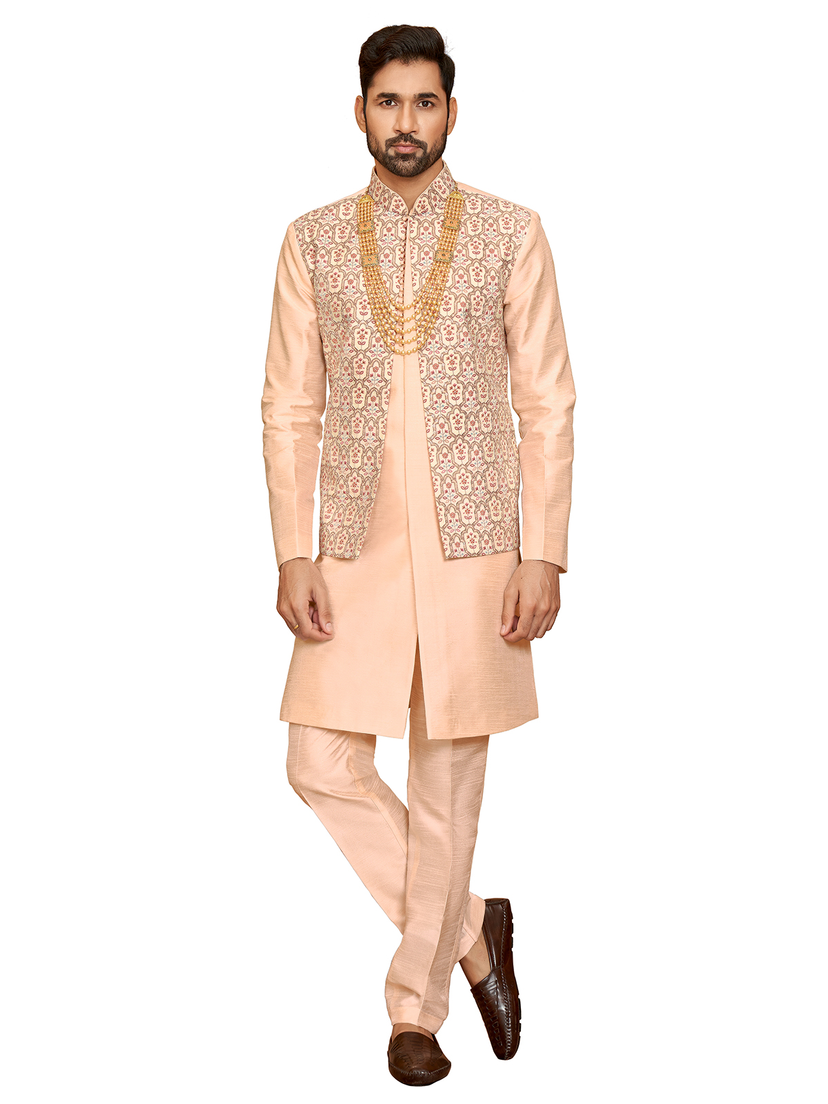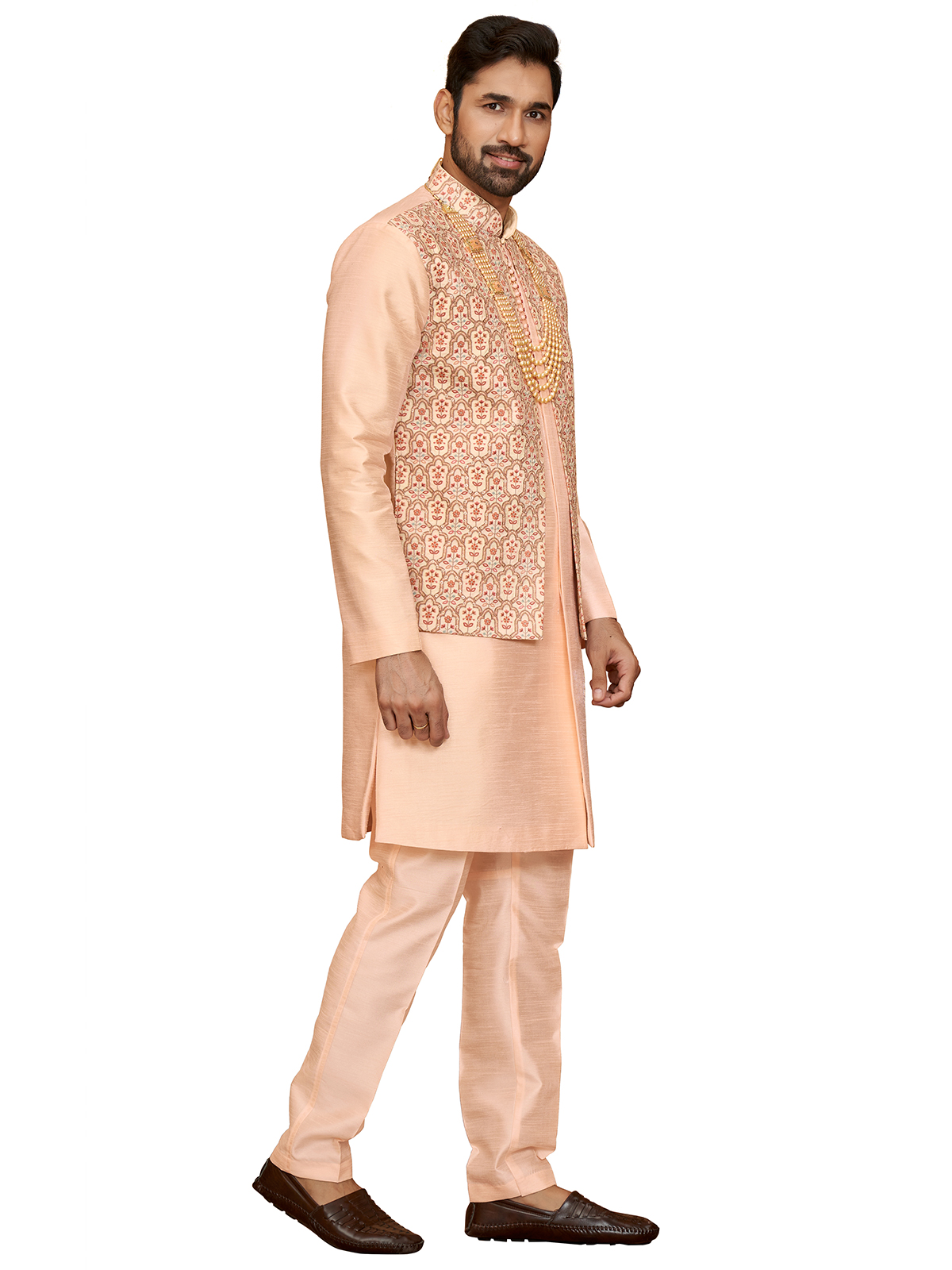 Make a statement at any traditional event with this stunning peach silk waistcoat set. The intricate zardosi, sequins and resham work on the waistcoat create a luxurious look, complemented by the mandarin collar and full sleeves. This set comes with a bottom to complete the ensemble.