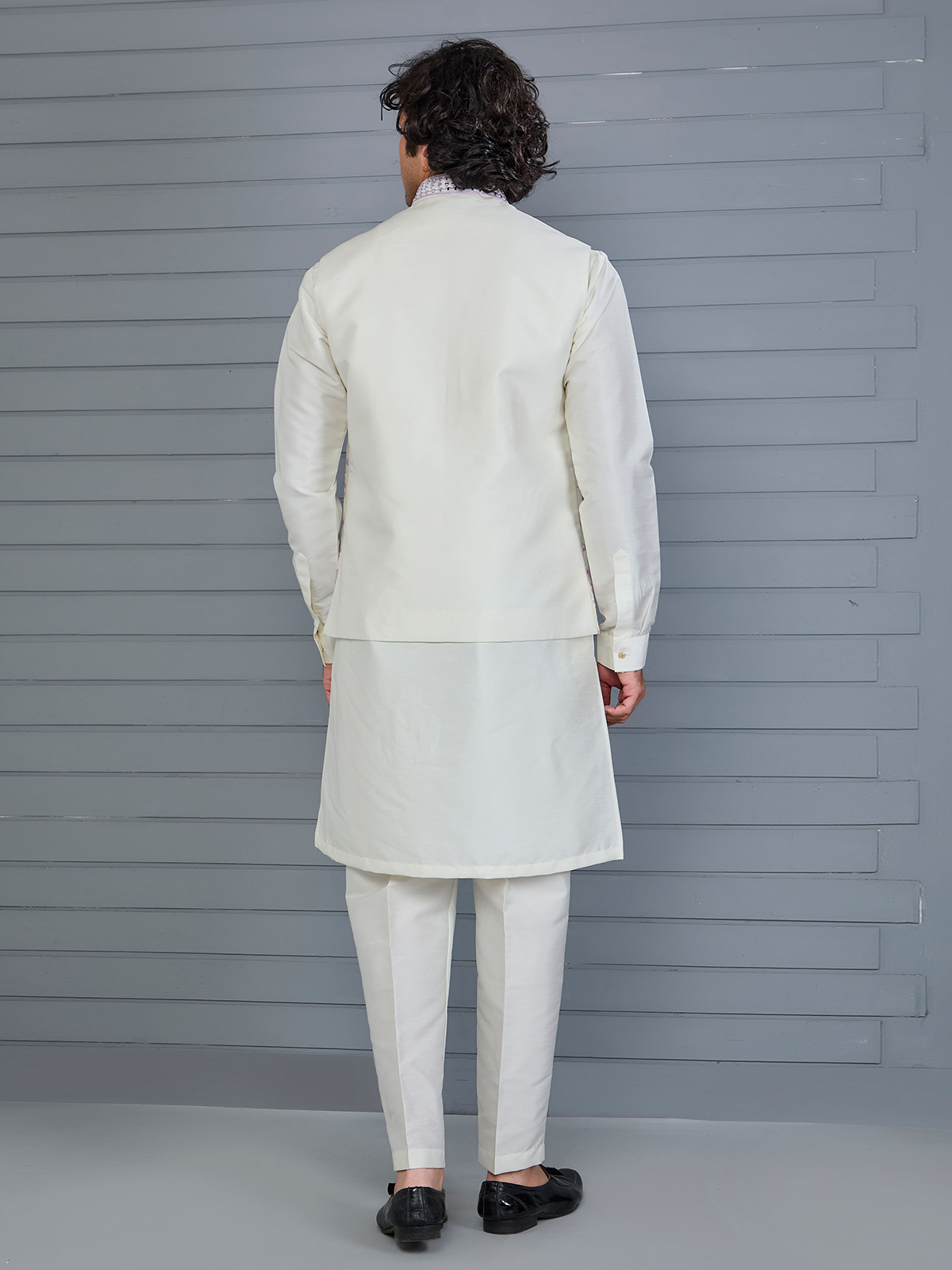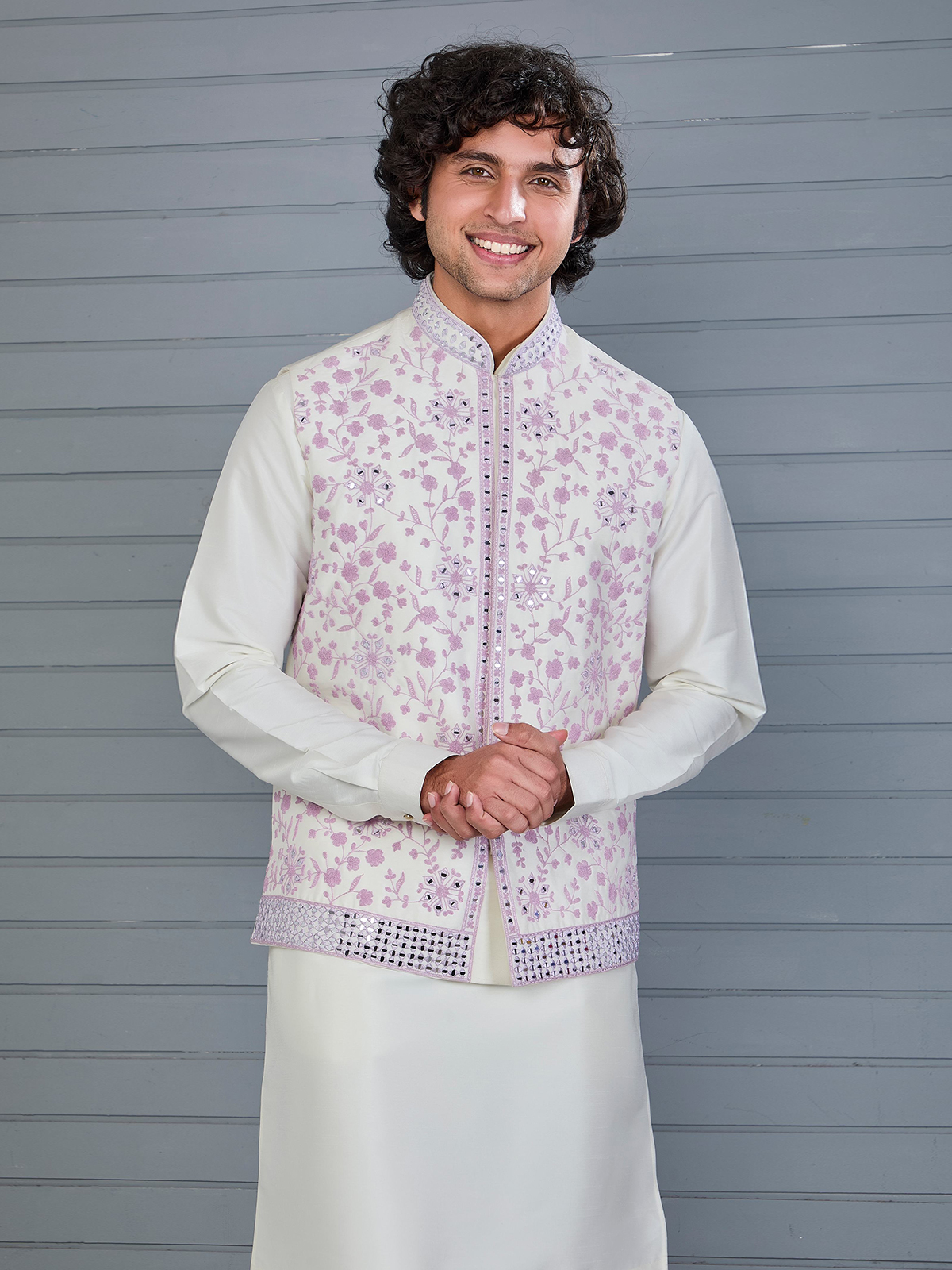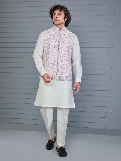 This pink and off-white silk waistcoat features refined embroidery highlighted with aabla detailing. Finished with a Chinese collar and matching pant, it creates a balanced festive look suited for weddings and traditional celebrations.