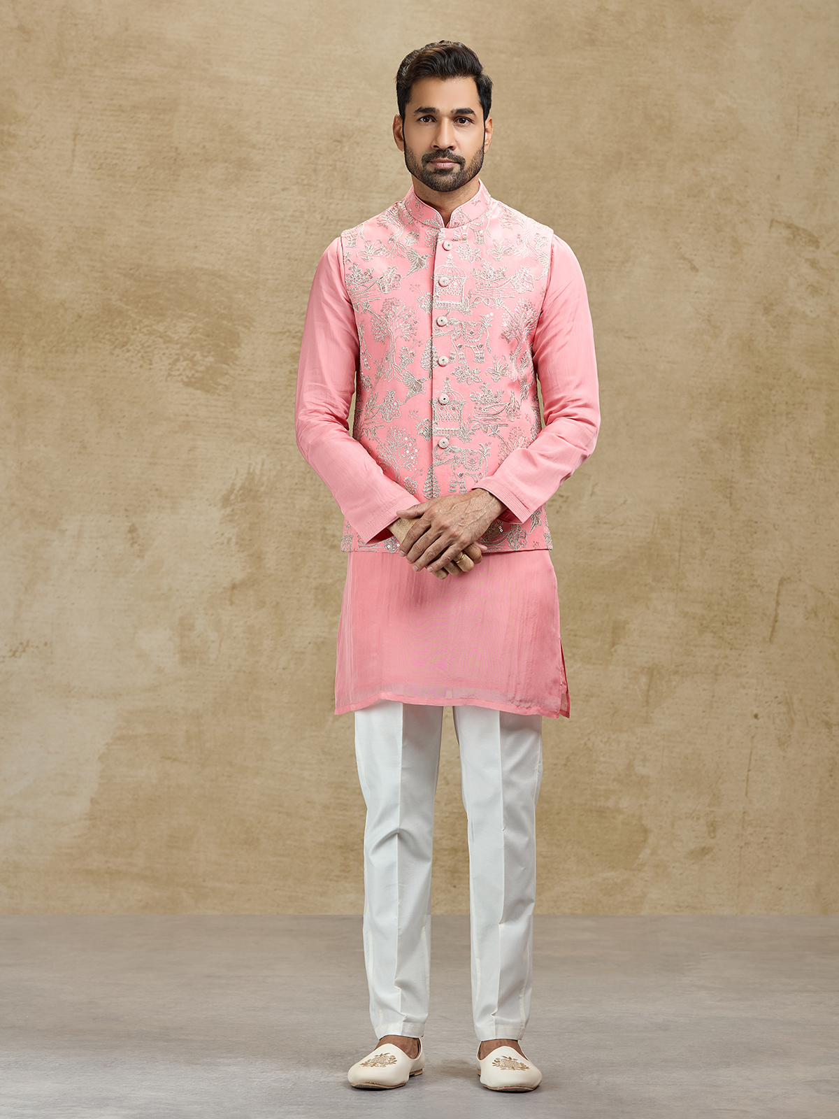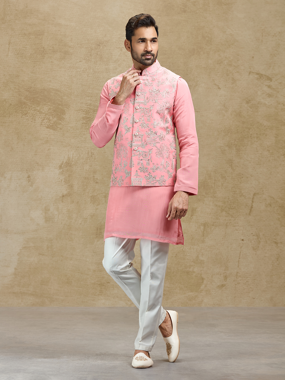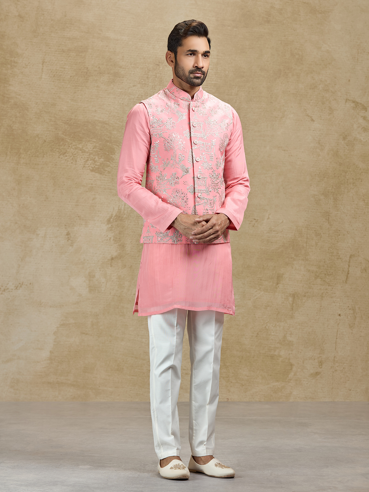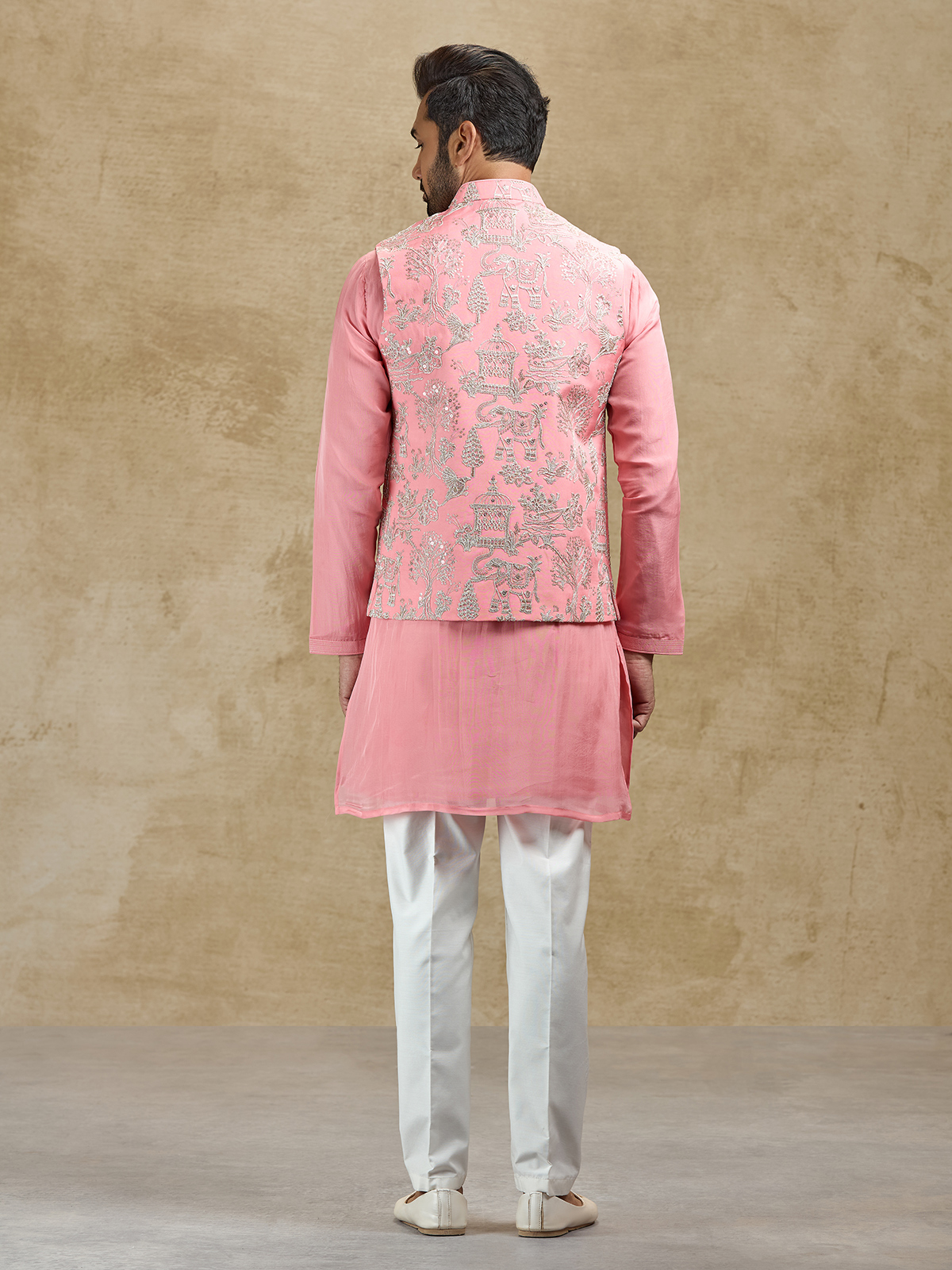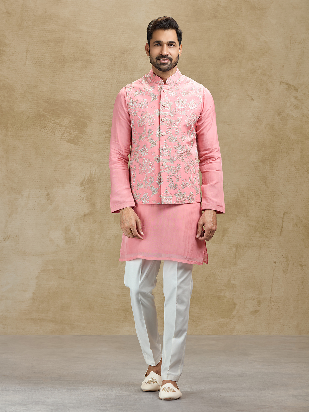 Pink Silk Resham Sequins Waistcoat Kurta Set For Men