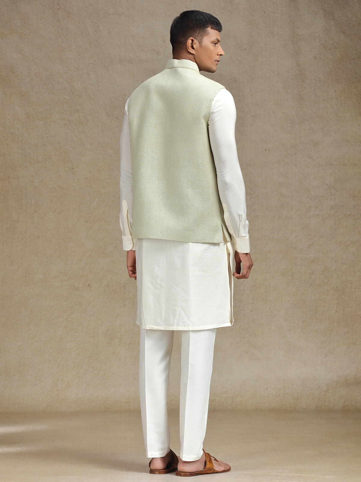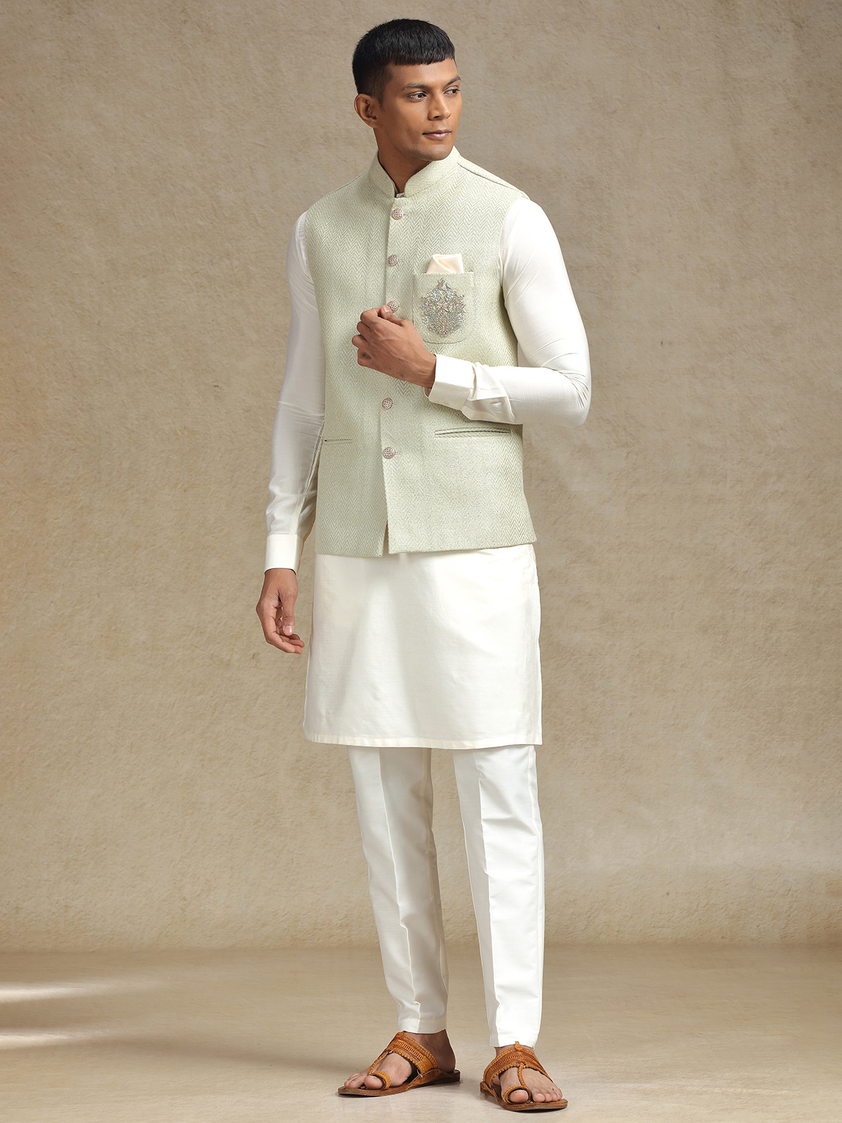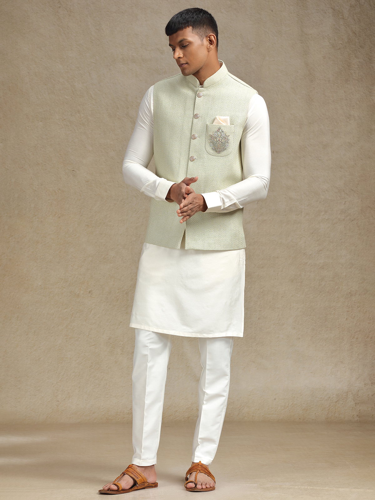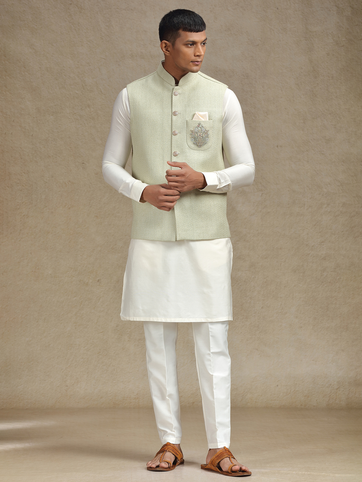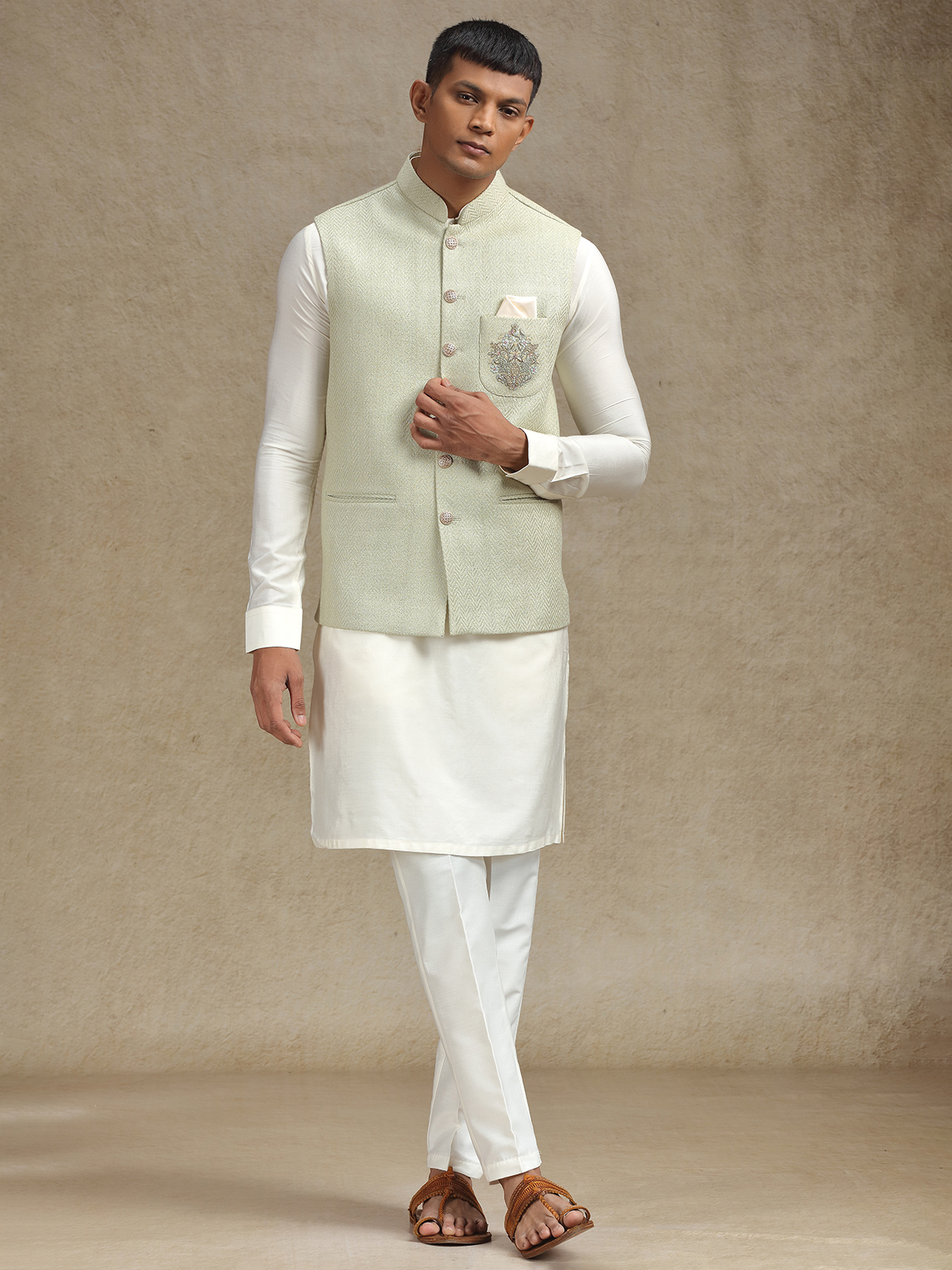 Step into any wedding or festival confidently with this pista green silk waistcoat set for men. Adorned with delicate zardosi, beads, sequins, and cutdana details, it radiates festive elegance. The mandarin collar adds a modern silhouette, while the matching pants ensure you stand out effortlessly.
