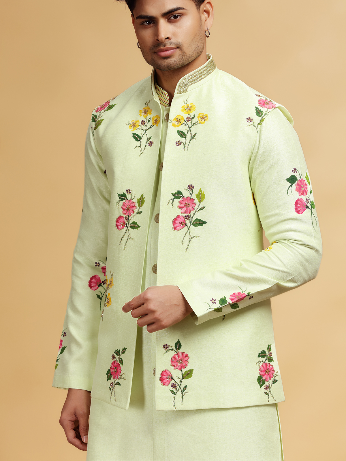 This pista green silk waistcoat set reveals intricate hand printing enriched with cutdana, bead, and sequin detailing. The sleeveless waistcoat with a structured chinese collar and full-sleeve kurta merges tradition and contemporary appeal. Paired with pants, it is ideal for festive and grand celebrations.