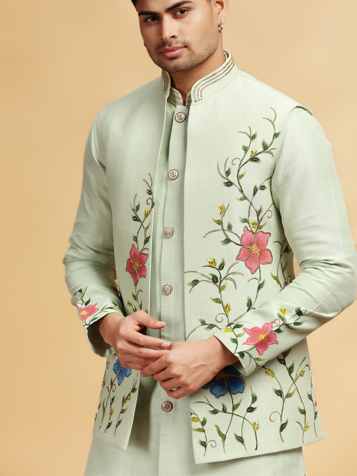 In soothing pista green silk, this hand-printed waistcoat set glows with festive brilliance from cutdana, bead, and sequin embellishments. The sleeveless waistcoat with a structured chinese collar and full-sleeve kurta reflects stately charm. Completed with refined pants, it defines graceful wedding elegance.