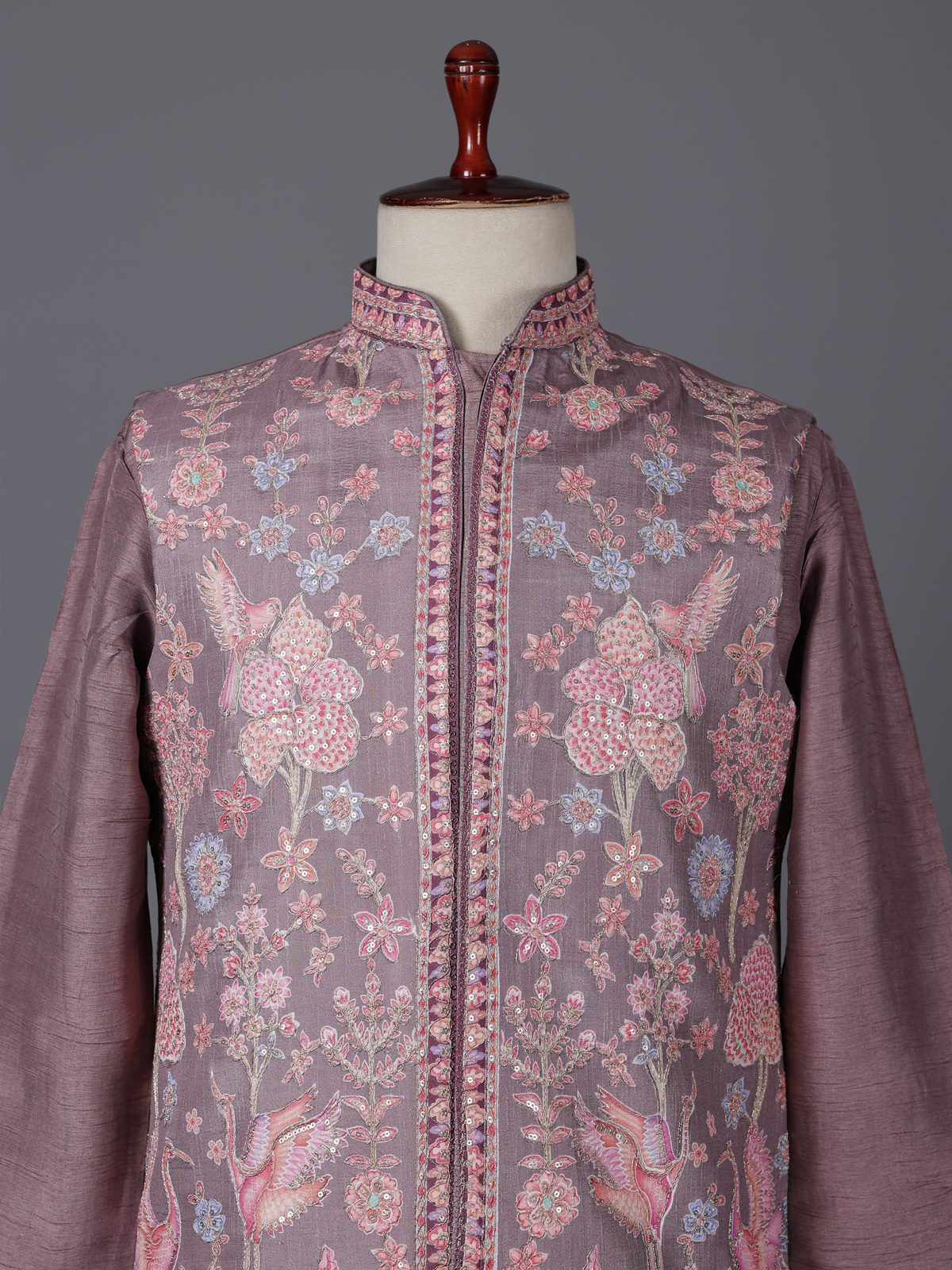 Rich purple bring regal elegance to this silk waistcoat set designed for grand celebrations. The kurta features a refined chinese collar, paired with a beautifully crafted waistcoat adorned with resham and sequin embellishments that add graceful shimmer. Completed with tailored pants, the ensemble creates a sophisticated ethnic silhouette perfect for weddings, receptions, sangeet functions and festive occasions.