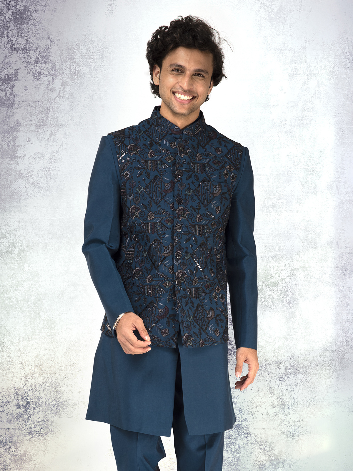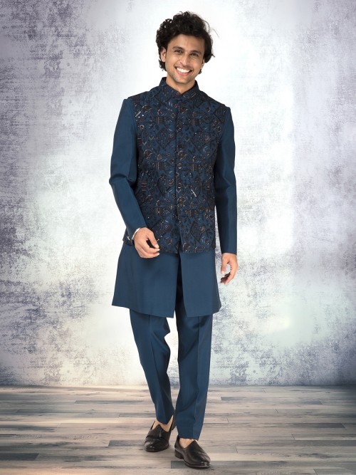 Vibrant and poised, this rama blue silk waistcoat set sparkles with embroidery and sequins work. The lustrous texture and bold hue radiate festive grandeur. Complemented with a pant, it’s ideal for receptions and wedding celebrations filled with splendor.