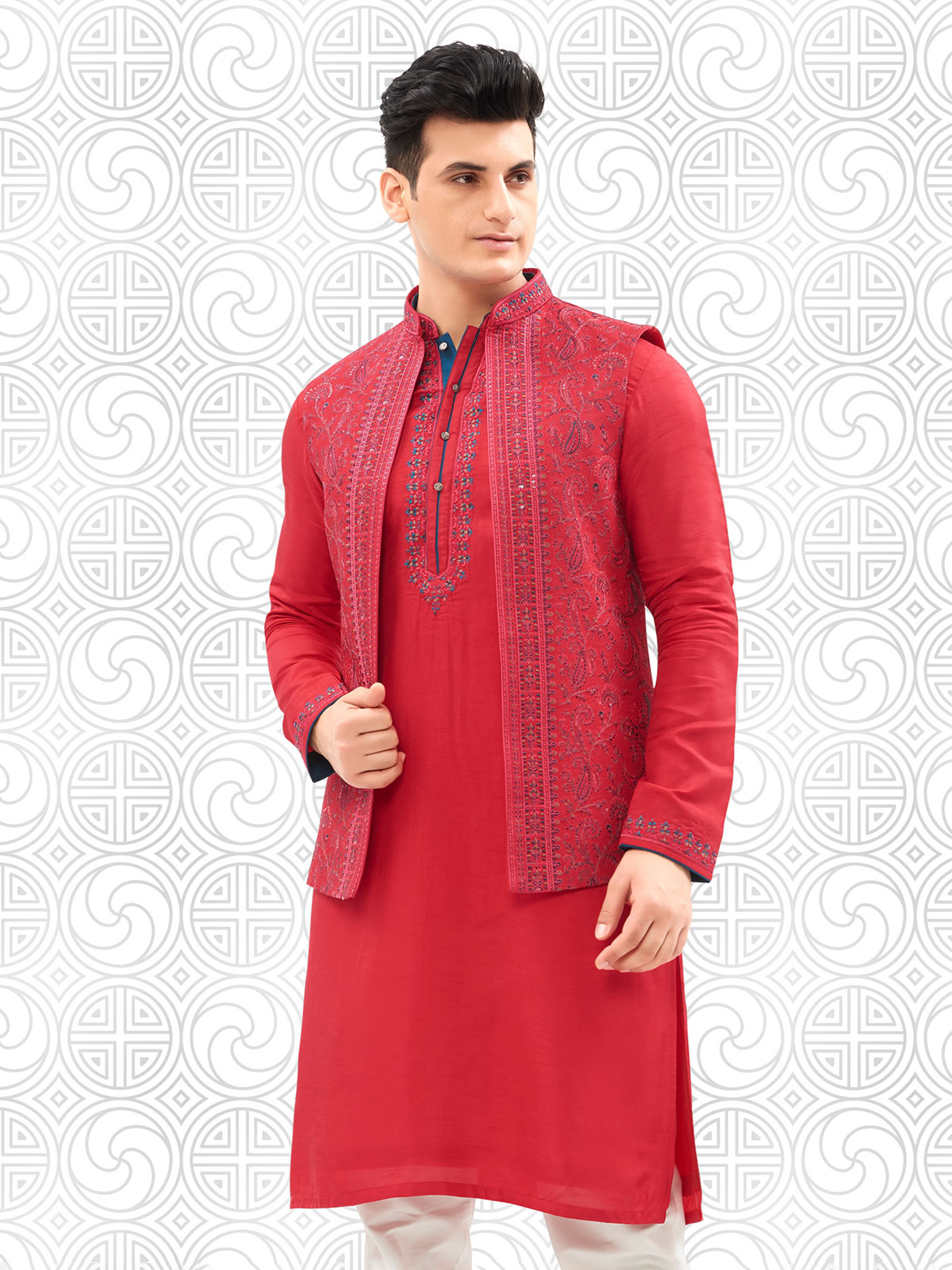 This waistcoat set with its amazing embroidery and sequins work over cotton fabric is a great choice for any ethnic gathering because red is the color of choice. Additionally, this one has a matching bottom.