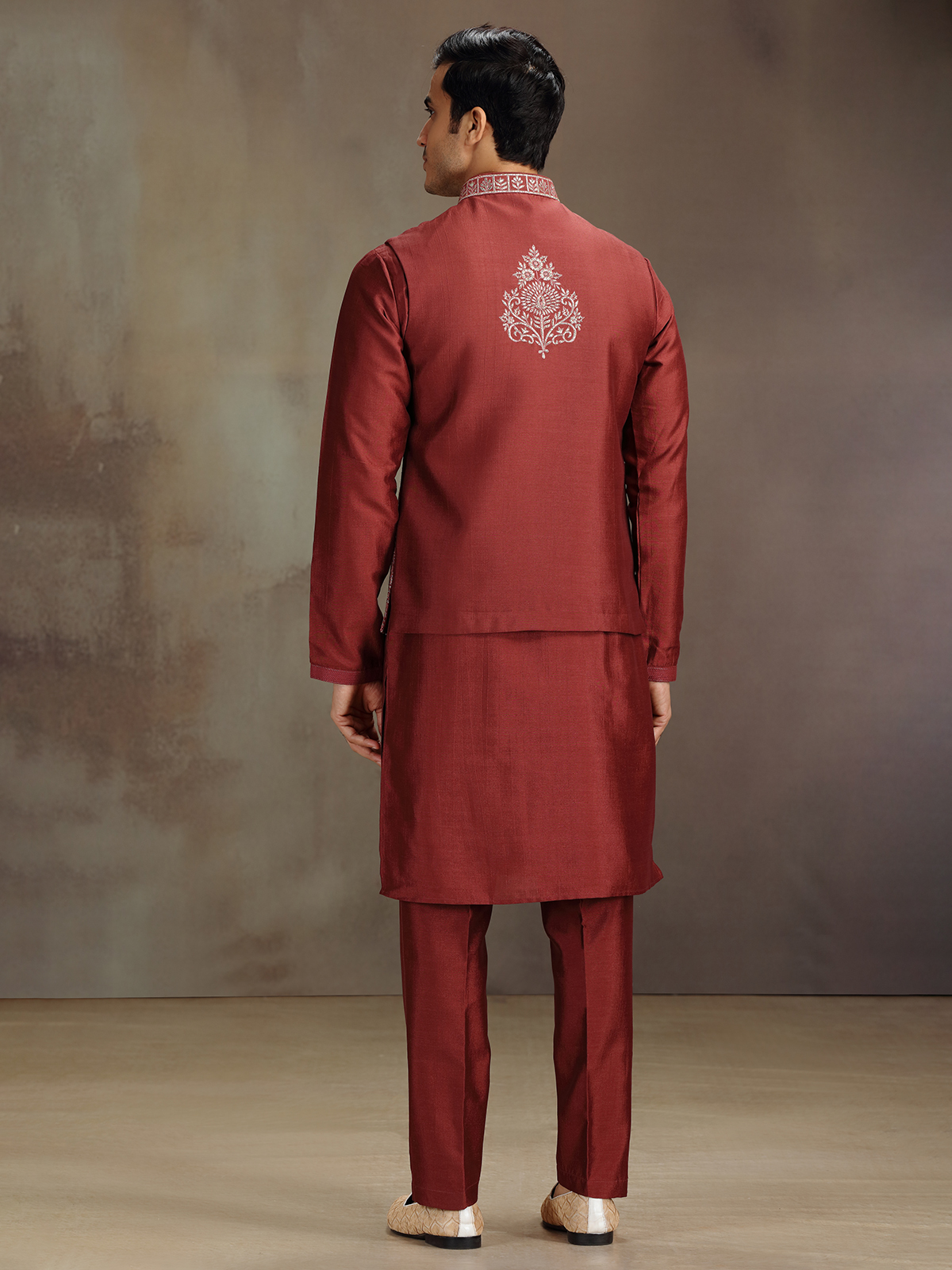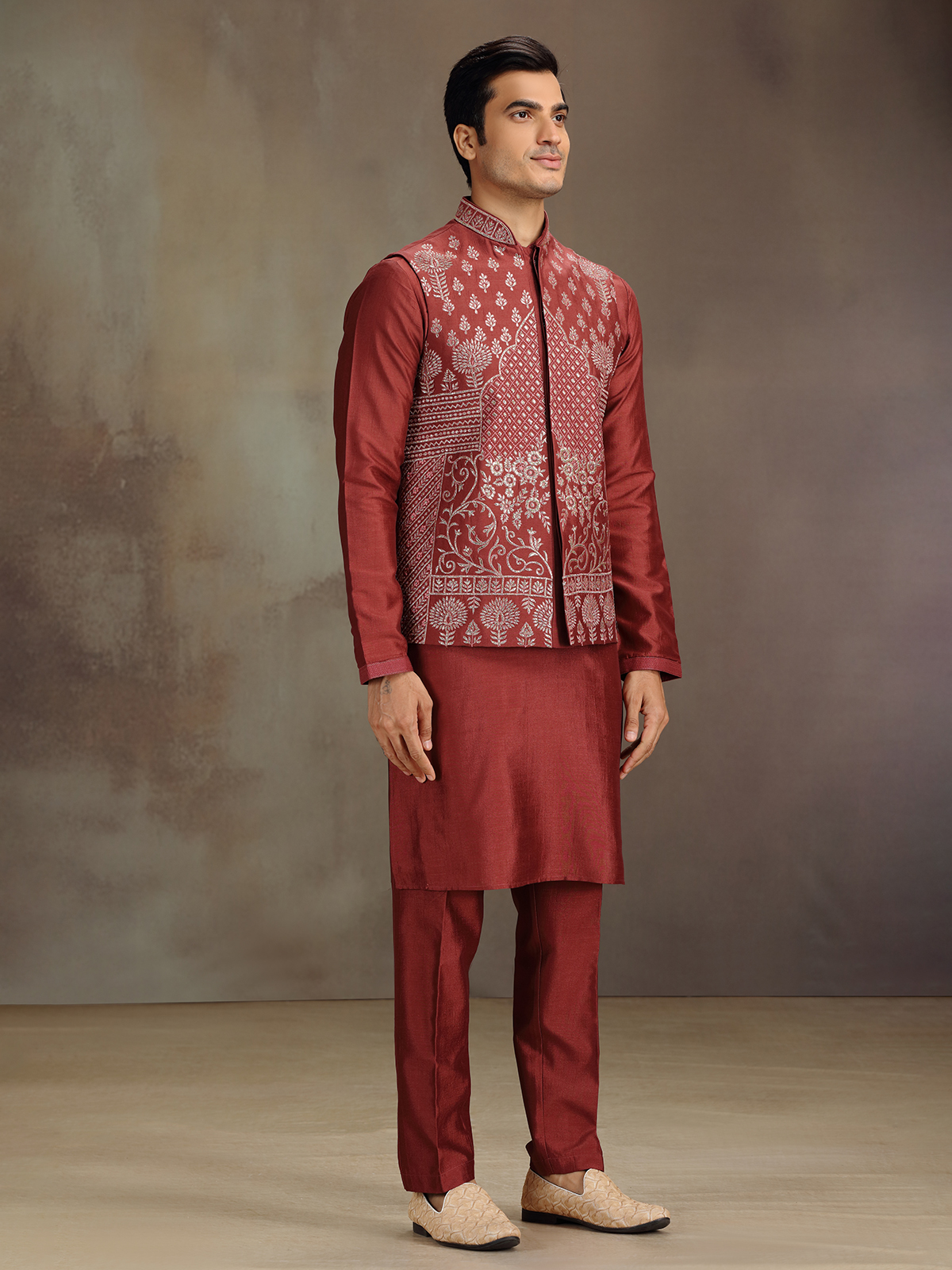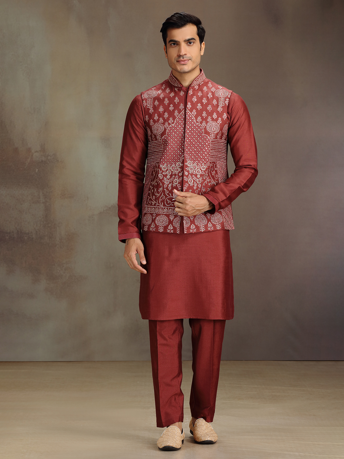 In deep red cotton silk, this waistcoat set enchants with delicate embroidery. The sleeveless waistcoat overlays a full-sleeve kurta with a chinese collar, creating a refined festive aura. Teamed with pant for a look of understated grandeur.