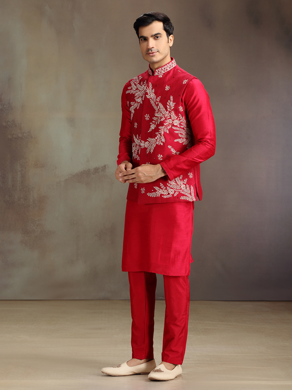 Make your wedding appeal bold and dashing with red silk, this waistcoat set glistens with embroidery and sequins. The sleeveless waistcoat paired with a full-sleeve, chinese-collared kurta channels festive allure. Comes with pant, making it ideal for wedding revelries.