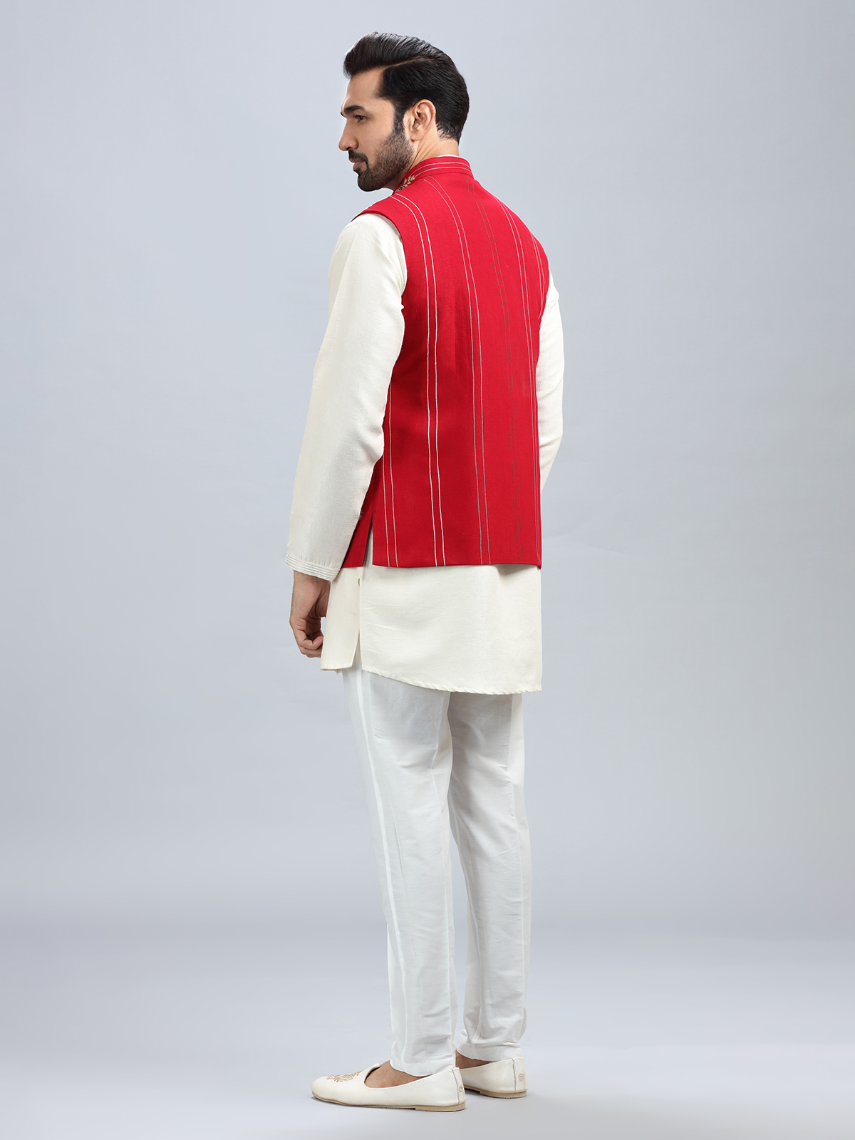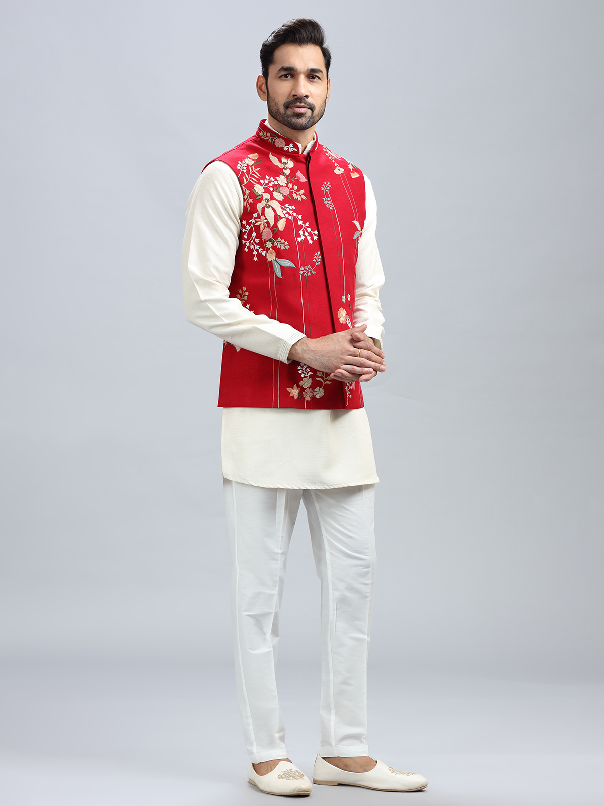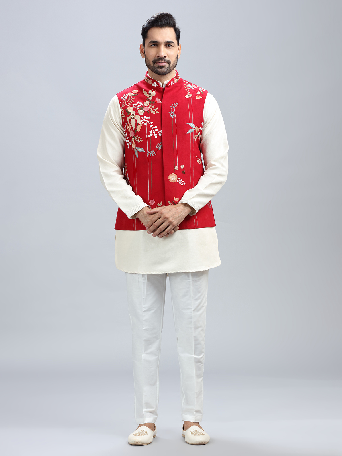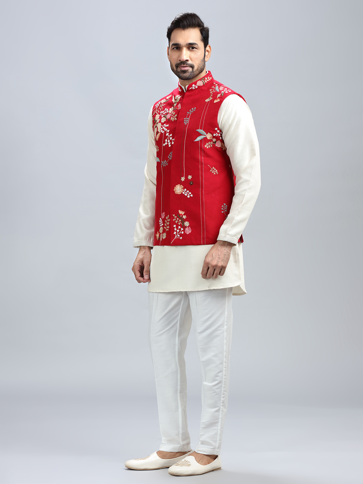 The unique embroidery and red silk waistcoat combo is a really stylish option for a wedding. also includes a matching bottom.