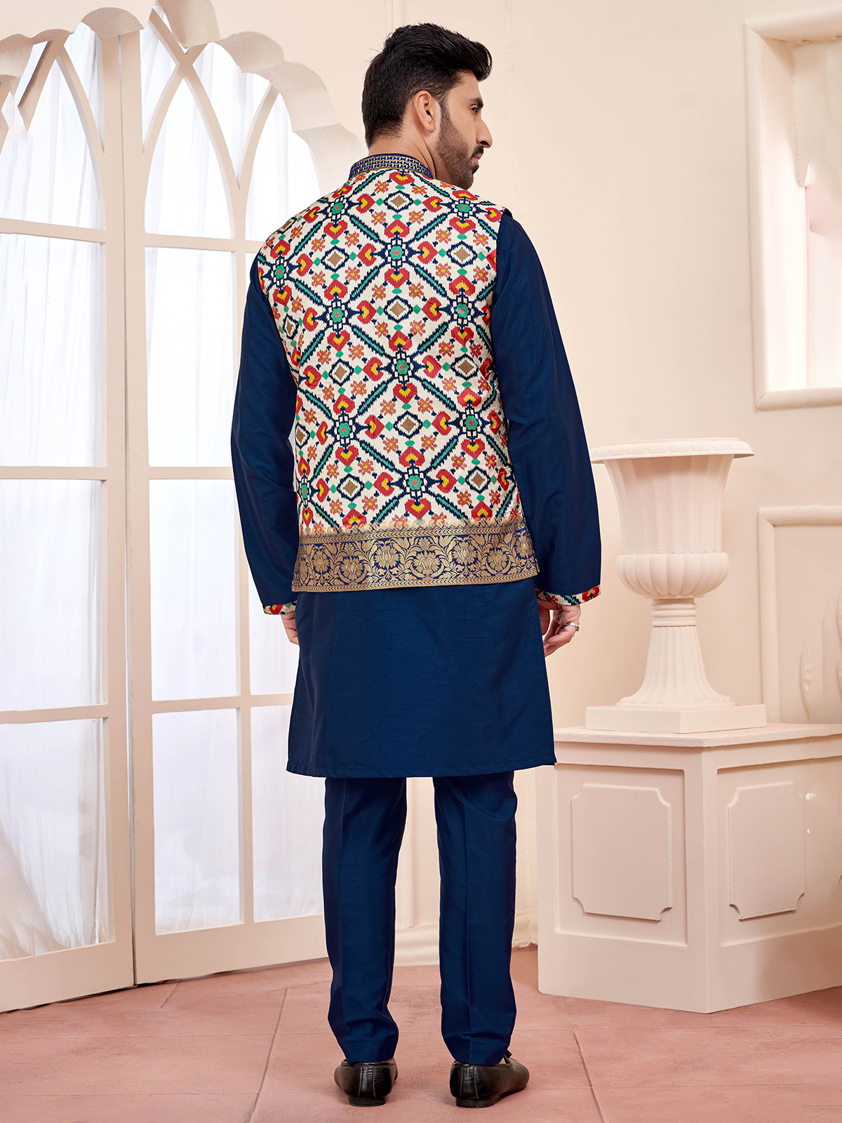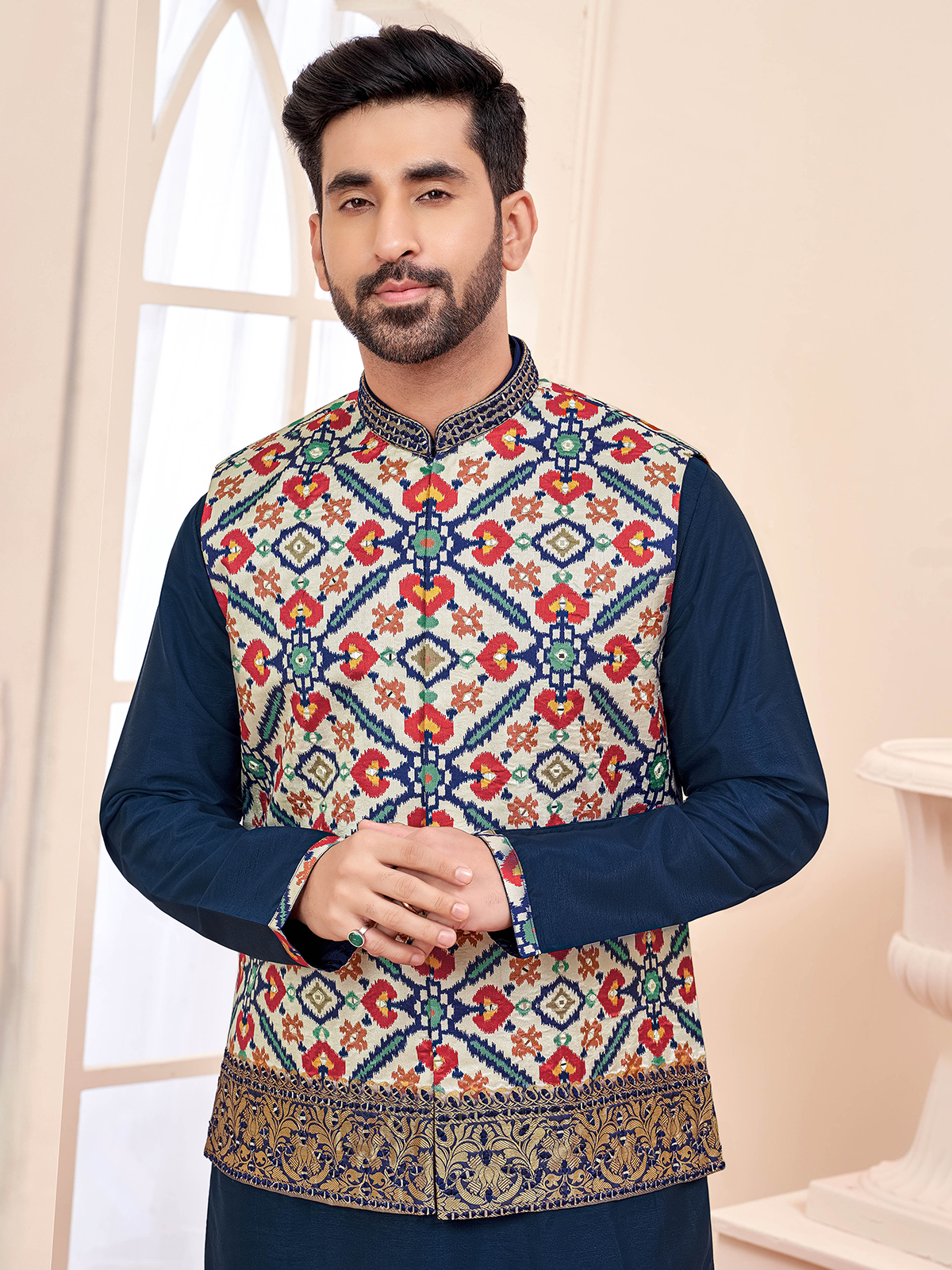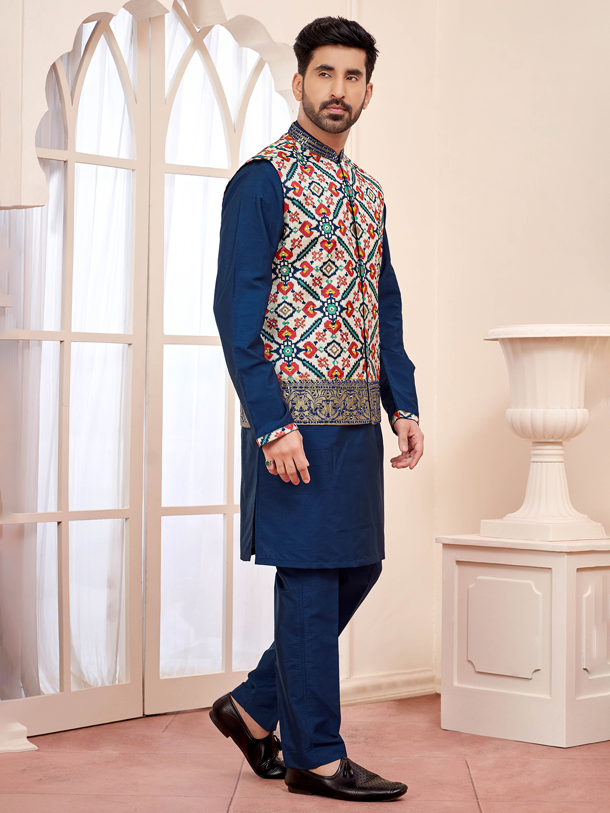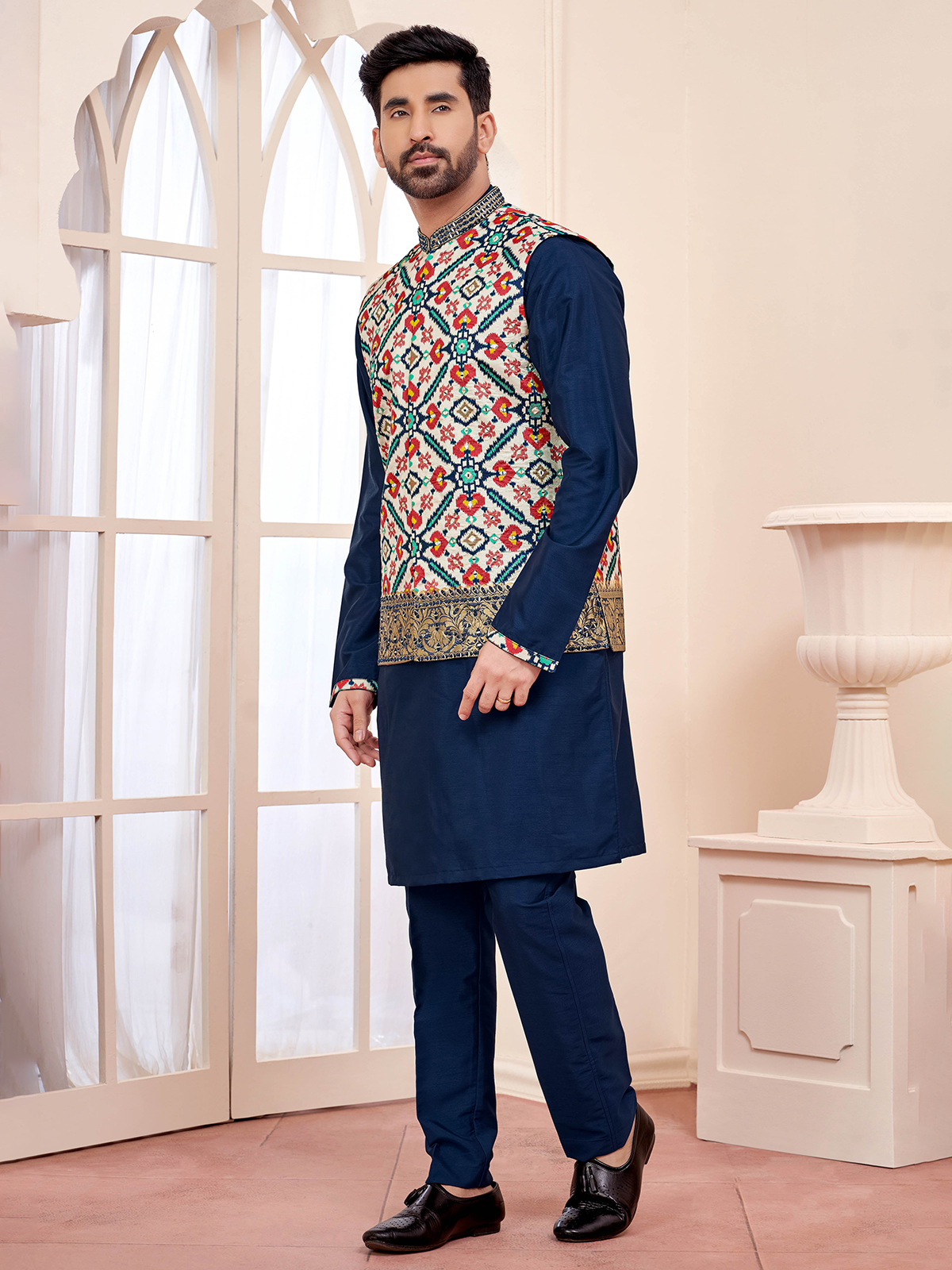 Step into any wedding or festival with style in this indigo blue silk waistcoat set for men. Adorned with exquisite aabla and zari work, it radiates elegance and festive charm. The printed design offers a unique twist, while the mandarin collar adds a modern silhouette. Complete with matching pants, this set ensures you stand out in any crowd.