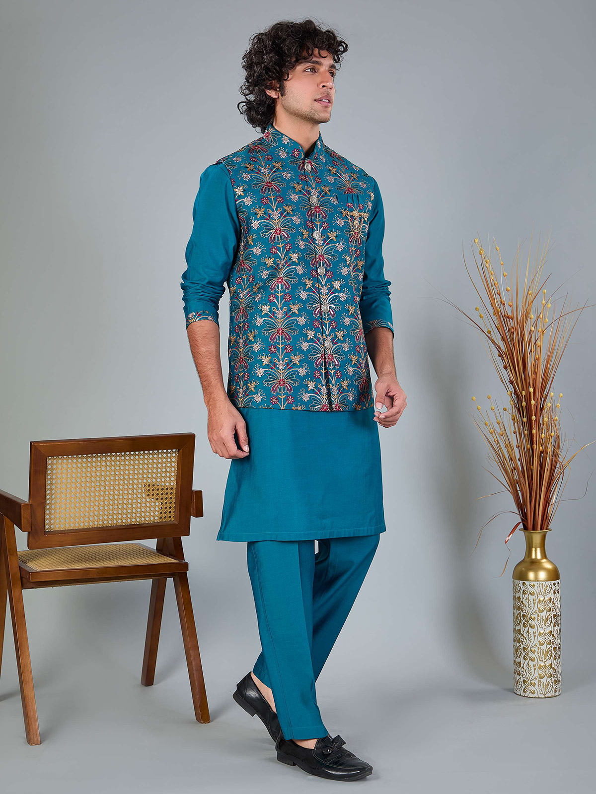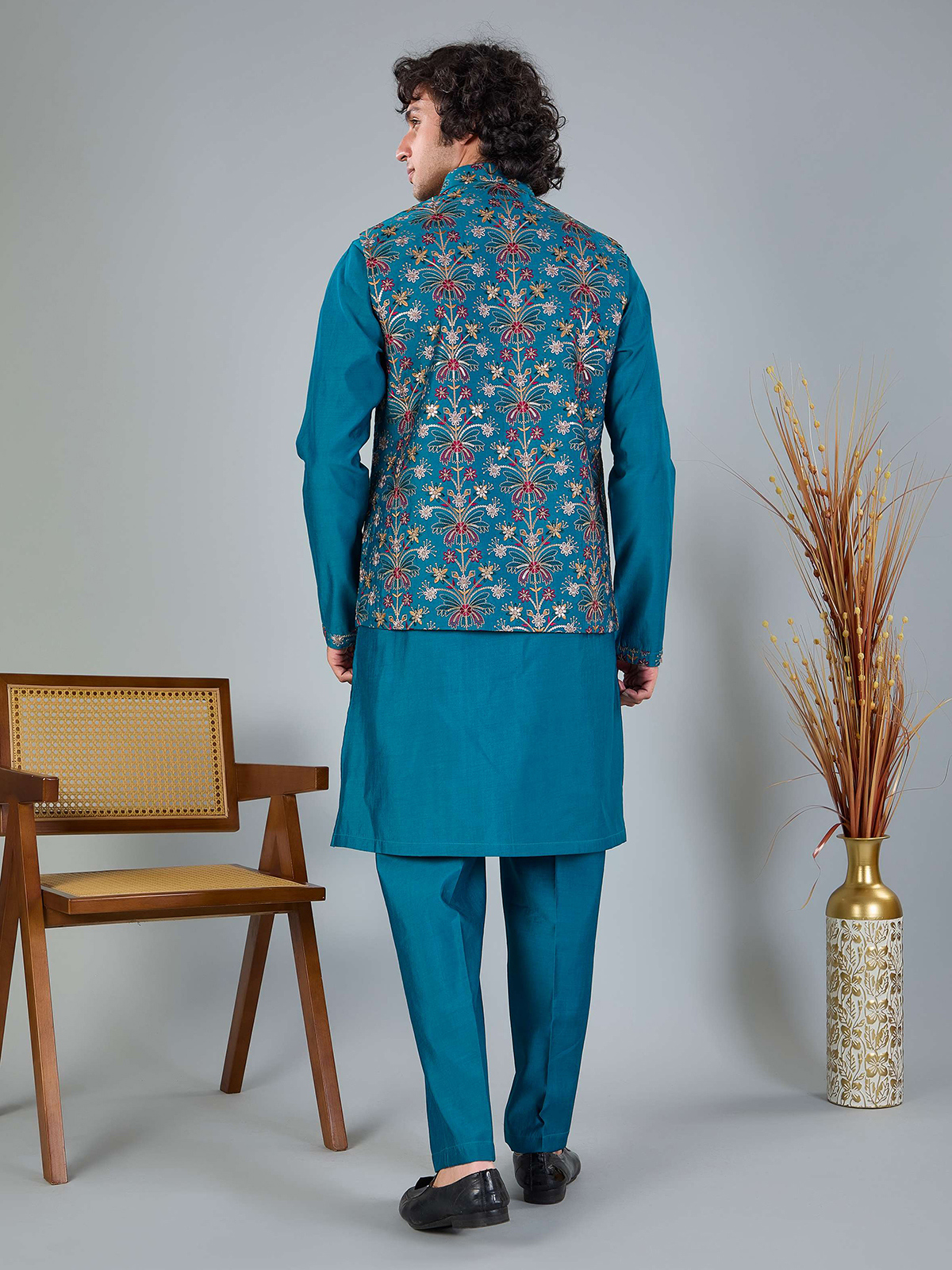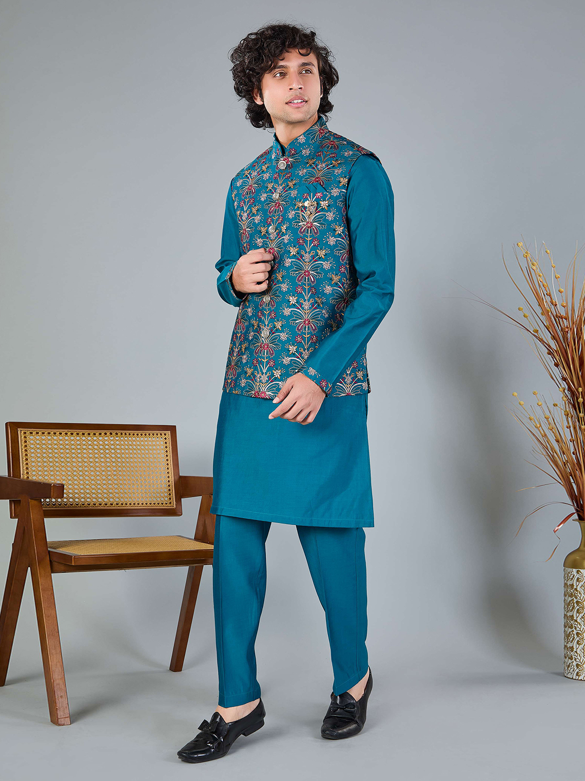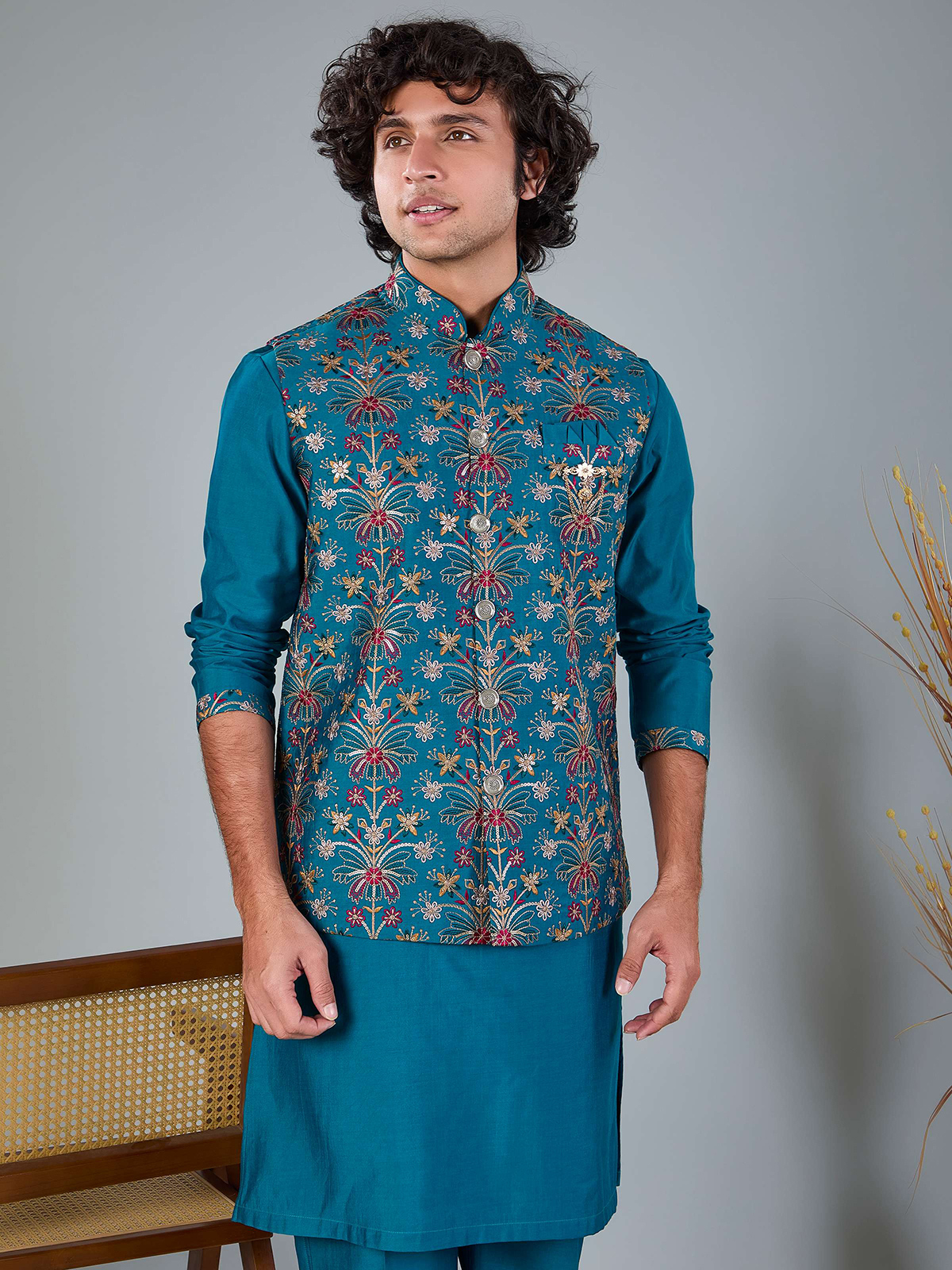 This rich blue silk waistcoat is adorned with fine embroidery and shimmering sequins. Styled with a Chinese collar and coordinated pant, it offers a polished ethnic look for weddings, festive functions and evening receptions.