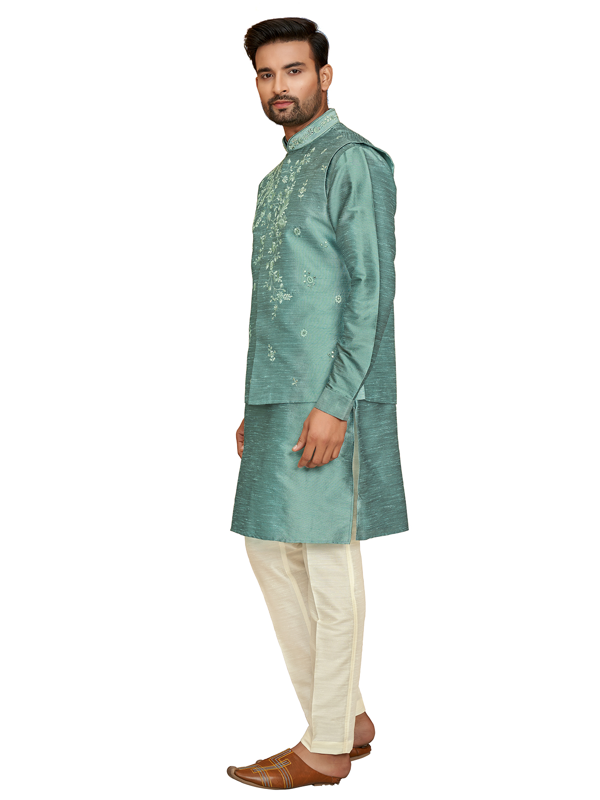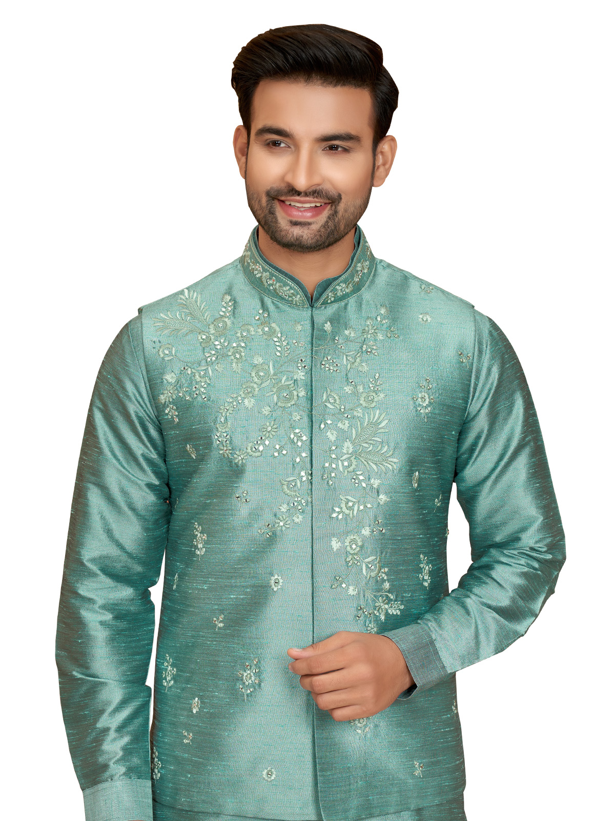Make a statement at your next wedding function with this contemporary sea green silk waistcoat set. Enhanced with embroidery, mirror, and resham work, it has a mandarin collar, full buttoned placket, and welt pocket with pocket tie. Comes with a full sleeves kurta and bottom.