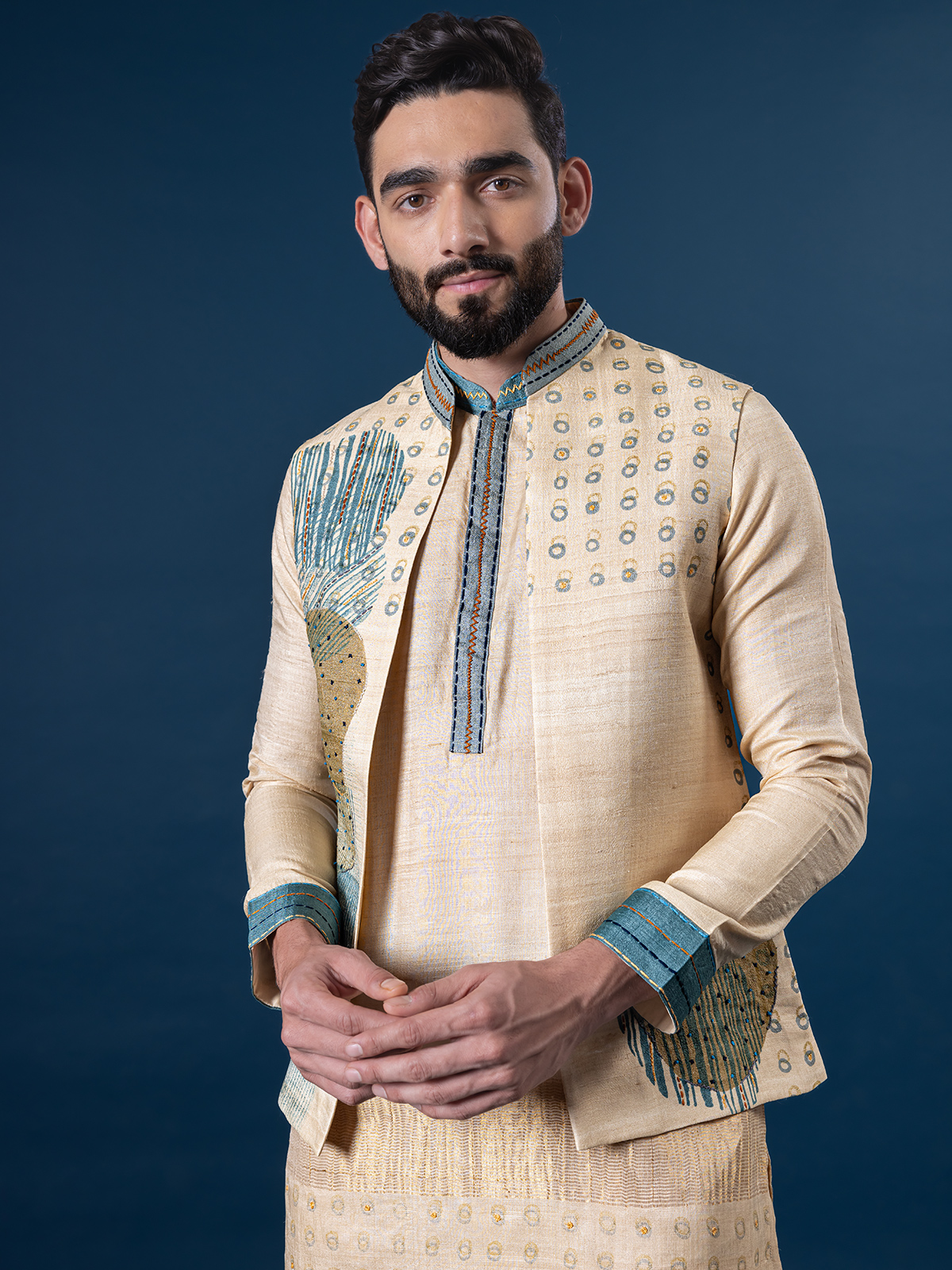 This cream waistcoat set is a sophisticated and excellent option that is ideal for special events. It is embellished with lovely thread and printed details and is made from raw silk fabric. It provides a refined appearance for gatherings and weddings when paired with a matching bottom.