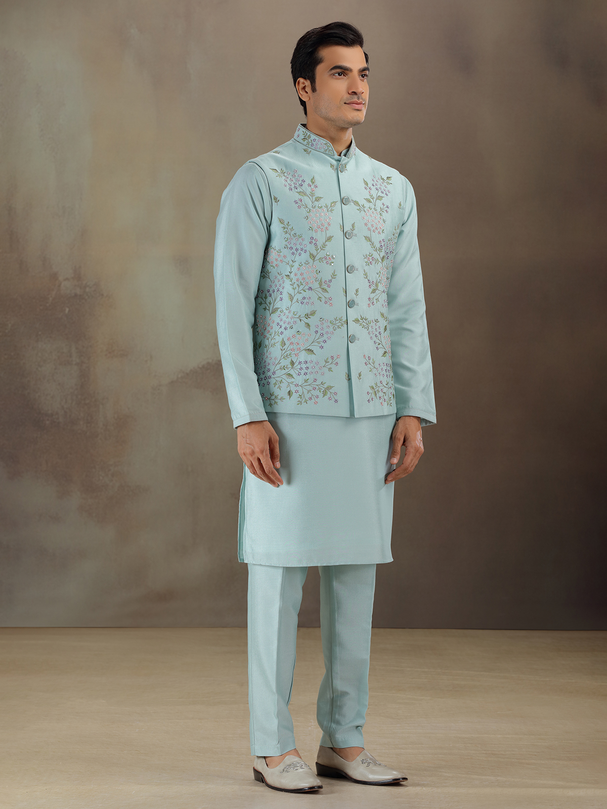 A celestial sky blue silk waistcoat set is designed to give you a ccol and dashing appeal in your celebration, adorned with embroidery, sequins, beads, and mirror work. The sleeveless waistcoat and chinese-collared full-sleeve kurta merge charm with luxury. Paired with pant, it is perfect for wedding soirées under soft lights.