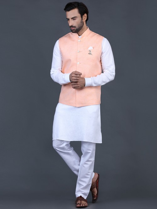 Upgrade your ethnic wardrobe with this solid orange linen party wear waistcoat set, featuring a stand collar, full button placket, sleeveless design, and vented hem. Comes with a kurta suit for a complete look.