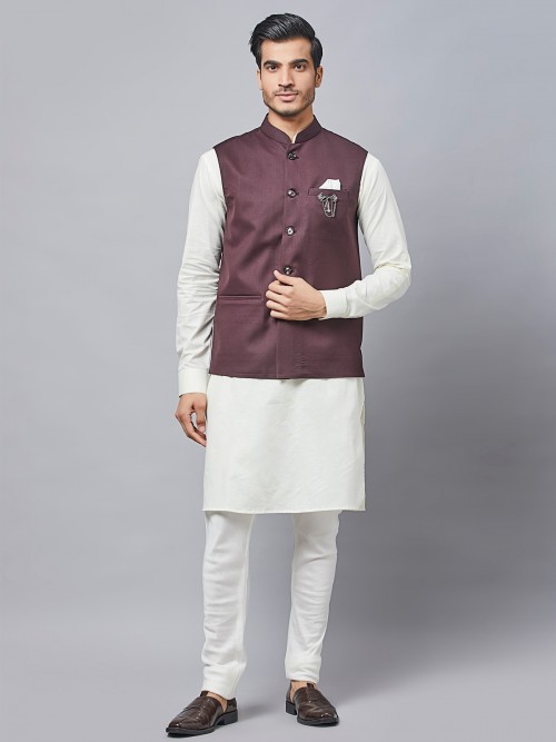 Add a touch of sophistication to your wardrobe with this solid purple cotton waistcoat set for men. Featuring a stand collar, full button placket, sleeveless design, and vented hem, this set is perfect for any special event. Paired with a kurta suit, it is the ideal ethnic collection for any fashion forward gentleman.