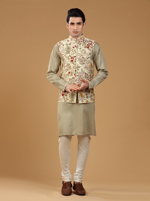 Elevate your wedding style with our timeless beige silk waistcoat set, adorned with beautiful embroidered and resham work. The set features a mandarin collar and sleeveless pattern, and comes with a full sleeves kurta and bottom.