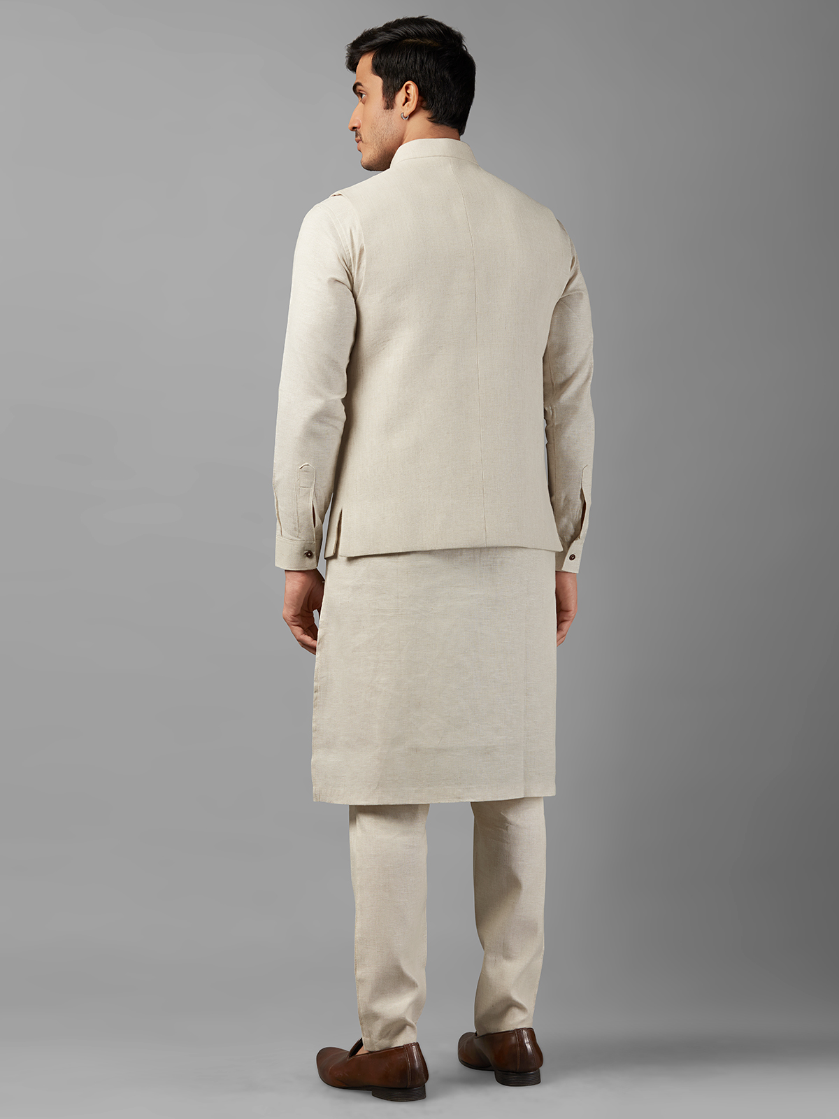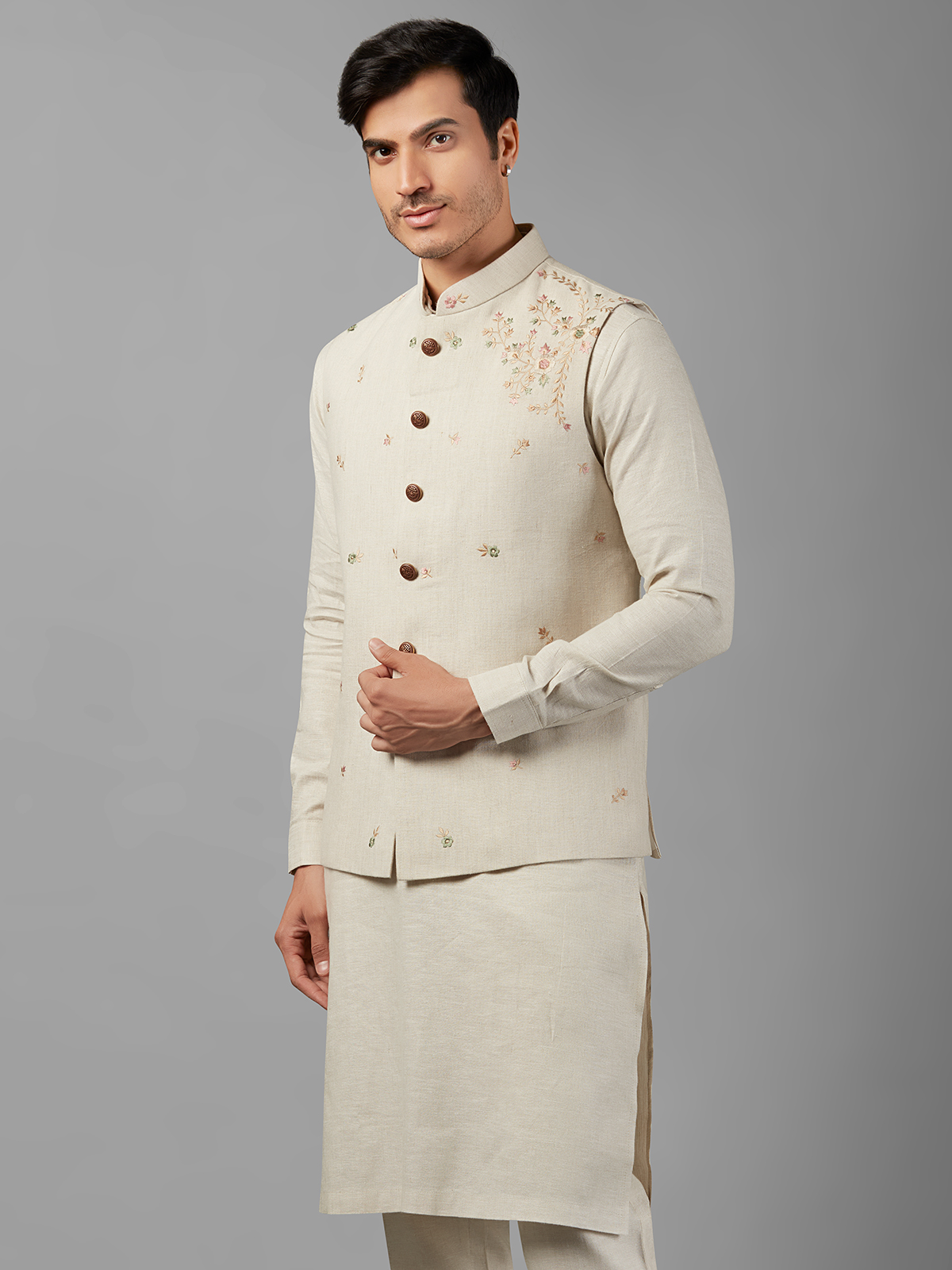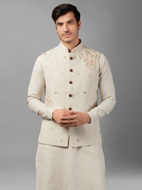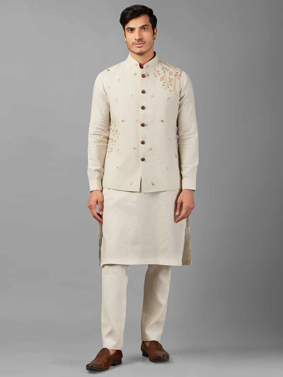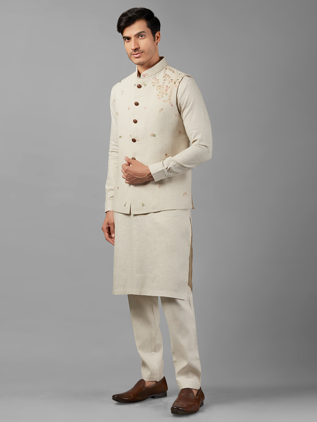 Elevate your style with our cream linen waistcoat set featuring eye-catching floral embroidery work. This set exudes elegance and comes with a coordinating bottom for a complete ensemble.