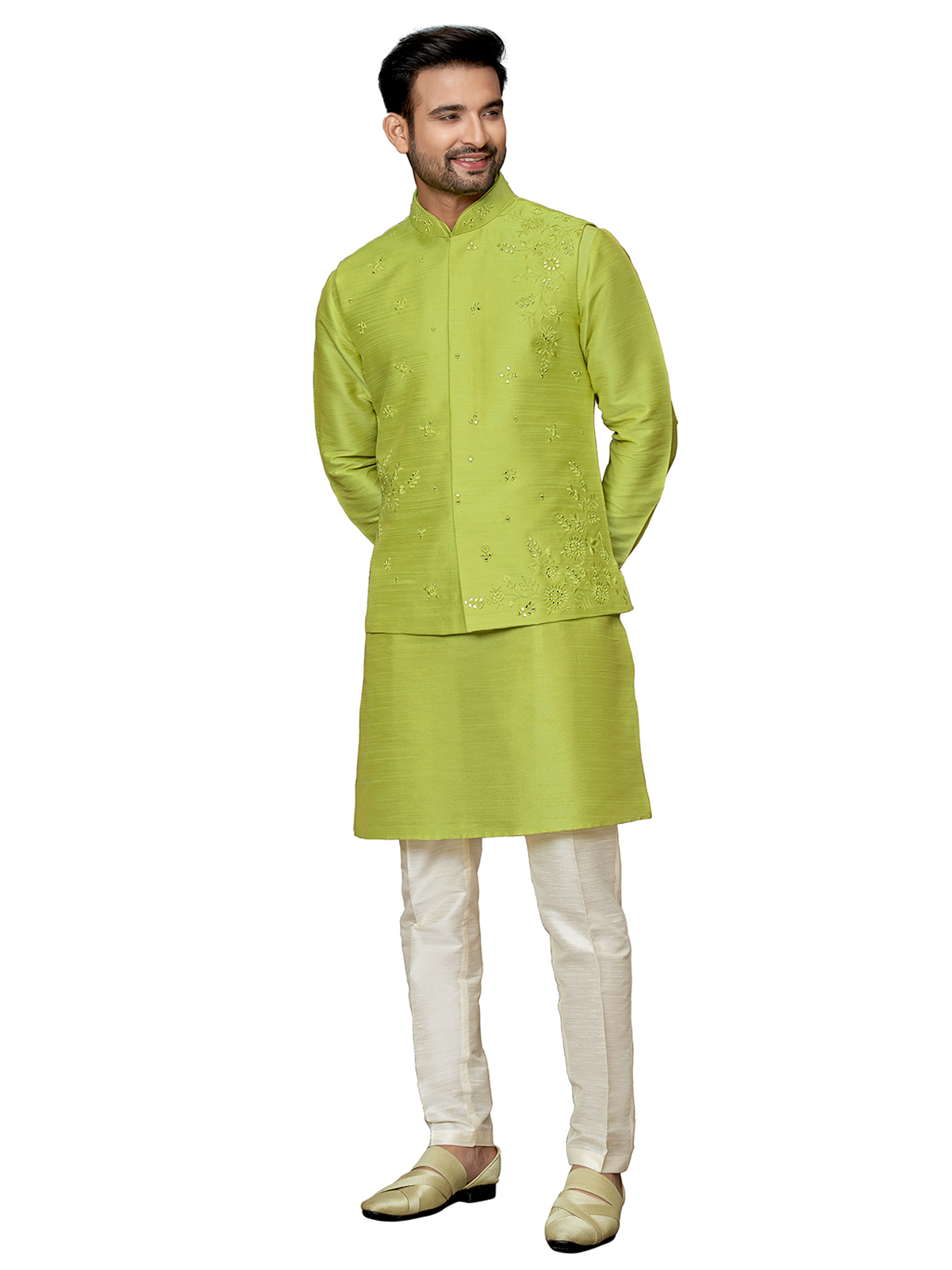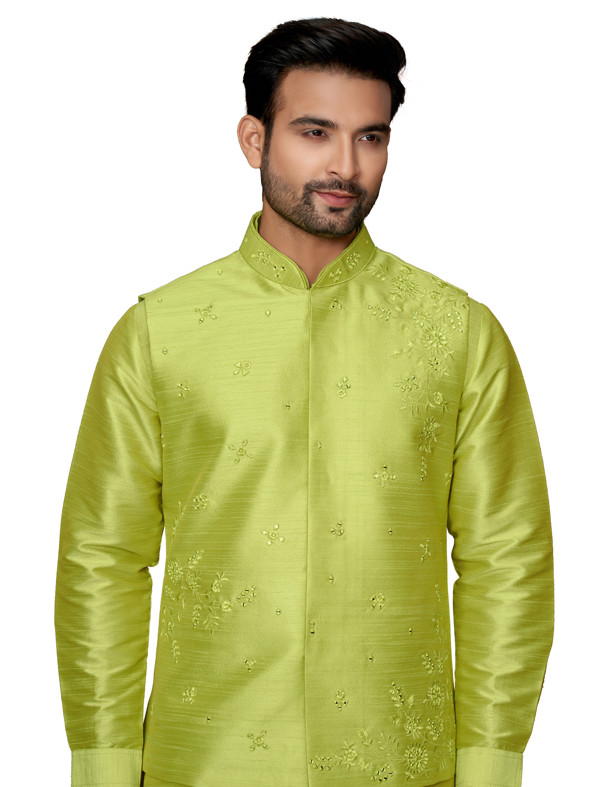 Make a statement with this stylish lime green waistcoat set made of premium silk fabric that comes with a full sleeved kurta and bottom. This elegant ensemble is intricately embellished with mirror, embroidery, and resham work, while the mandarin collar adds a touch of sophistication and sparkle to your overall look.
