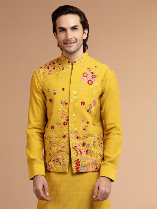 Make a stylish statement with our exquisite waistcoat set in a fabulous shade of mustard yellow silk. Embellished with intricate embroidered resham work and featuring a sophisticated mandarin collar, this set is a true masterpiece. Complete with a full sleeved kurta and bottom.